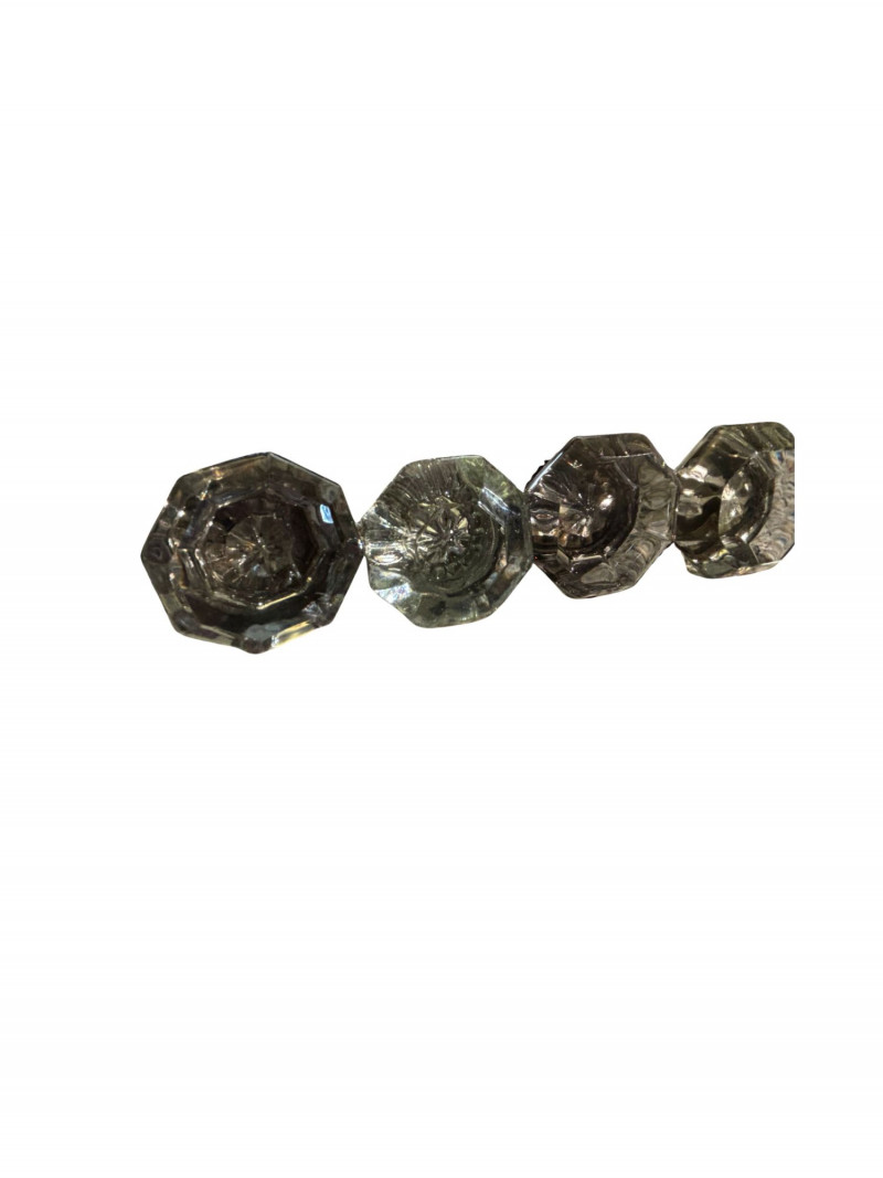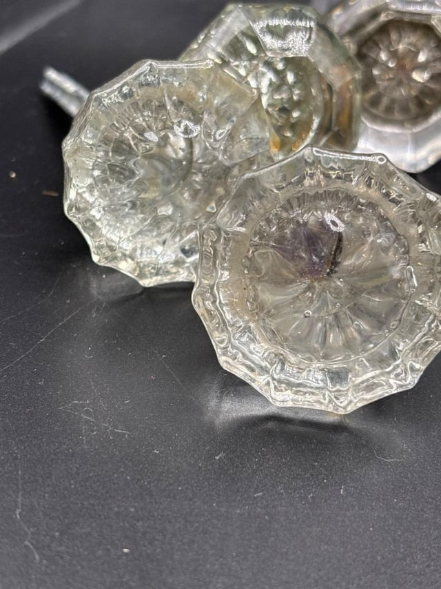 Elevate your home’s hardware with this exquisite 6-piece set of vintage cut-crystal style door knobs. These are not your standard glass pulls; each knob in this lot features a deep, multi-faceted cut designed specifically to catch and refract light, casting brilliant patterns across your walls and floors. These authentic vintage pieces offer the heavy, substantial feel and "prism effect" that defines high-end historical hardware. They are the perfect architectural accent for a Victorian, Edwardian, or Colonial-style restoration, or as a luxury upgrade for a modern custom build. Lot Features: Brilliant Light Refraction: Each of the 6 knobs is precision-cut to maximize sparkle and clarity. Classic Octagonal Design: The timeless geometric shape provides a comfortable grip and a sophisticated, high-end aesthetic. Durable Vintage Quality: These knobs feature the thickness and weight of genuine aged glass, far superior to lightweight modern plastic imitations. Condition: Beautiful vintage condition. The facets remain sharp and clear, showing only the minor, authentic character marks consistent with their age. Whether you are finishing a full home restoration or looking for the perfect "jewelry" for your doors, this 6-piece lot provides matching brilliance and lasting quality. Quantity: 6 Cut-Crystal Style Knobs Material: Heavy Glass / Faceted Crystal-style Finish: Clear with aged metal shanks Application: Ideal for interior doors, cabinetry, or upcycled decor projects. SHIPPABLE: Yes Please note: Shipping is charged separately from the auction. Once the auction invoice is paid, if you chose shipping, a second invoice for the exact shipping cost will be sent to the winner. Combined shipping is available for winners of multiple shippable lots.