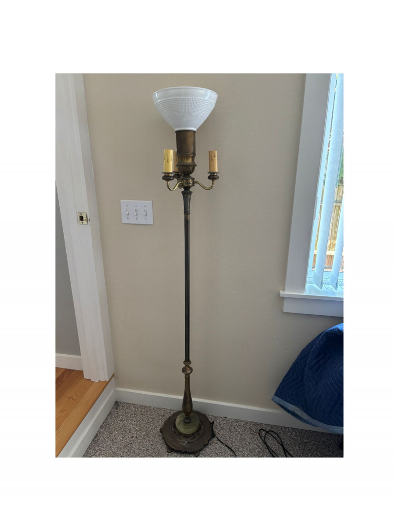 Add timeless elegance and warm ambient lighting to your space with this classic vintage torchiere floor lamp. Featuring a beautiful frosted glass uplight shade and two decorative side arms, this piece delivers both function and old-world charm. The rich brass-toned finish and traditional detailing give it a stately presence, while the upward-facing torchiere casts a soft, inviting glow—perfect for living rooms, reading corners, or creating cozy atmosphere in any space. The dual side lights add both visual balance and additional lighting options. ✨ Why You’ll Love It: This is a beautiful statement piece that brings both height and warmth to a room—ideal for homeowners, decorators, or Airbnb setups. Good vintage condition with visible wear consistent with age. Some patina and surface wear to the metal base and body. Glass shade is intact. Untested, but appears complete. Please review photos carefully. No shipping available. Local pickup only.