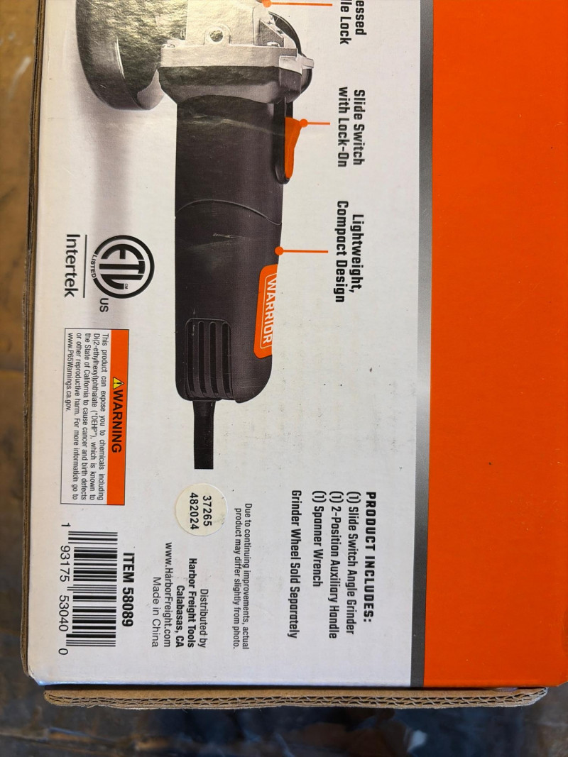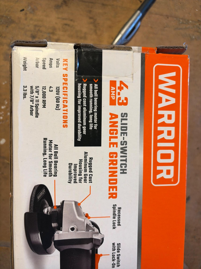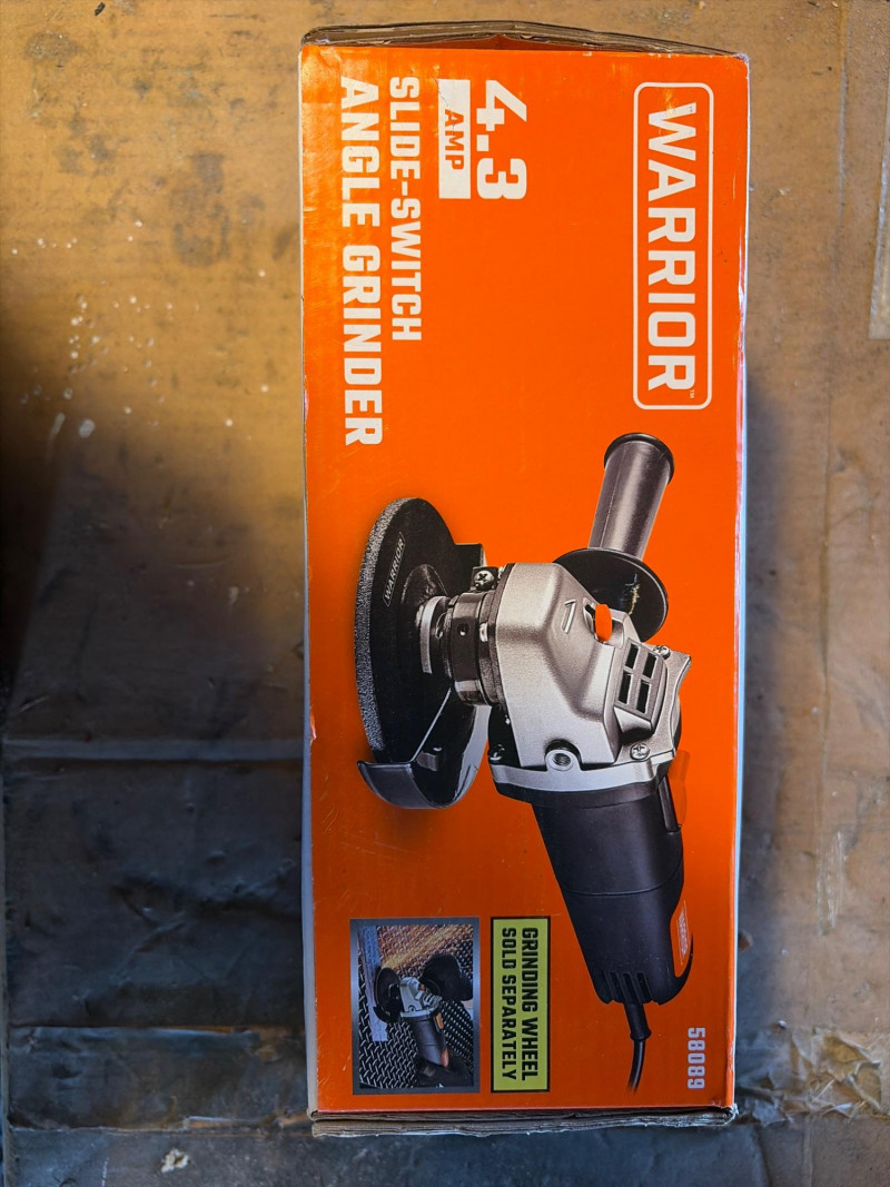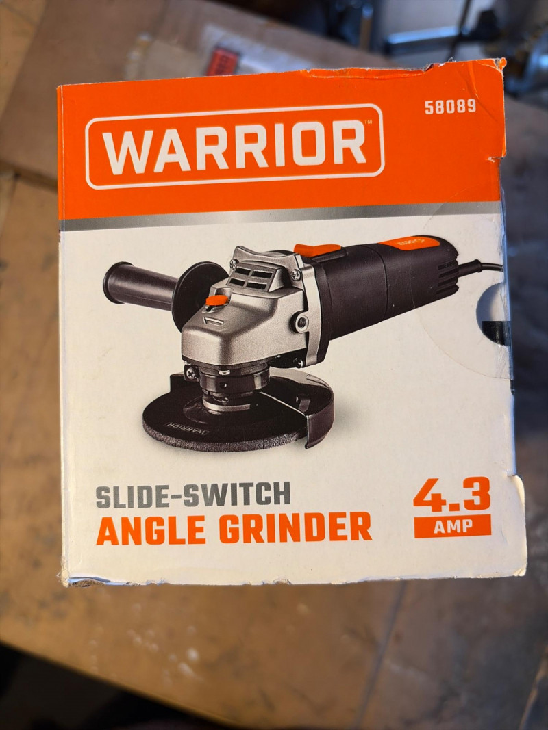 A compact and reliable Warrior 4.3 Amp angle grinder, perfect for cutting, grinding, and metalworking tasks. This unit features a convenient slide-switch design for easy operation and control during extended use. Still in the original box and appears to be unused, making it a great find for anyone looking to add a grinder to their shop or tool collection. Key Features: Perfect for: Appears new in the box. Shows little to no signs of use. The box has light wear from storage. Untested. Please review the photos for full details. Shipping available. Combined shipping is offered when possible.