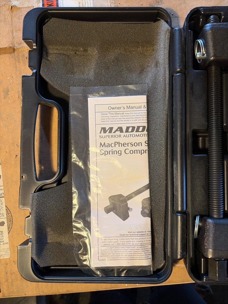 A durable and essential Maddox Spring Compressor Set (ME-41), designed for safely compressing coil springs during suspension work. A must-have tool for automotive repair, strut replacement, and maintenance jobs. Comes in a sturdy molded carrying case to keep everything organized and protected. Key Features: Perfect for: Pre-owned. Comes in original case. Shows light wear from storage and/or use. Untested. Please review the photos for full details and contents. Shipping available. Combined shipping is offered when possible.