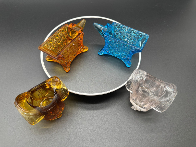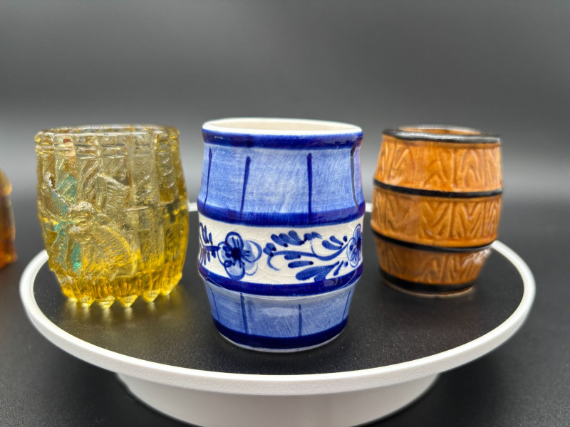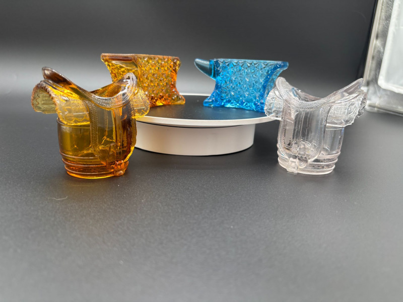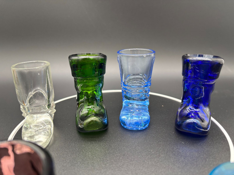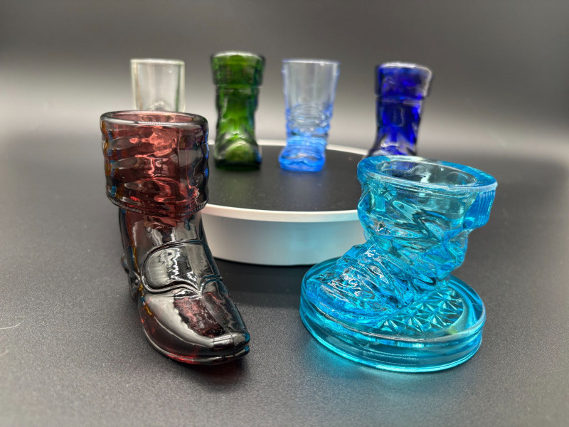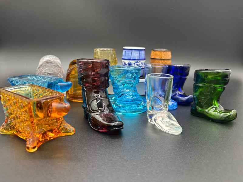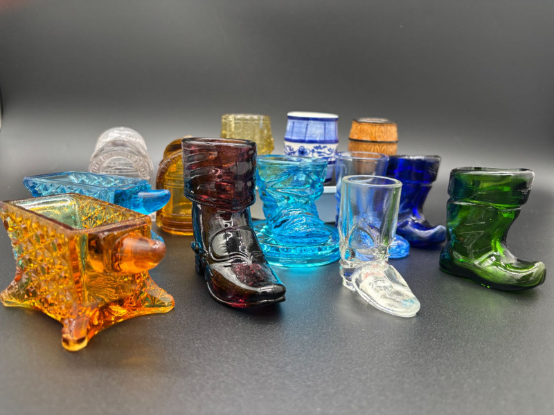 CAN BE SHIPPED Add a pop of vintage charm to your table with this delightful collection of 13 glass toothpick holders! This colorful assortment features whimsical boot shapes, a miniature barrel, and beautifully textured pressed glass designs in vibrant shades of amber, cobalt blue, emerald green, ruby, clear, and aqua. Each piece showcases unique detailing — from faceted patterns and molded boots to classic barrel styling — making them perfect for collectors of vintage glass, novelty tableware, or miniature decor. Whether displayed together as a charming collection or used individually for toothpicks, matches, or small trinkets, these little treasures bring personality and nostalgia to any setting. A fun mix for collectors, resellers, or anyone who loves unique vintage glass accents!