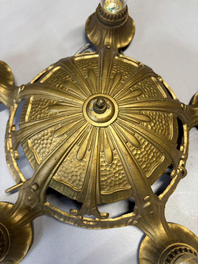 Beautiful vintage 5-light ceiling fixture with ornate embossed detailing and classic Art Deco influence. This fixture features a decorative, hammered dome center with radiating design and elegant, curved arms supporting five light sockets.