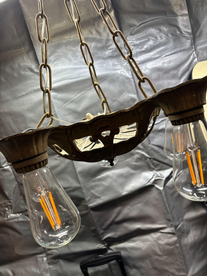 The fixture was professionally rewired in 2016 and has hung and remained fully functional in a 1933 farmhouse since. It is in working condition and includes bulbs as shown. The warm aged finish shows natural patina consistent with age, adding to its authentic vintage character. Perfect for a farmhouse, bungalow, craftsman, or period-inspired home. This statement ceiling light blends historic charm with modern wiring for everyday use. Pre-owned vintage condition with age-appropriate wear. Please review the photos for details.NO SHIPPING