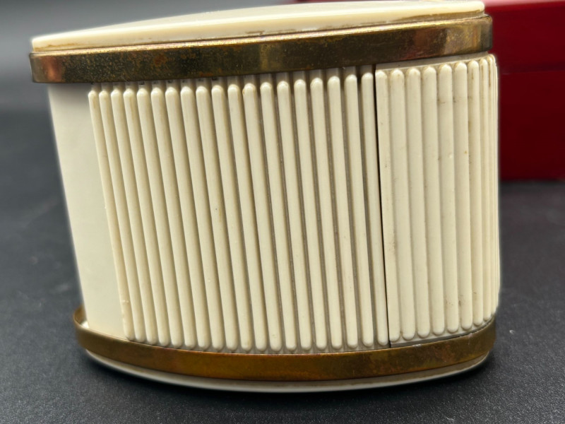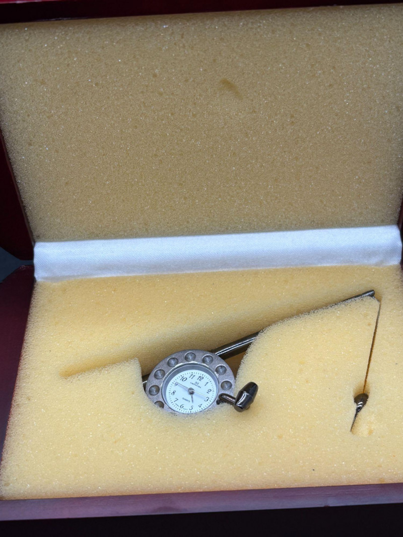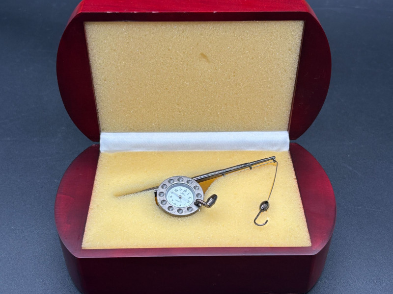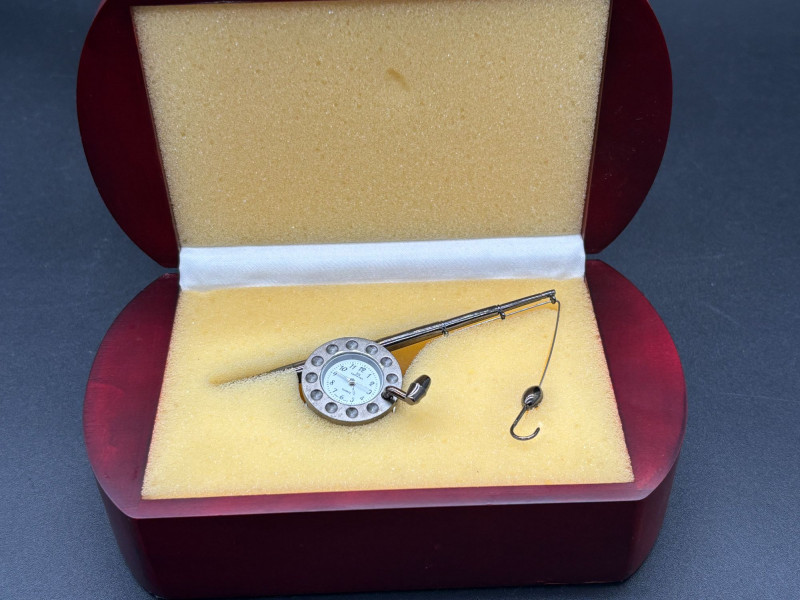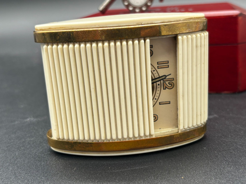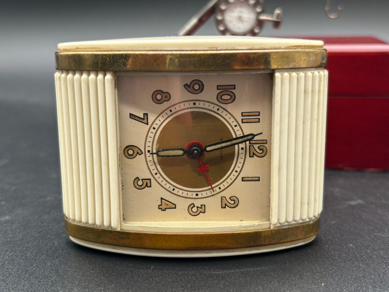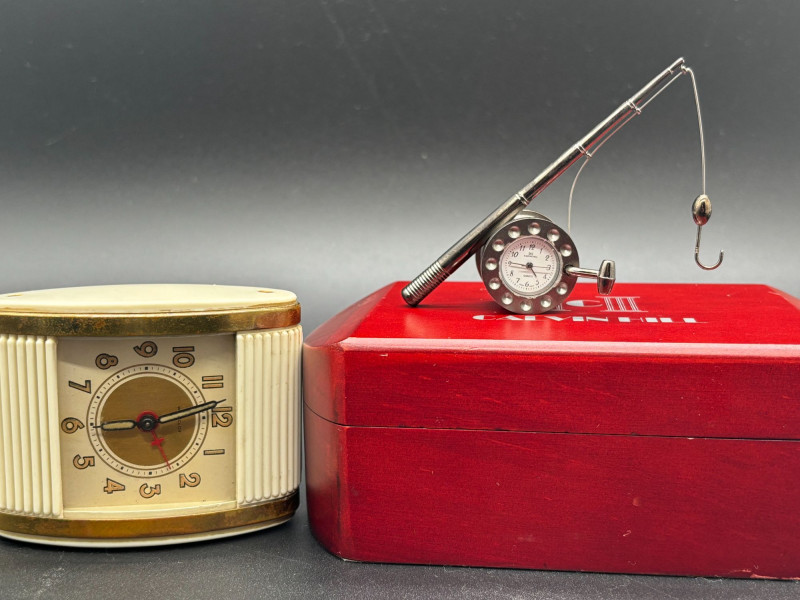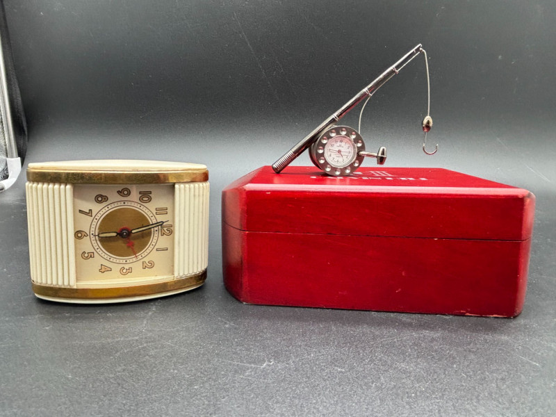 A fantastic vintage timepiece duo! This lot features two unique and collectible clocks — perfect for display, gifting, or adding retro charm to your space. A standout novelty desk clock featuring a detailed miniature fishing rod and hook design. The round clock face resembles a reel, making it a perfect conversation piece for any angler or collector. Calvin Hill branded Unique fishing rod design Includes original red presentation box Great man cave, office, or cabin décor Classic mid-century style travel alarm clock with: Cream ribbed sides Brass-tone trim Easy-to-read dial Compact portable design Perfect for collectors of vintage timepieces or retro décor lovers. Both clocks appear in good vintage condition. Cosmetic wear consistent with age. Untested beyond visual inspection (sell as-is; see photos).Shippable