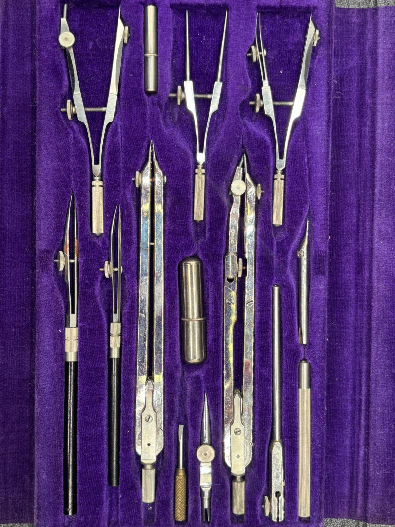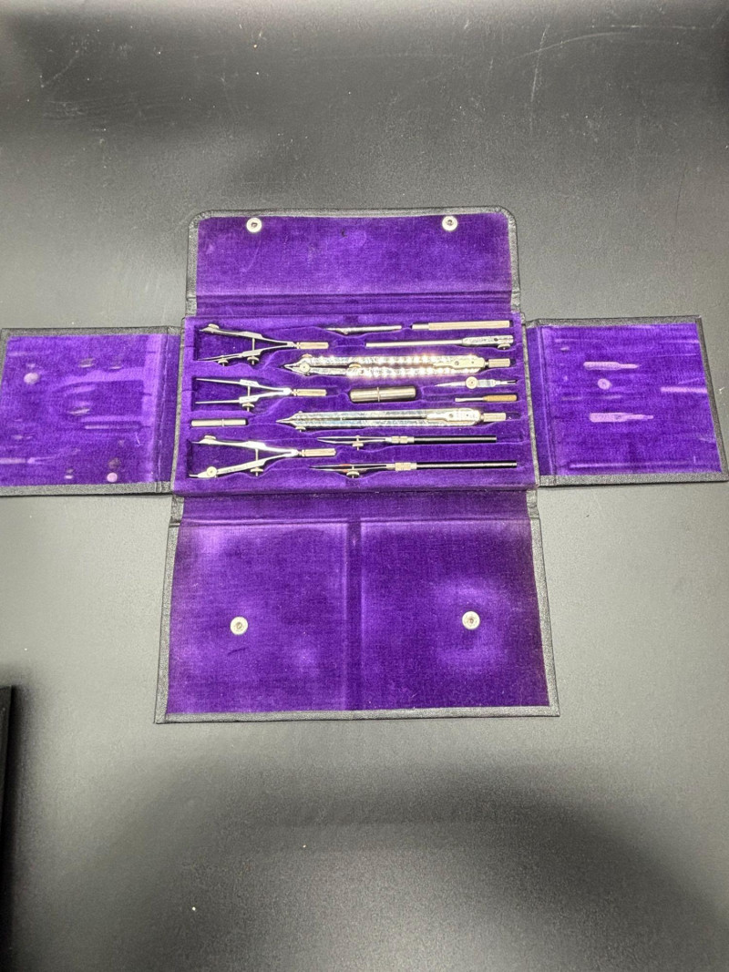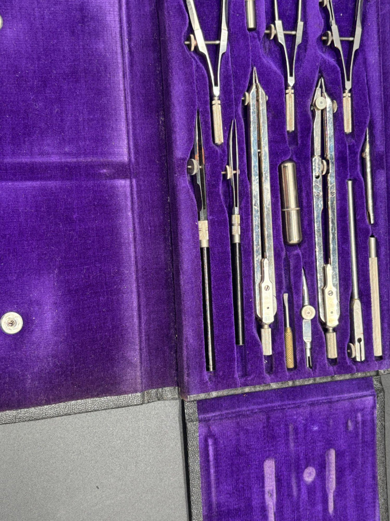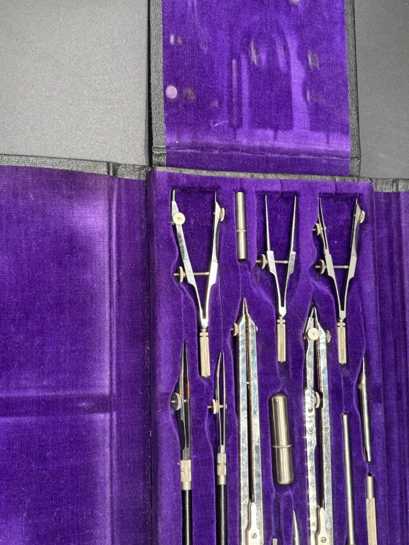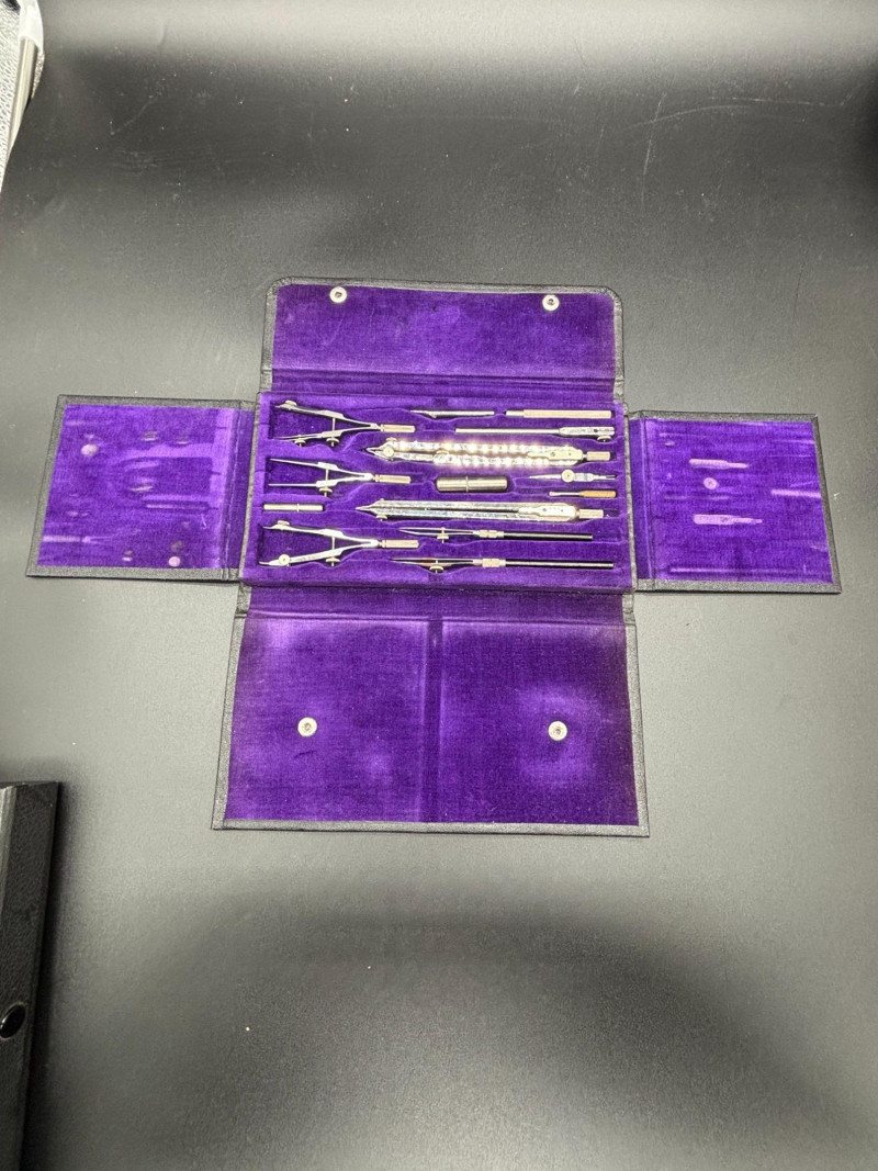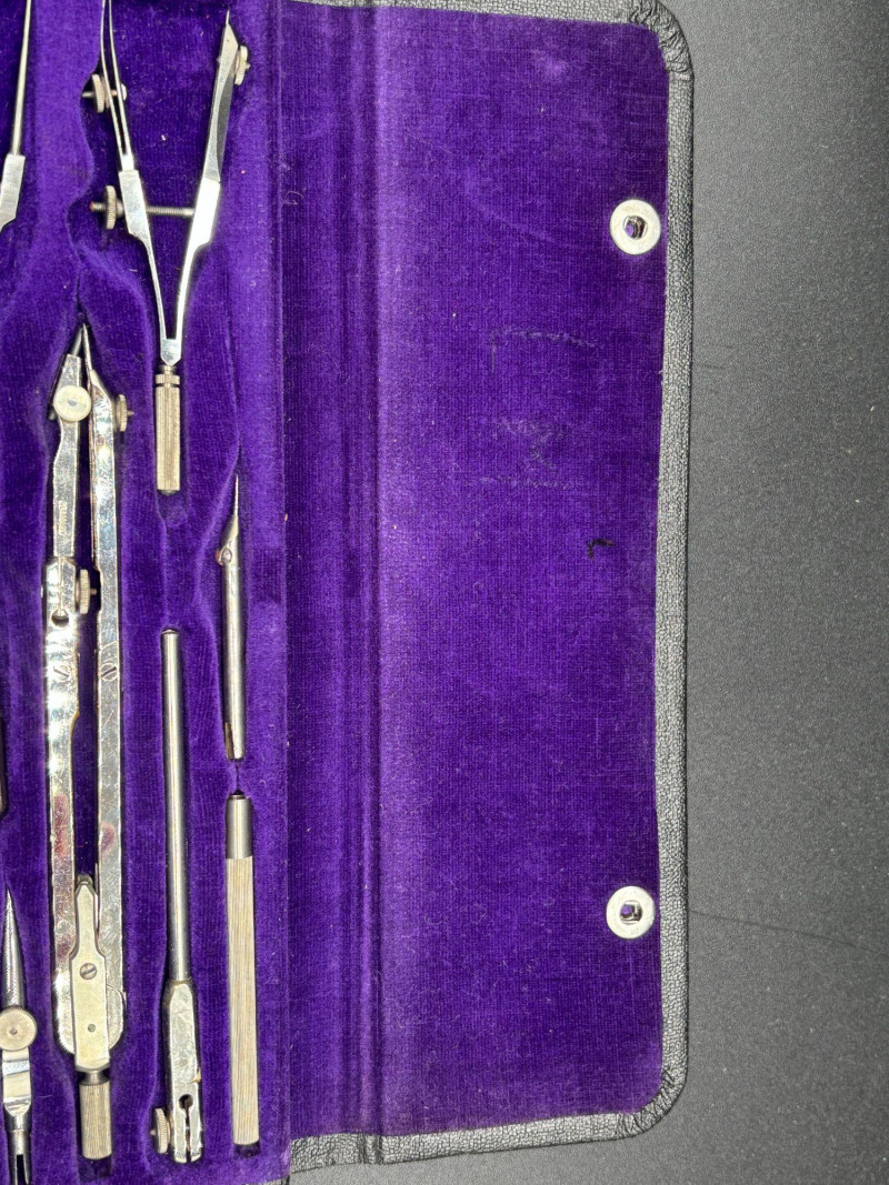 This vintage Friedmann Germany drafting and geometry set comes housed in its original black case with rich purple velvet interior. A beautiful and functional piece of engineering history. The set includes multiple precision tools, such as: Compasses Dividers Extension bars Technical pens Ruling tools Lead holders and accessories Marked Friedmann, Germany, is known for producing high-quality drafting instruments used by architects, engineers, designers, and students. Whether you’re: — This is a display-worthy and usable set. Good vintage condition. Tools appear well-preserved and neatly stored in the original fitted case. Some light age-related wear consistent with vintage drafting instruments. A wonderful blend of function and nostalgia Shippable