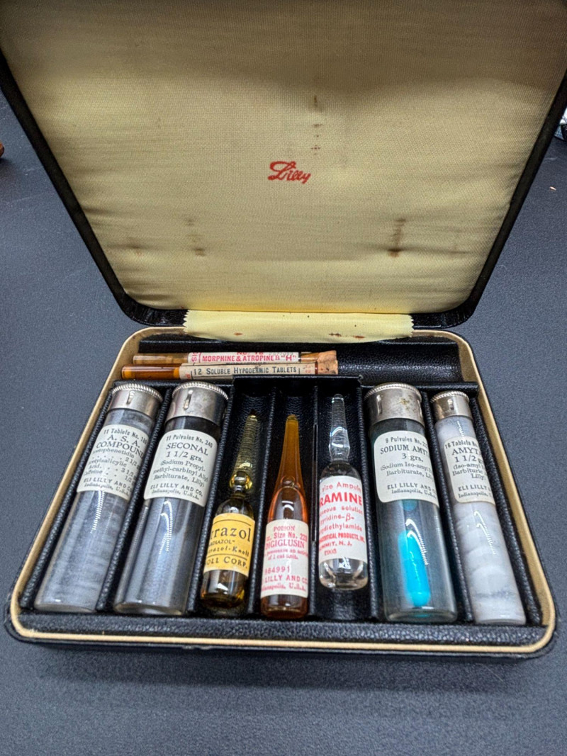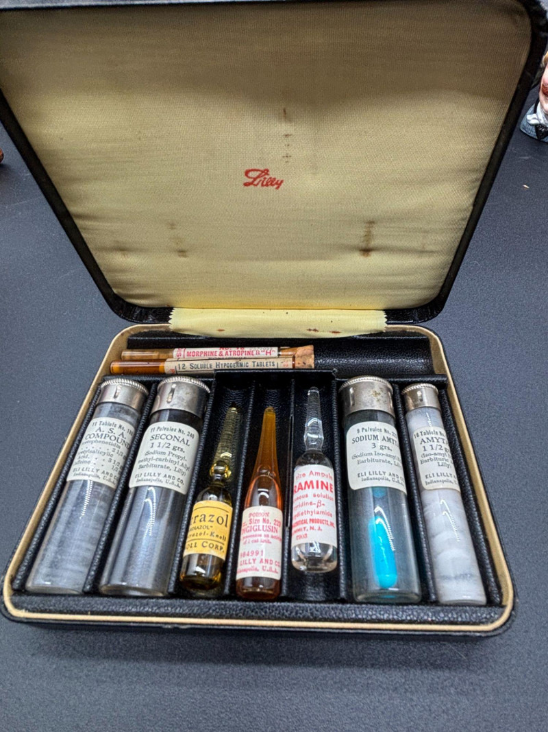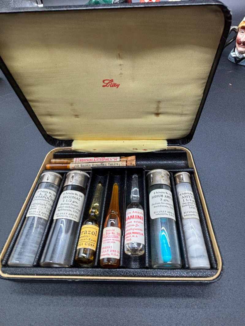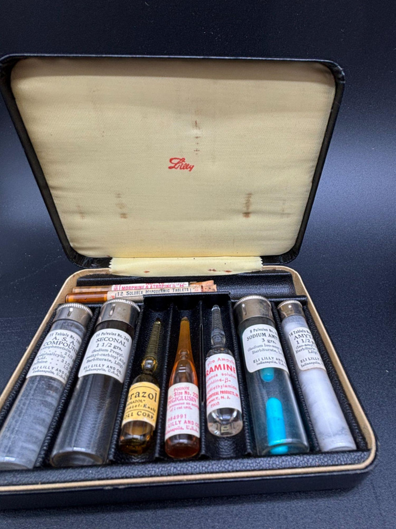 Step into early American pharmaceutical history with this vintage Eli Lilly & Co. salesman’s sample kit, a remarkable piece of medical memorabilia dating to the early-to-mid 20th century. Housed in its original black textured carrying case with branded interior, this kit was used by pharmaceutical representatives to present medications directly to physicians during office visits and house calls. It offers a fascinating glimpse into the evolution of medicine, marketing, and early drug distribution. • Original Eli Lilly branded case The interior retains its original layout and labeled contents, making this an exceptional medical history display piece. Items from Eli Lilly & Co., one of America’s most recognized pharmaceutical manufacturers, are highly collectible among medical, pharmacy, and advertising history enthusiasts. Salesman sample kits are especially desirable because they represent the intersection of: This kit makes a striking display item for: The case shows expected vintage wear consistent with age. Original contents remain present. Please review all photos carefully for details and condition. This lot is being sold strictly as a vintage collectible display item only. Contents are original and not intended for use or consumption.Shippable