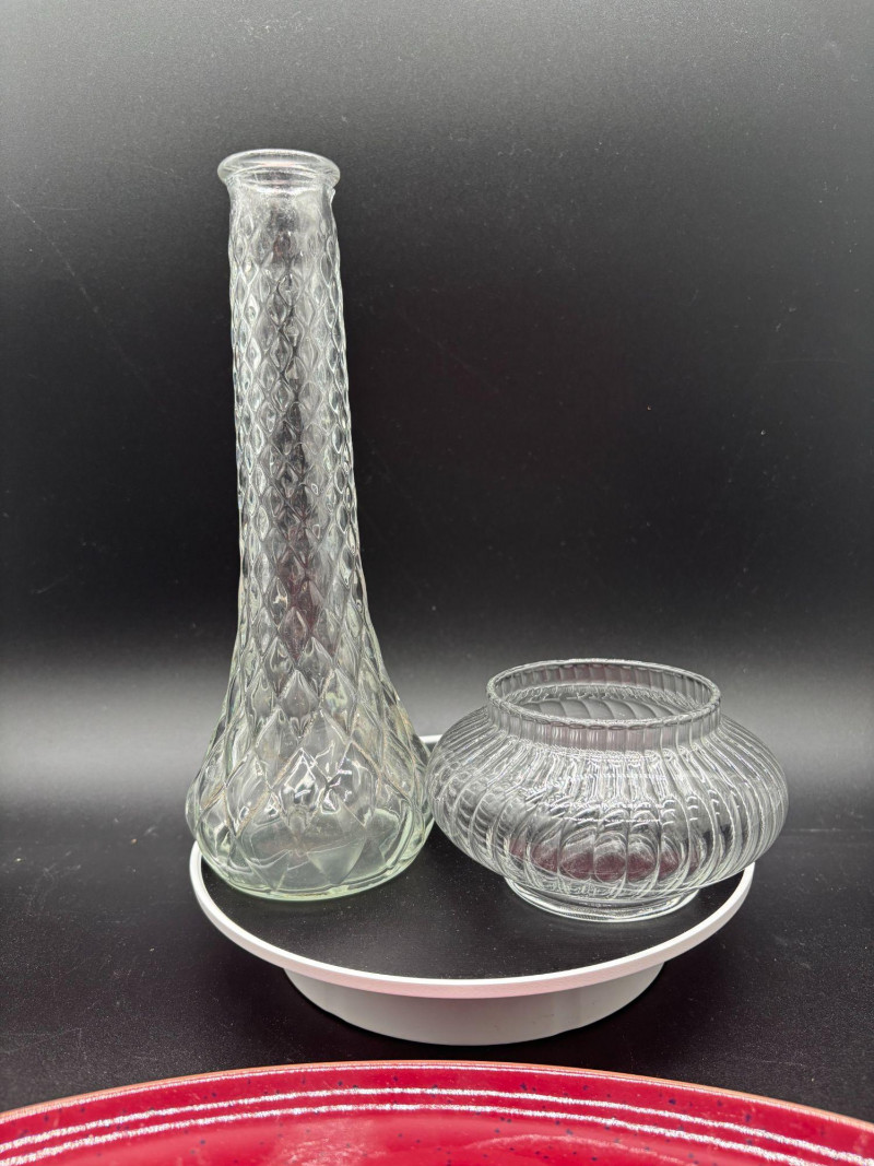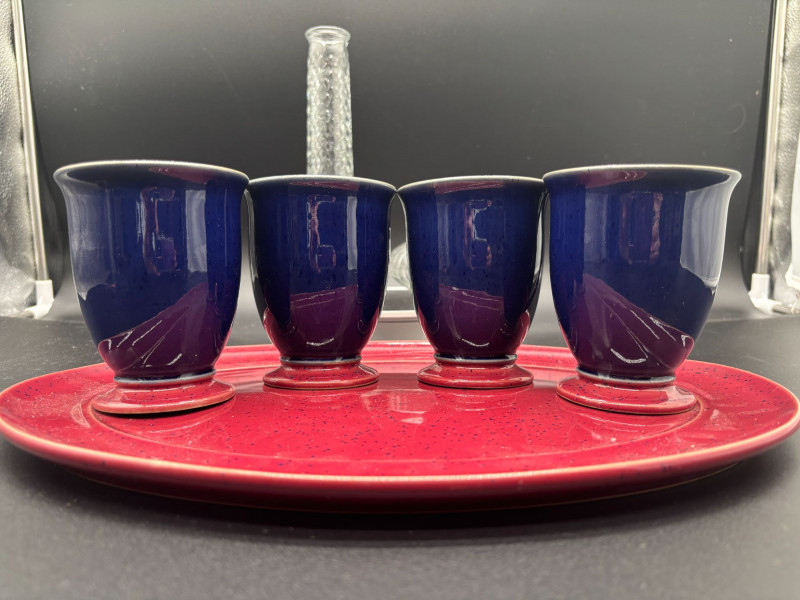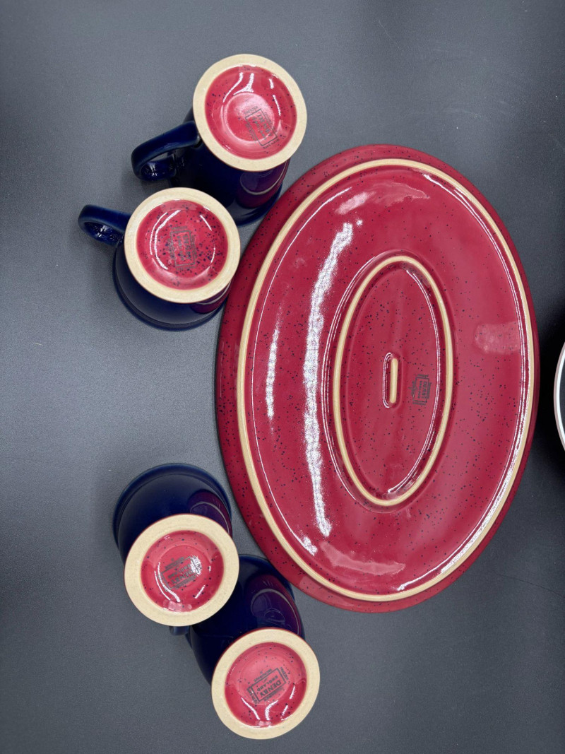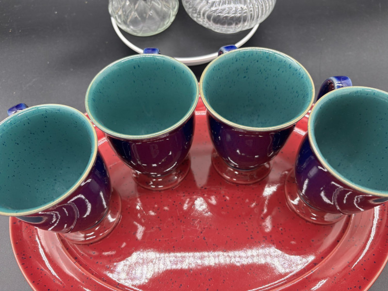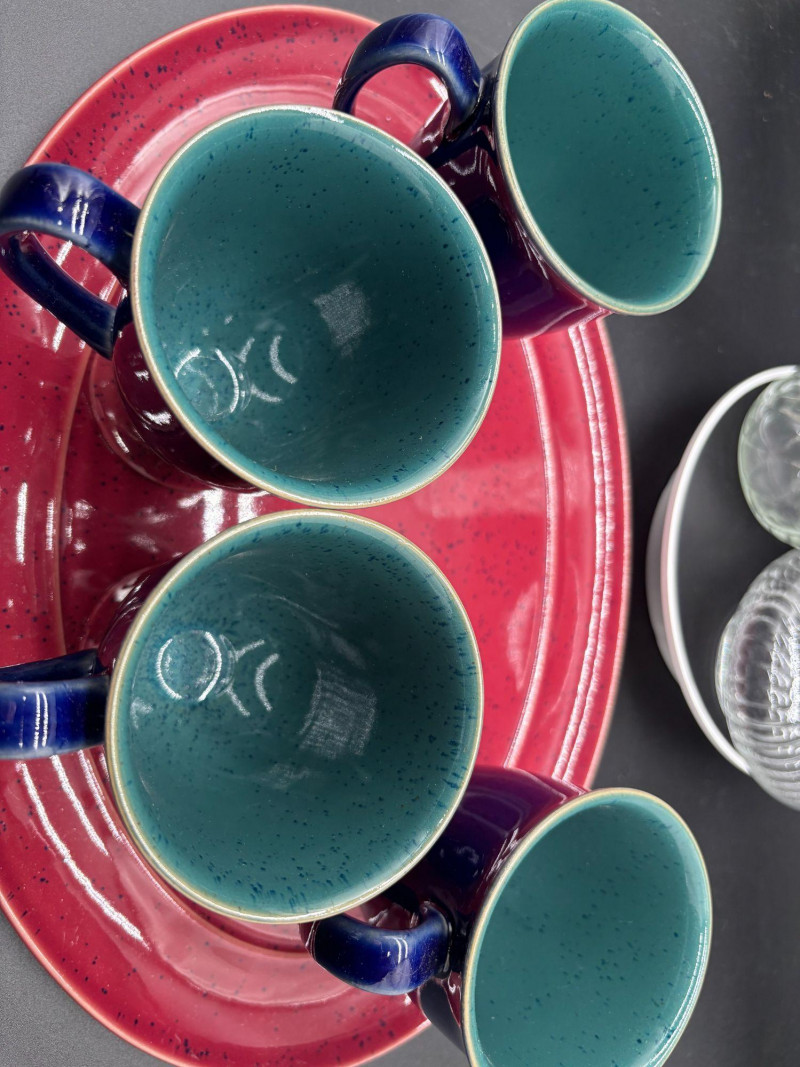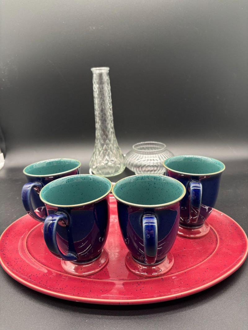 This versatile grouping includes: • 4 deep cobalt blue ceramic mugs The mugs feature a rich, glossy cobalt finish with sturdy handles and pedestal bases. The vibrant red speckled platter adds rustic farmhouse charm and creates a striking color contrast. The tall textured glass vase is perfect for fresh flowers, dried stems, or seasonal décor. The ribbed glass votive holder adds soft candlelight to complete the look. This set works beautifully for: ✔ Coffee & dessert service Imagine serving drinks in the cobalt mugs, appetizers on the red platter, fresh flowers in the vase, and a candle glowing beside it — a complete tablescape in one lot. All pieces are in very nice pre-owned condition. No major chips or cracks observed. Light wear consistent with normal use. Please review all photos carefully. A ready-to-style entertaining bundle that combines bold color with classic glass accents.Shipping