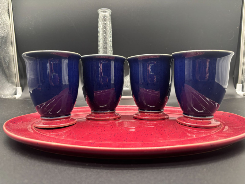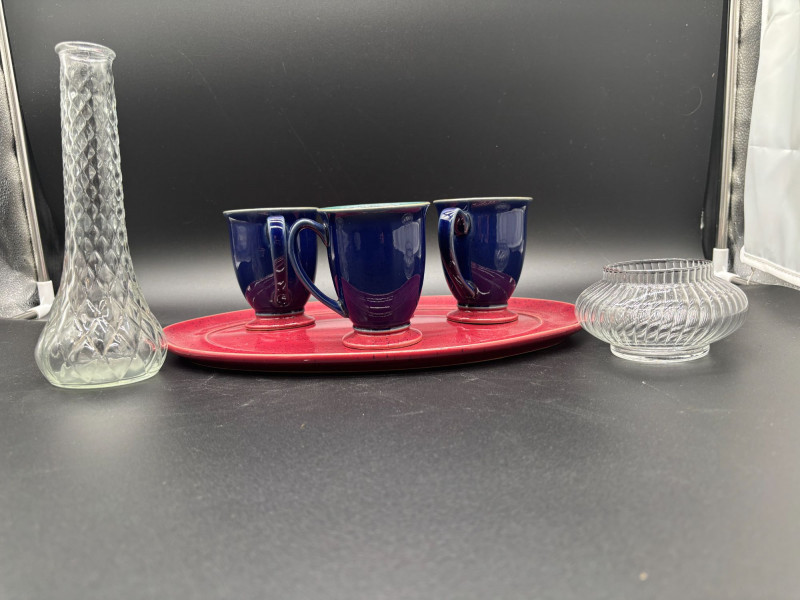 Lot # 10 - Cobalt Mugs, Red Platter, Glass Vase & Votive Holder