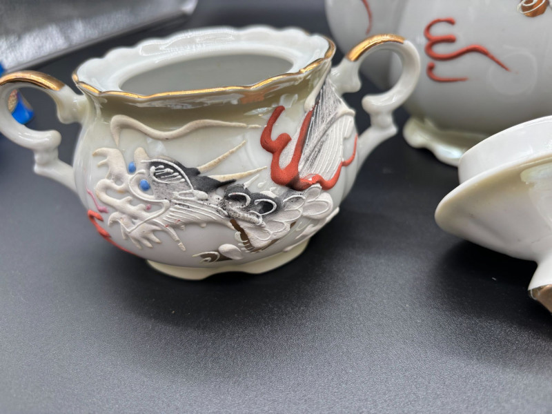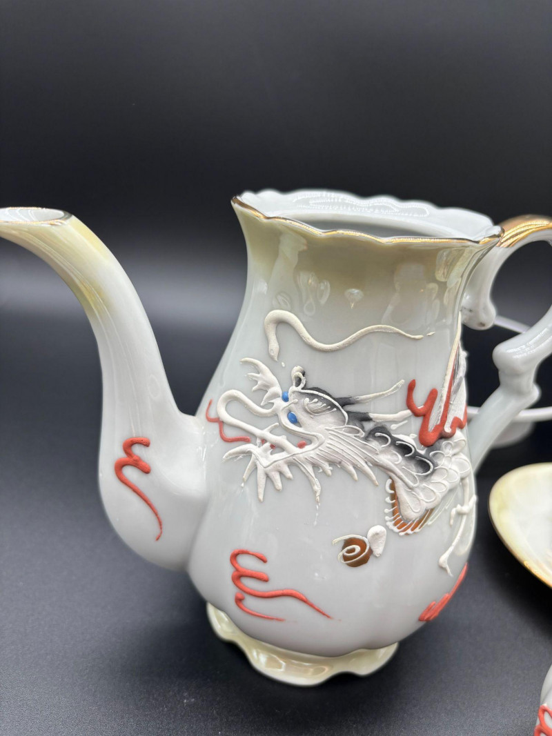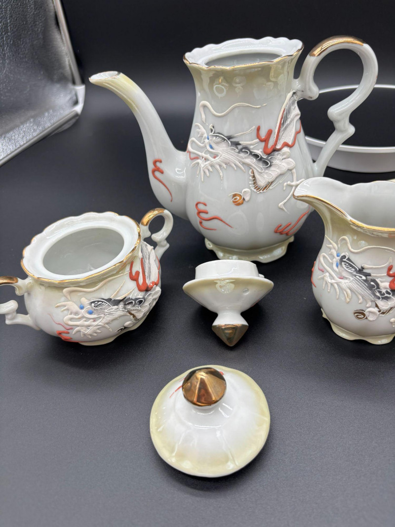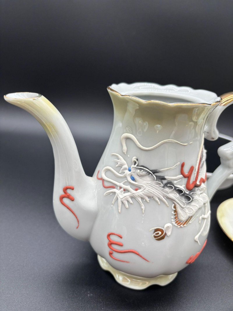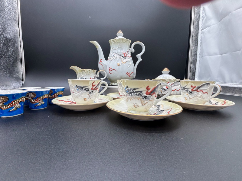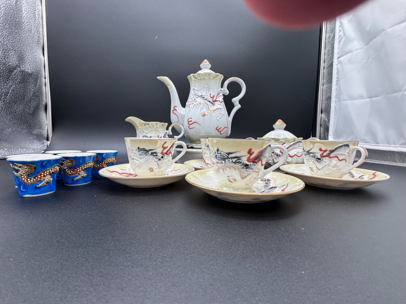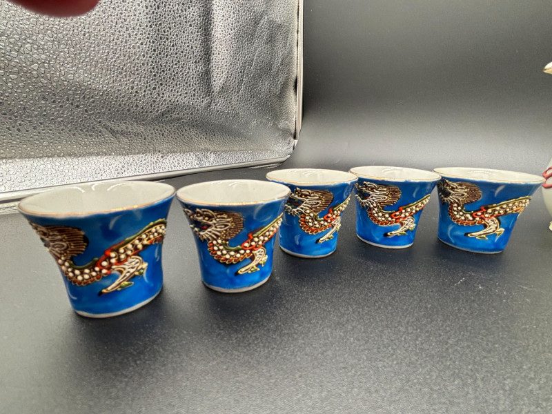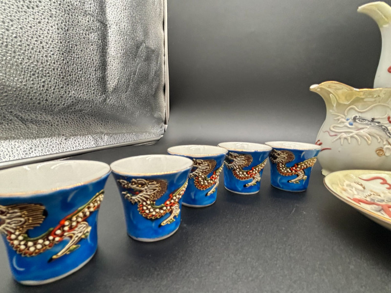 CAN BE SHIPPED Offered as a single lot is a beautiful collection of vintage Japanese dragonware porcelain, including a full tea service and a matching set of lithophane sake cups. Tall lidded teapot with applied moriage dragon Lidded sugar bowl Creamer Five (5) teacups Five (5) matching saucers Each piece features raised moriage dragons with detailed hand-applied decoration, highlighted with gold accents and red enamel detailing. The dimensional dragons wrap dramatically around the pieces' bodies, adding strong texture and presence. The set displays a soft celadon/ivory glaze with gilded rims. Five (5) cobalt blue cups Each cup features a raised dragon exterior Lithophane geisha image is visible when held to the light The sake cups are richly colored in deep cobalt with detailed dragon designs and traditional lithophane portrait bases. One cup has a small chip on the bottom. No major chips or cracks observed, just small chip on one sake cup bottom. Some light wear consistent with age Minor gilt wear in areas Overall displays beautifully This is a wonderful decorative and collectible lot, perfect for display, entertaining, or adding to a Japanese porcelain collection.π« Dragonware Tea Set Includes: