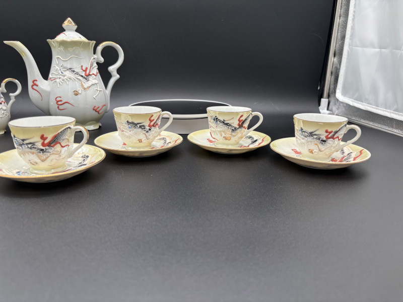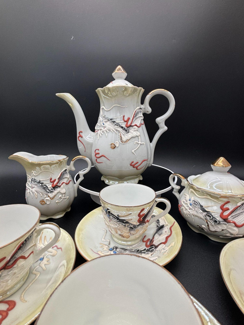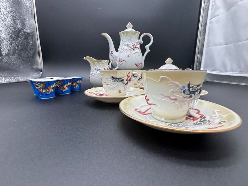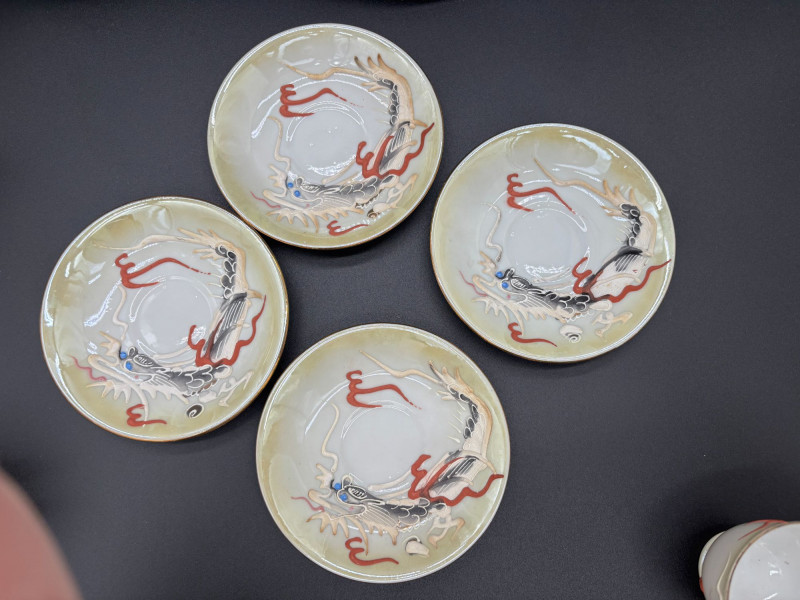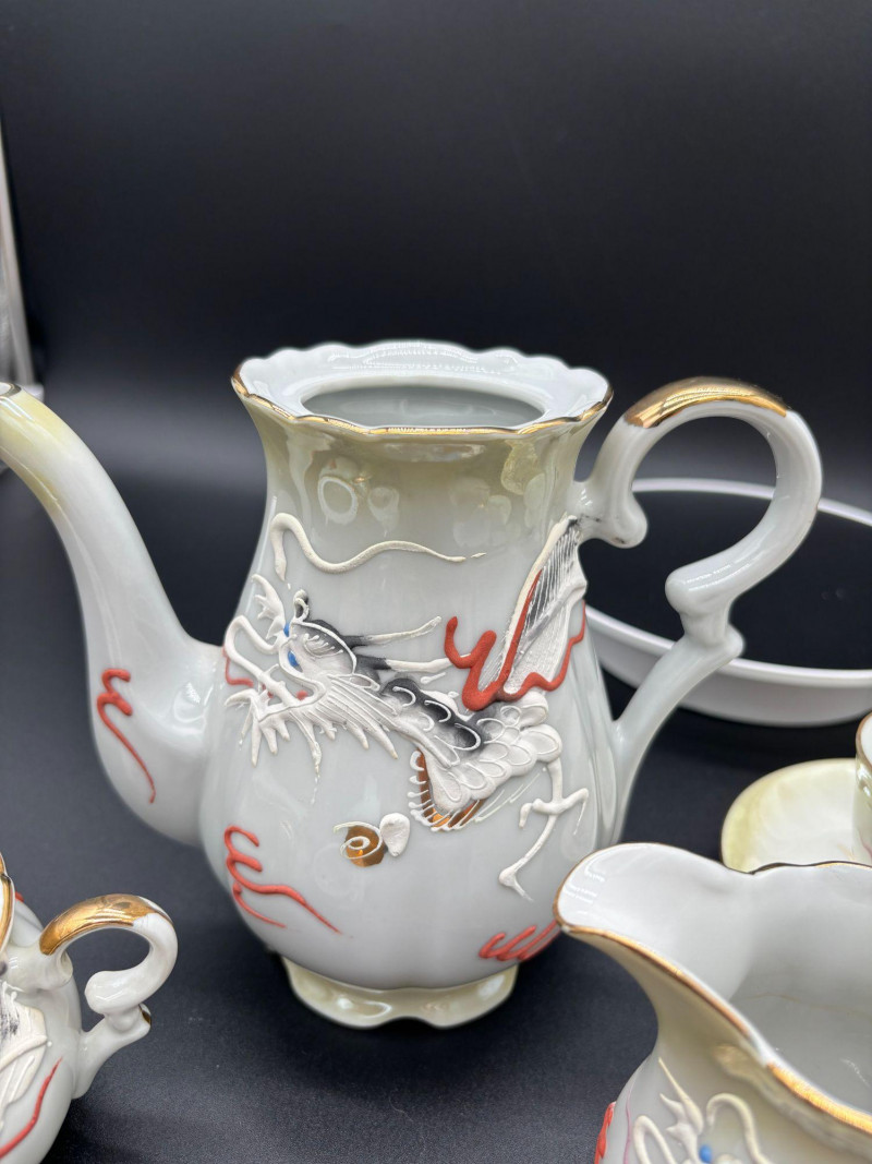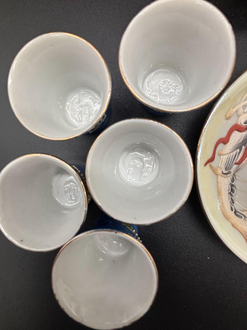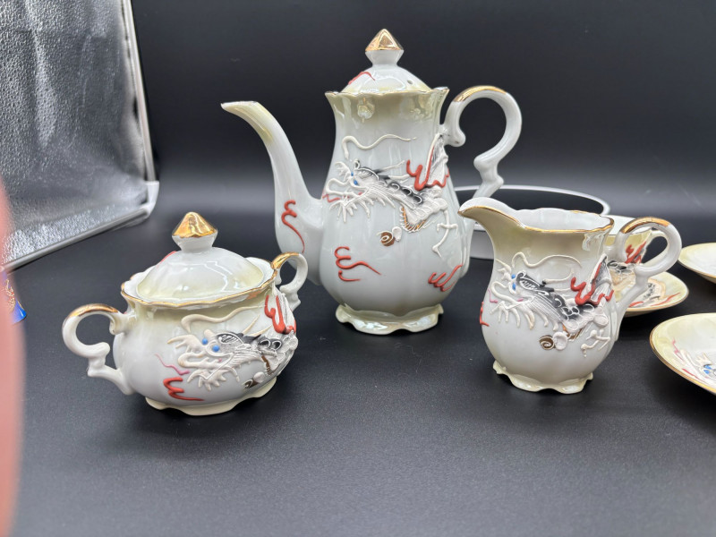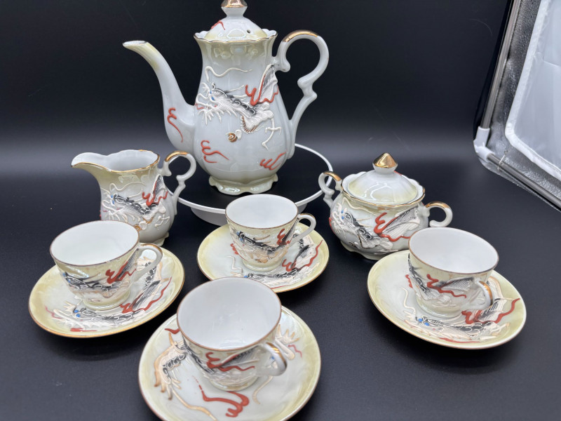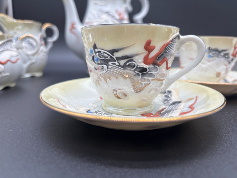 CAN BE SHIPPED Offered as a single lot is a beautiful collection of vintage Japanese dragonware porcelain, including a full tea service and a matching set of lithophane sake cups. Tall lidded teapot with applied moriage dragon Lidded sugar bowl Creamer Five (5) teacups Five (5) matching saucers Each piece features raised moriage dragons with detailed hand-applied decoration, highlighted with gold accents and red enamel detailing. The dimensional dragons wrap dramatically around the pieces' bodies, adding strong texture and presence. The set displays a soft celadon/ivory glaze with gilded rims. Five (5) cobalt blue cups Each cup features a raised dragon exterior Lithophane geisha image is visible when held to the light The sake cups are richly colored in deep cobalt with detailed dragon designs and traditional lithophane portrait bases. One cup has a small chip on the bottom. No major chips or cracks observed, just small chip on one sake cup bottom. Some light wear consistent with age Minor gilt wear in areas Overall displays beautifully This is a wonderful decorative and collectible lot, perfect for display, entertaining, or adding to a Japanese porcelain collection.π« Dragonware Tea Set Includes: