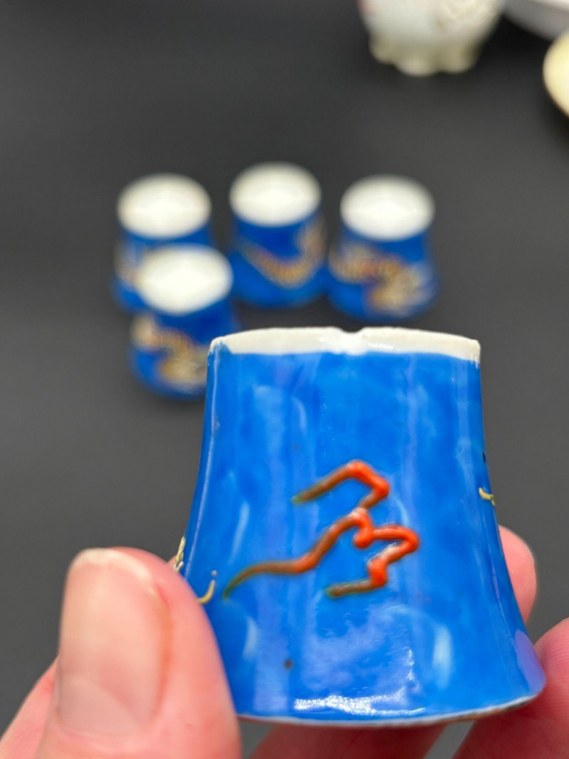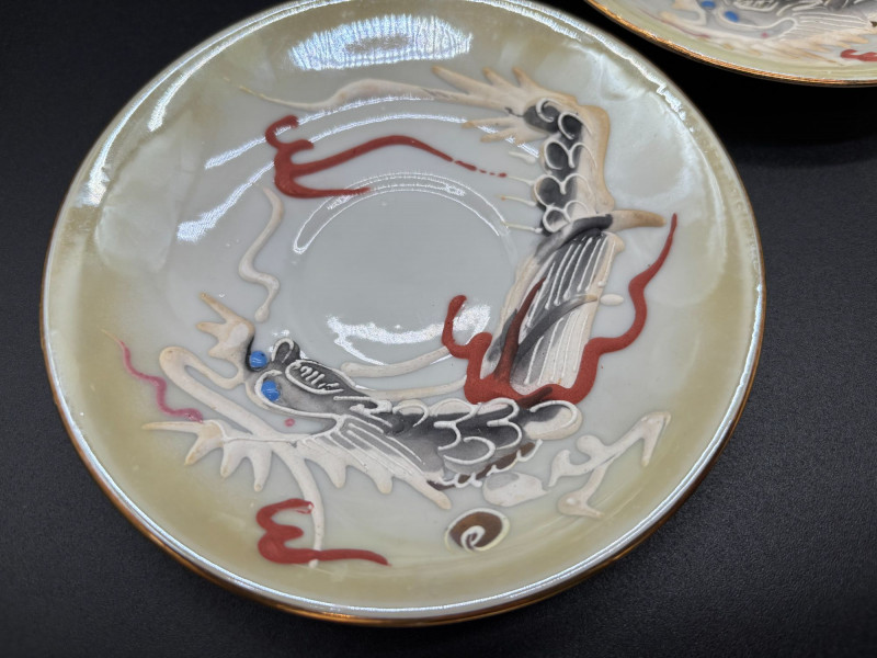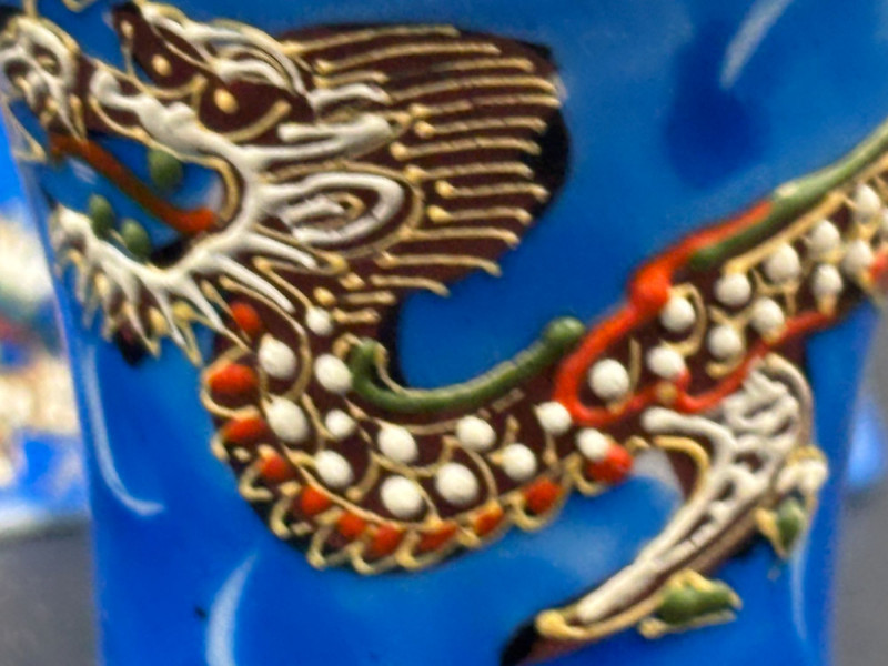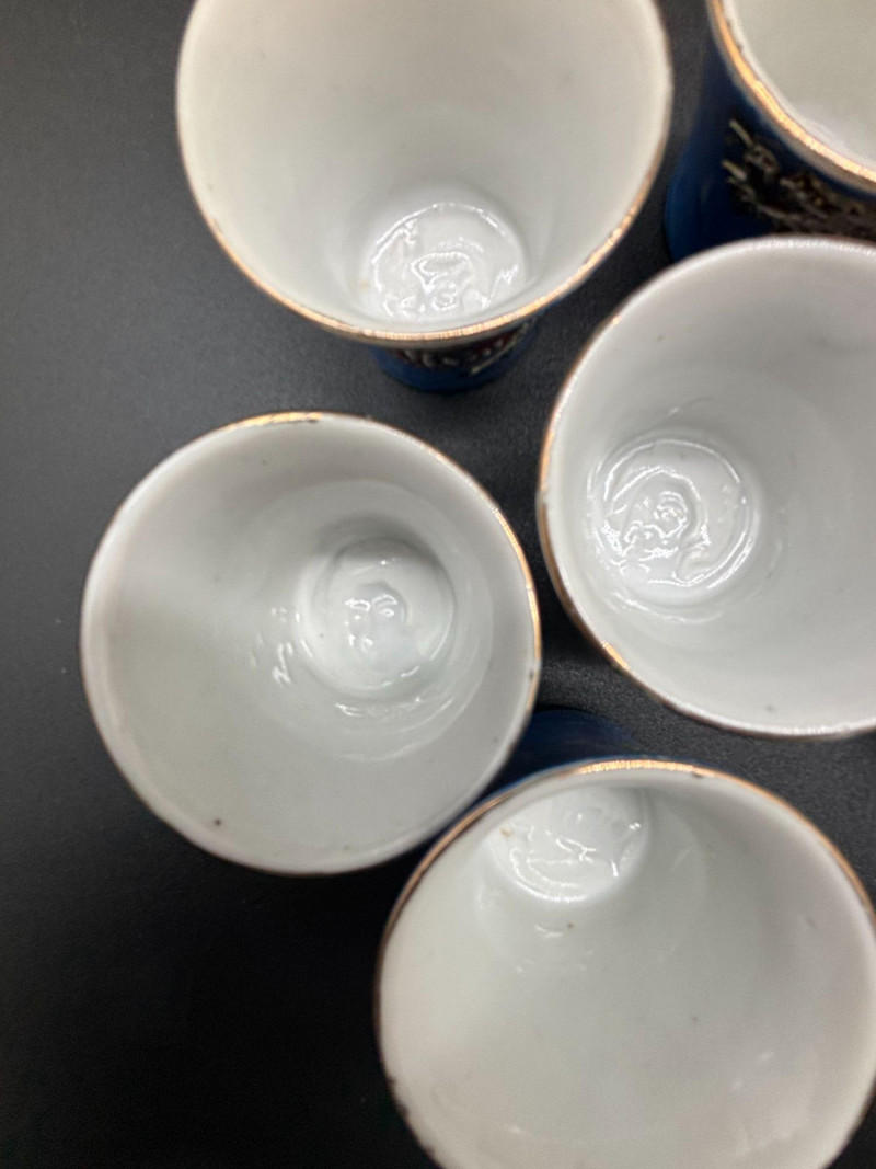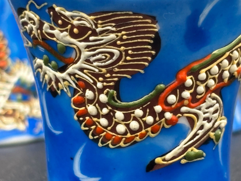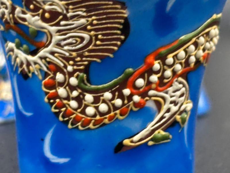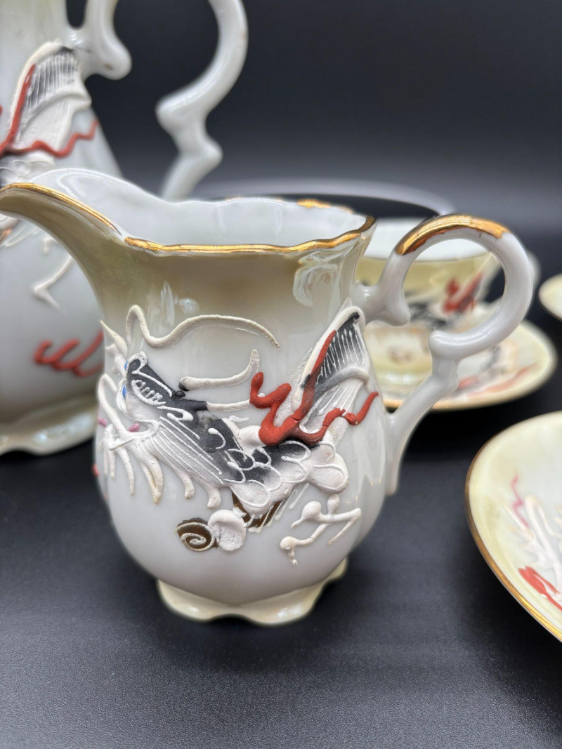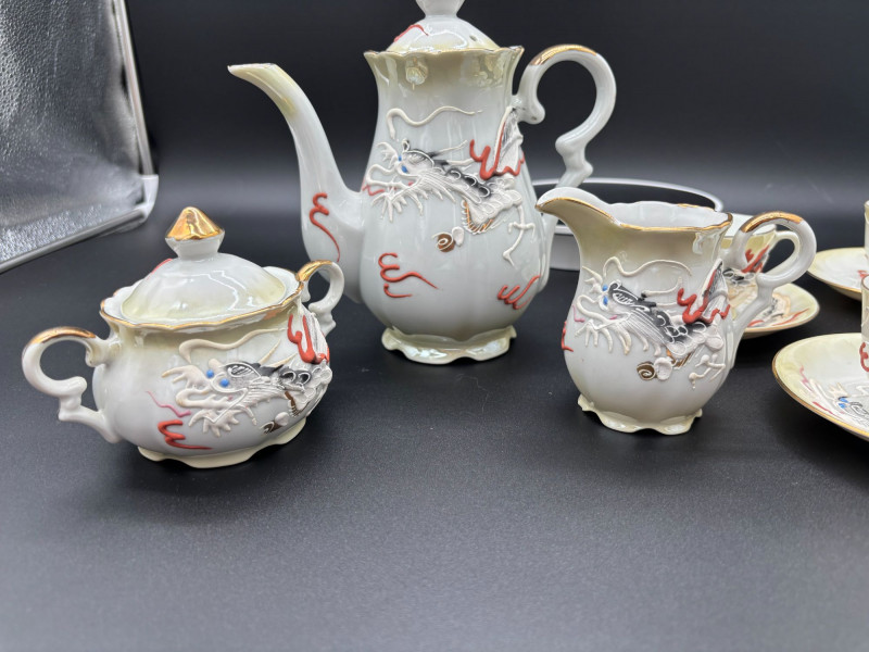 CAN BE SHIPPED Offered as a single lot is a beautiful collection of vintage Japanese dragonware porcelain, including a full tea service and a matching set of lithophane sake cups. Tall lidded teapot with applied moriage dragon Lidded sugar bowl Creamer Five (5) teacups Five (5) matching saucers Each piece features raised moriage dragons with detailed hand-applied decoration, highlighted with gold accents and red enamel detailing. The dimensional dragons wrap dramatically around the pieces' bodies, adding strong texture and presence. The set displays a soft celadon/ivory glaze with gilded rims. Five (5) cobalt blue cups Each cup features a raised dragon exterior Lithophane geisha image is visible when held to the light The sake cups are richly colored in deep cobalt with detailed dragon designs and traditional lithophane portrait bases. One cup has a small chip on the bottom. No major chips or cracks observed, just small chip on one sake cup bottom. Some light wear consistent with age Minor gilt wear in areas Overall displays beautifully This is a wonderful decorative and collectible lot, perfect for display, entertaining, or adding to a Japanese porcelain collection.π« Dragonware Tea Set Includes: