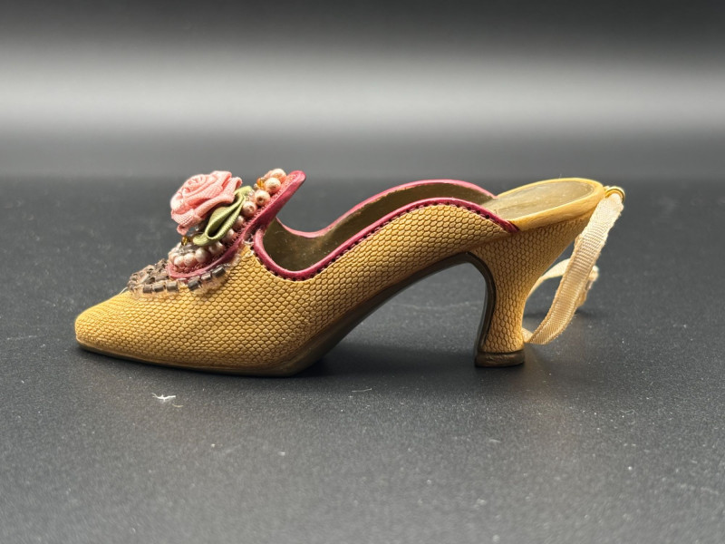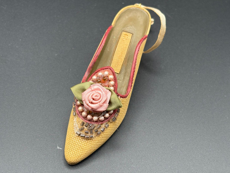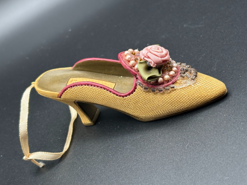 🌹 Tan high-heel miniature with detailed rose and pearl embellishment