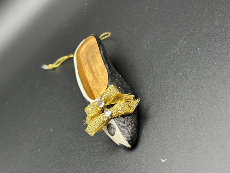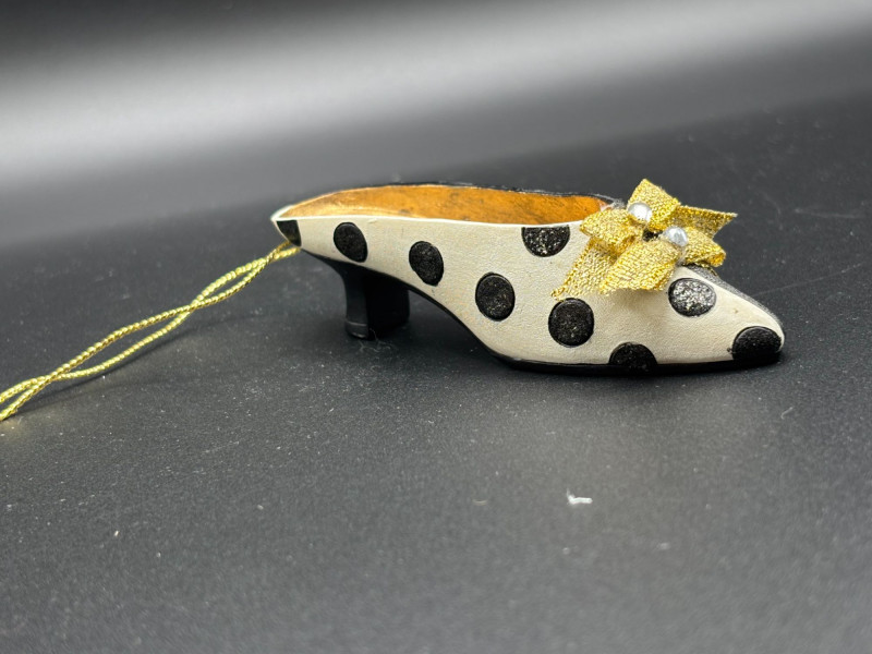 🎀 White and black polka dot mini shoe ornament with gold bow