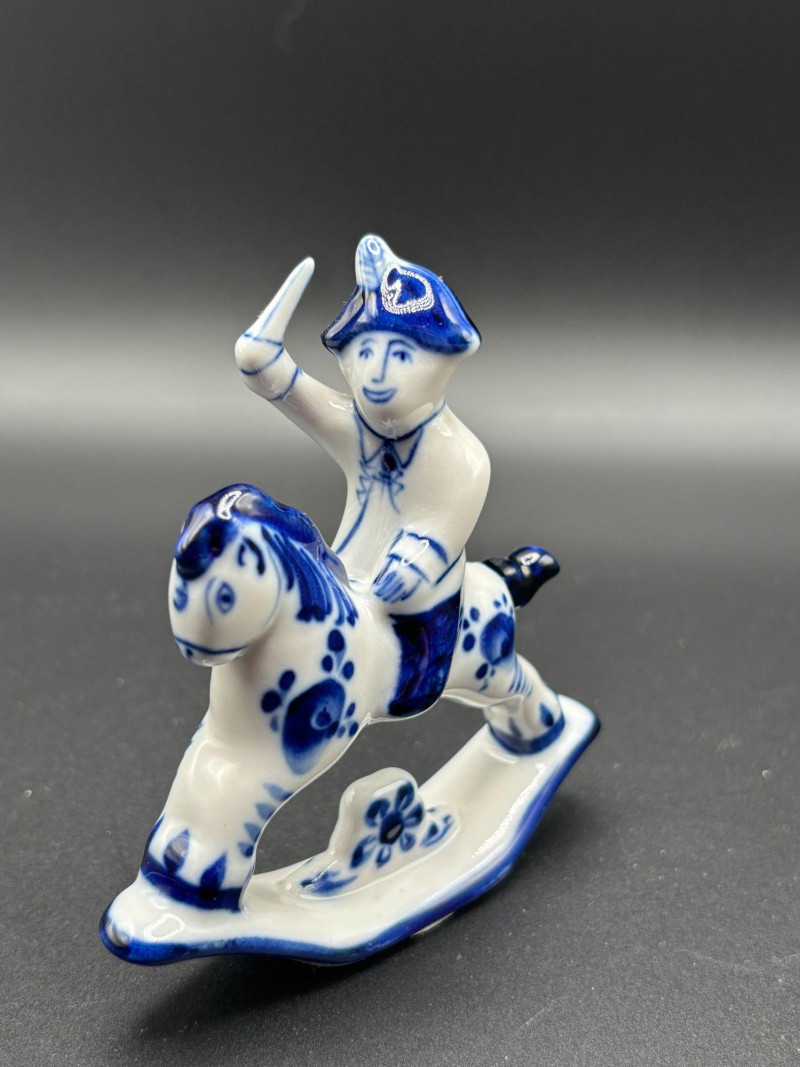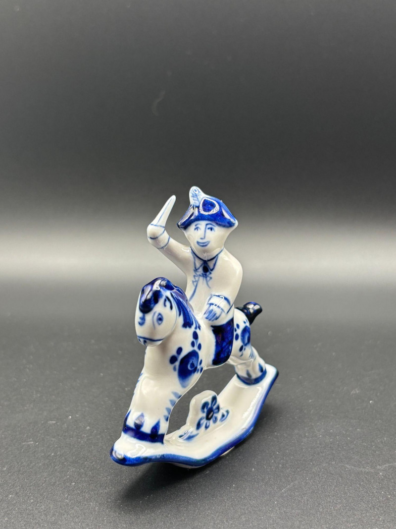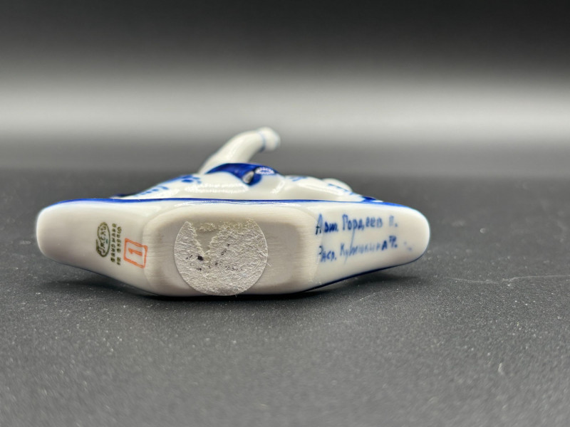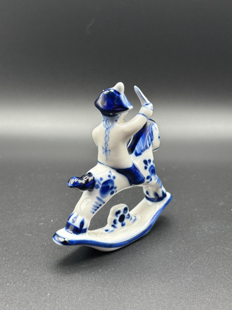 Blue and white decorative piece with raised arm detail.
