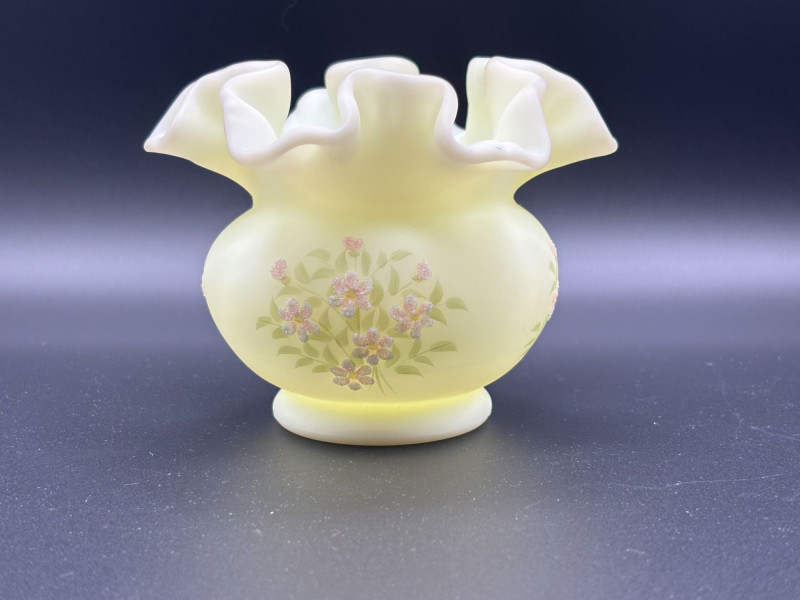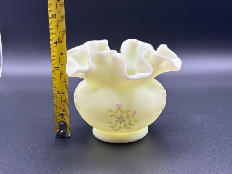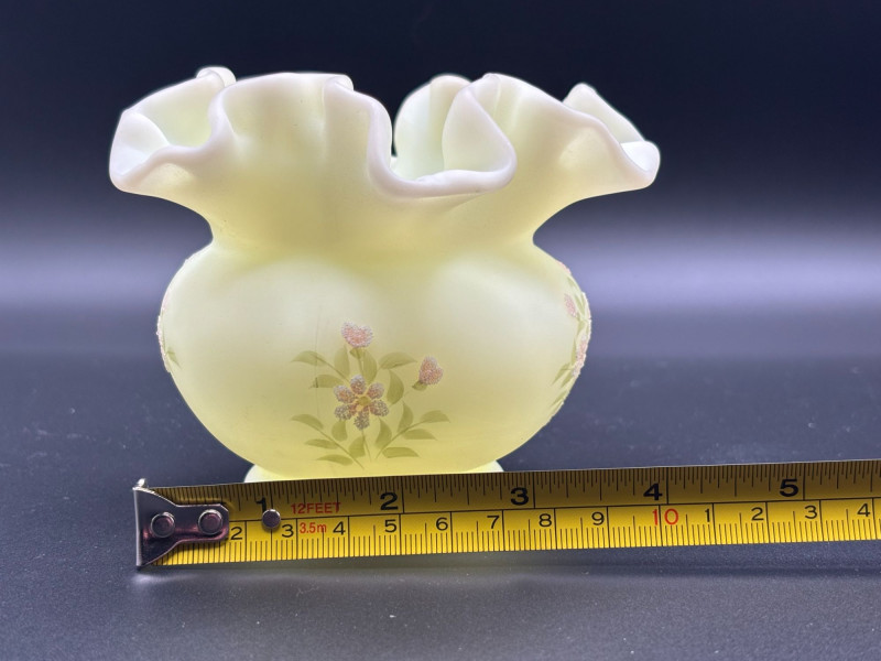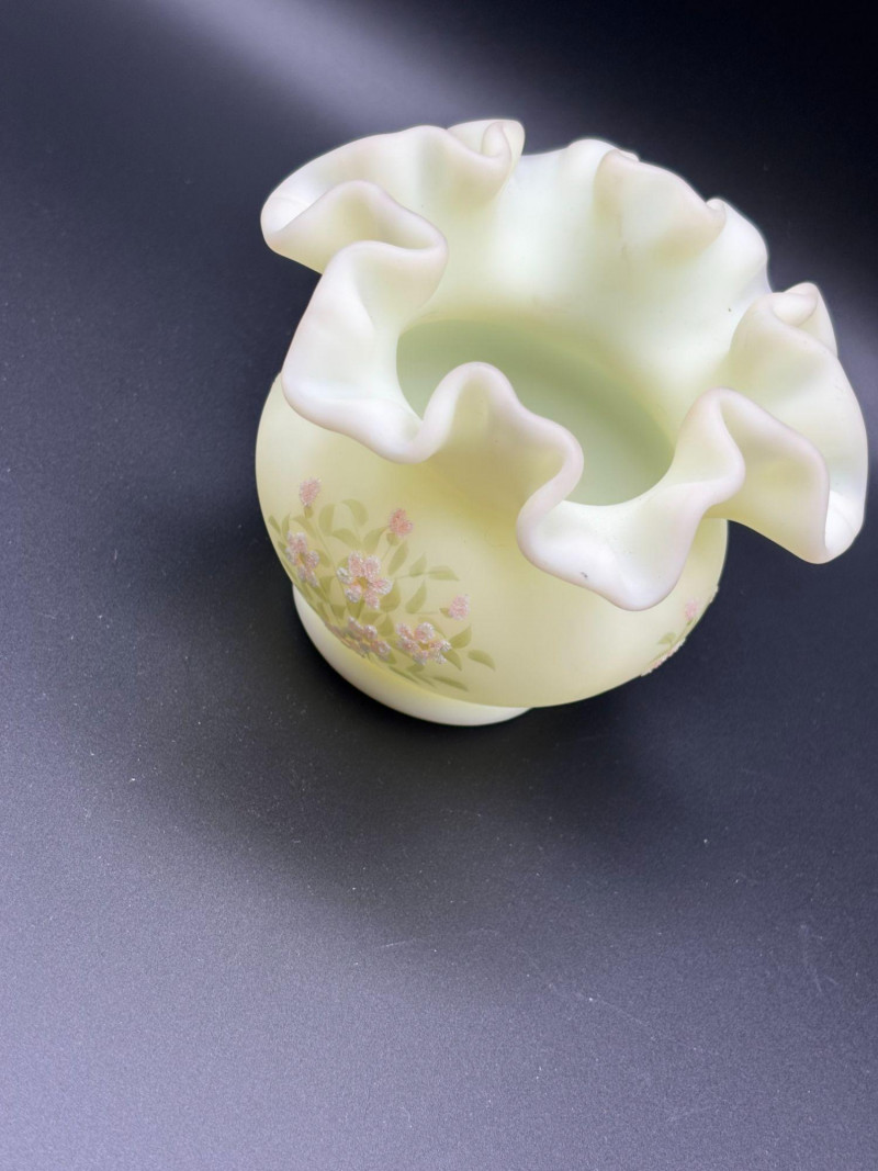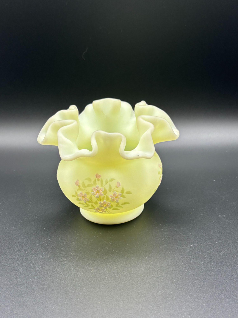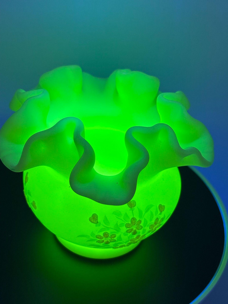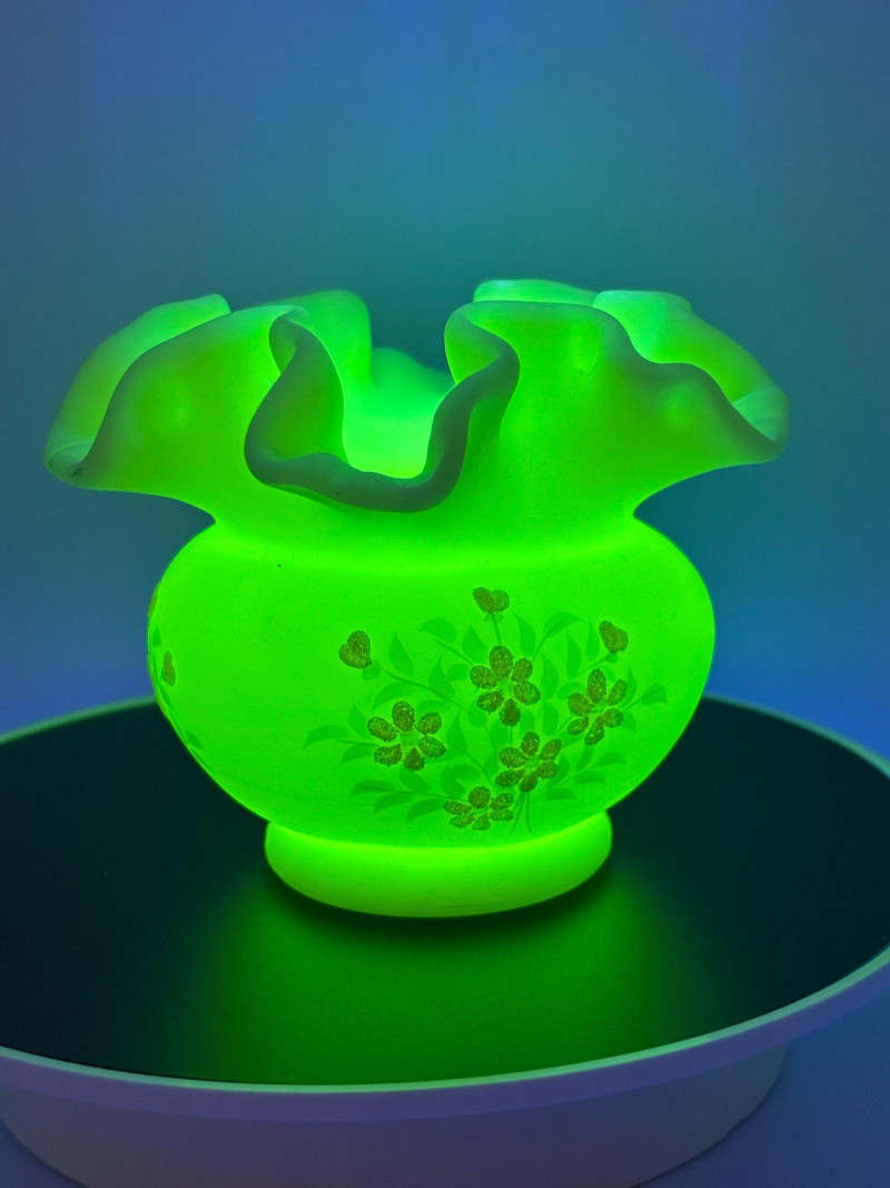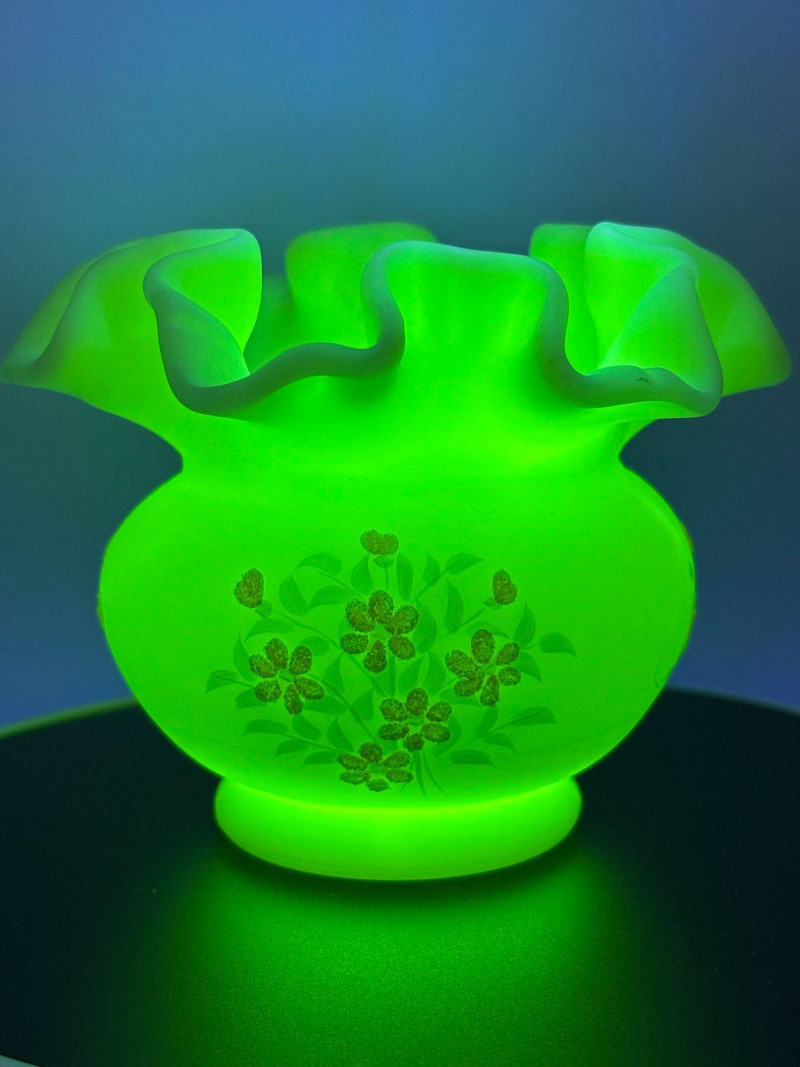 πβ¨ FENTON SIGNED URANIUM GLASS β GLOWS BRIGHT! β¨π An absolutely stunning piece of Fenton art glass that doesnβt just look beautiful β it glows brilliantly under UV light! This elegant satin-finish vase features: β’ Classic Fenton ruffled crimped rim Under UV light, this vase lights up dramatically, making it a standout display piece for any uranium or glow glass collection. The hand-painted floral details add a charming, feminine touch to the classic Fenton form. Perfect for: Condition: Pre-owned vintage condition with typical light wear consistent with age. No major cracks or chips noted. Hand-painted details remain visible. Please review all photos carefully for condition and size. π¦ Shippable. π We do our best to accurately describe items and disclose any visible condition issues; however, all items are sold as-is, where-is. Please review all photos carefully and ask any questions prior to bidding. A glowing beauty that blends artistry and collector appeal β donβt miss it!