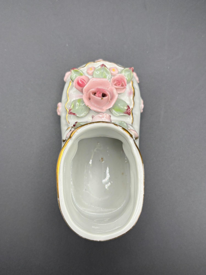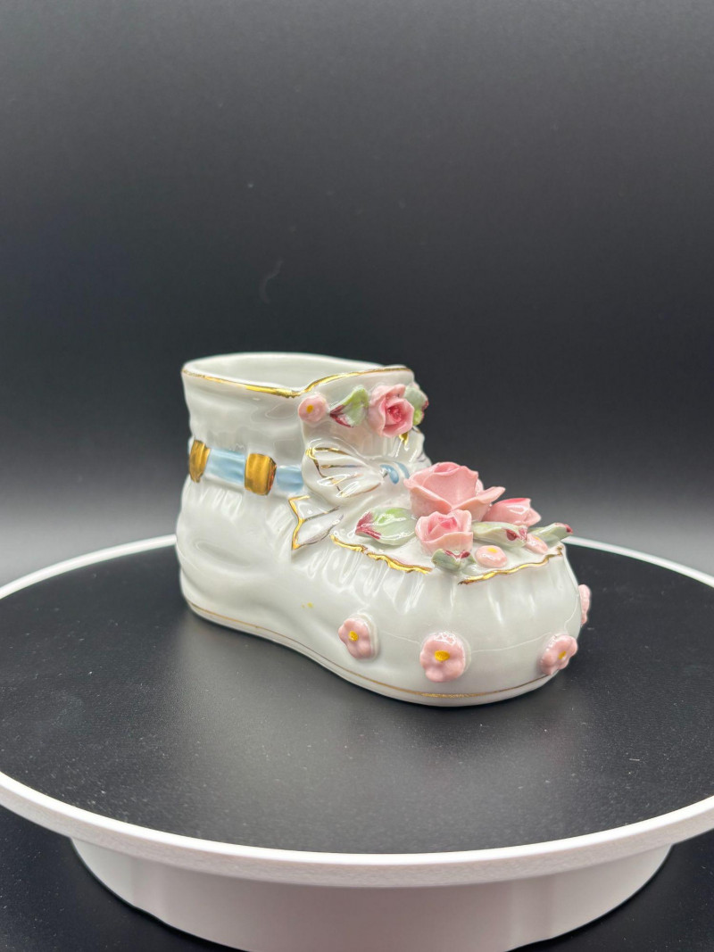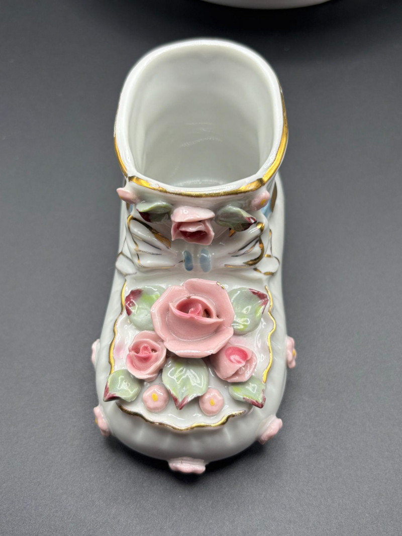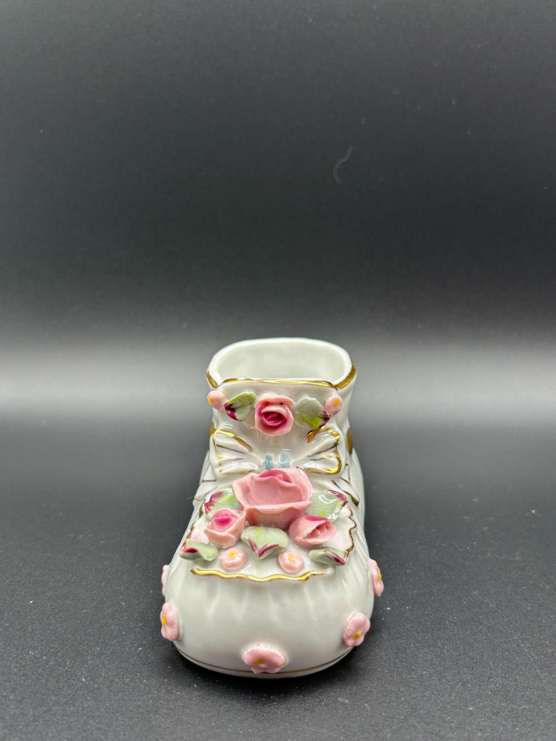 • 👠 Victorian-style porcelain shoe planter with raised roses and bow detail
