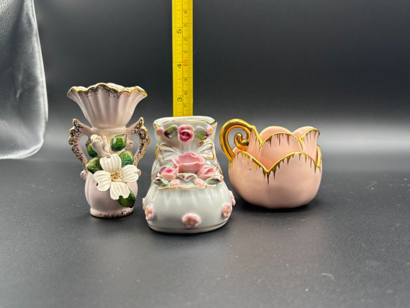 Lot # 39 - Vintage Porcelain mini Floral Vase, Shoe Planter & cream and sugar set