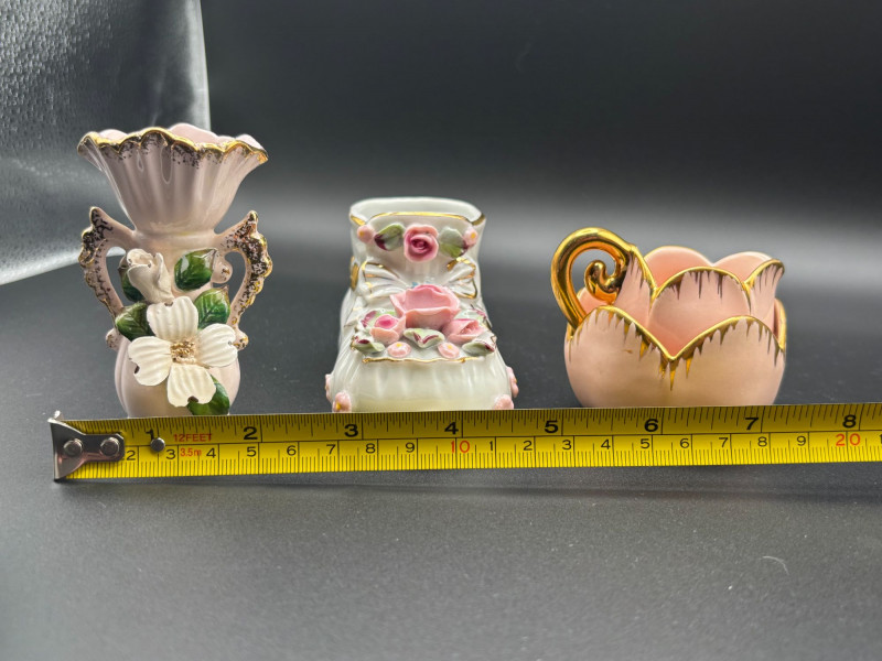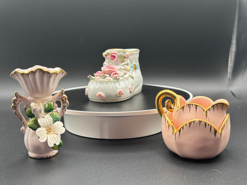 🌸✨ CHARMING VINTAGE FLORAL PORCELAIN LOT ✨🌸 A delightful 3-piece collection of vintage decorative porcelain, each featuring raised floral details and elegant gold accents. This lot includes: • 🌺 Pink vase with applied white dogwood-style flowers and gold trim Each piece showcases beautiful dimensional florals, soft pastel tones, and hand-applied gold detailing that gives them lovely vintage charm. These are perfect accent pieces for cottage décor, vanity displays, or collectors of romantic porcelain. Condition: Pre-owned vintage condition with light wear consistent with age. Some minor surface wear to gold trim may be present. No major cracks noted. Please review all photos carefully for condition and size details. 📌 We do our best to accurately describe items and disclose any visible condition issues; however, all items are sold as-is, where-is. Please review all photos carefully and ask any questions before bidding. A sweet trio ready to add nostalgic elegance to any space!