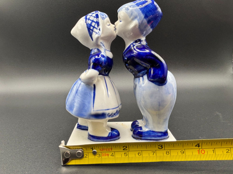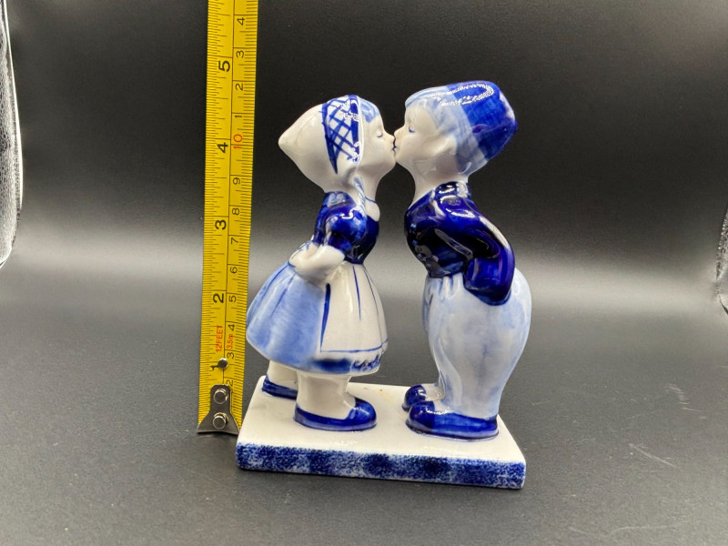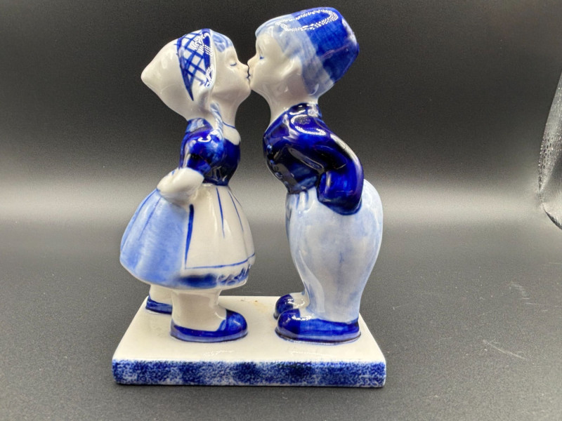 Traditional Delft-style boy and girl in classic blue attire sharing a kiss. Mounted on base. A timeless symbol of Dutch romance and collectible décor.