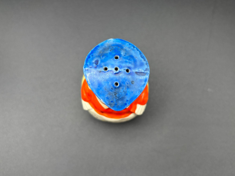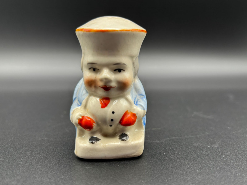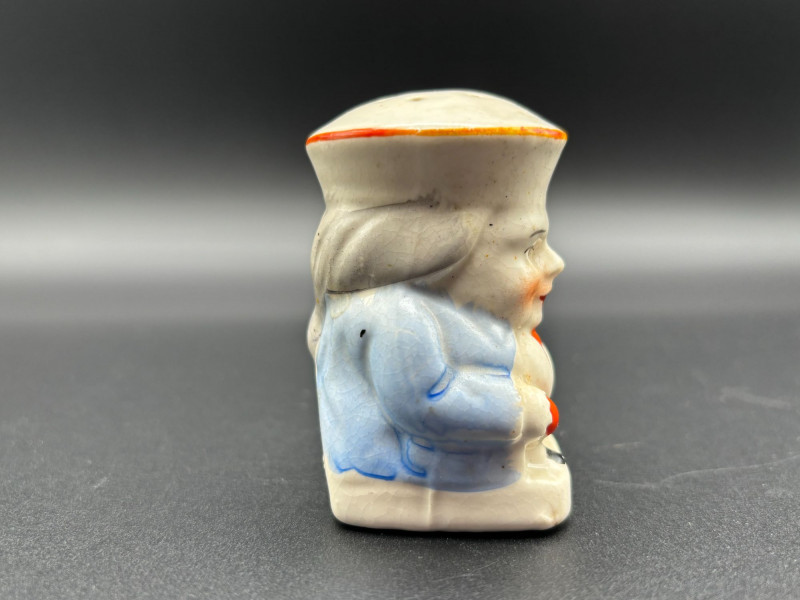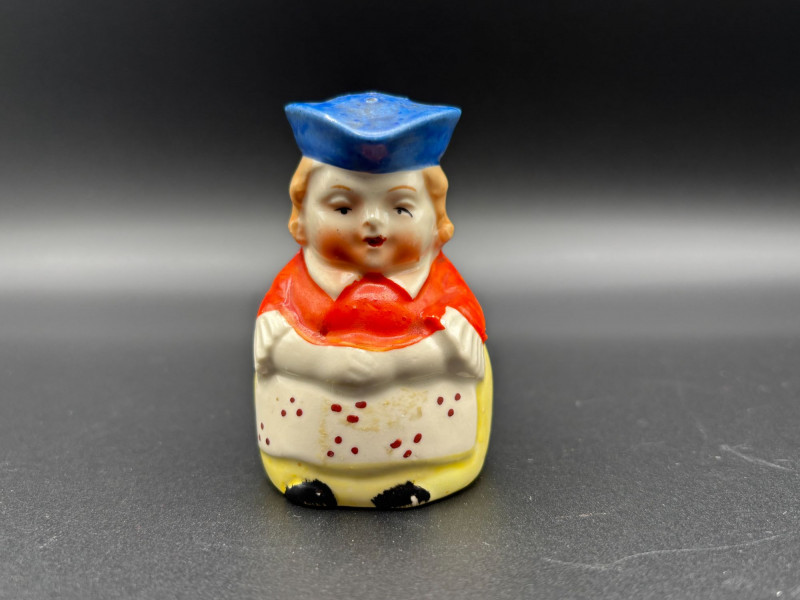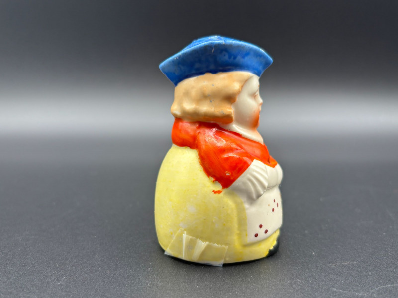 Figural Colonial-era woman wearing bonnet and apron. Hand-painted vintage detailing.