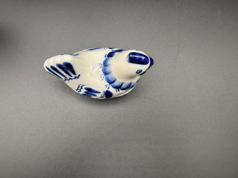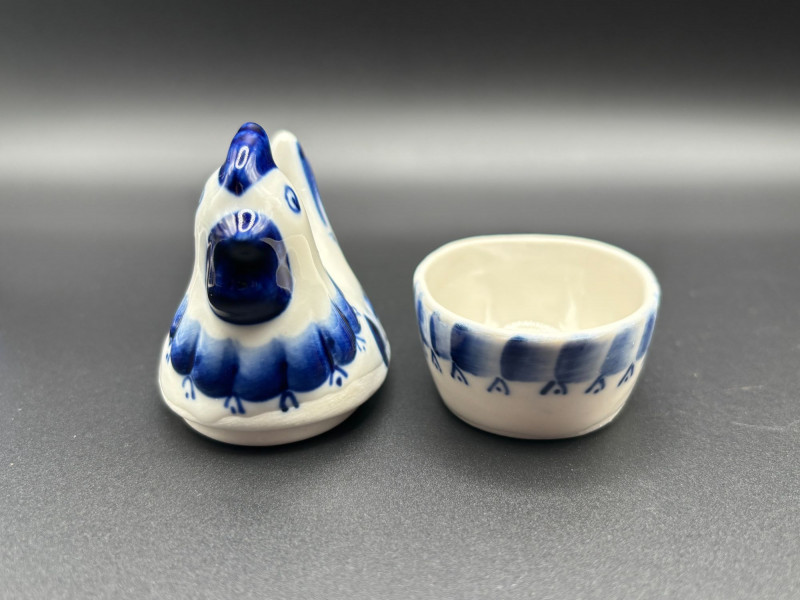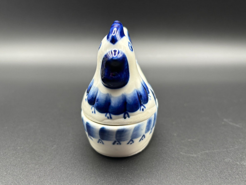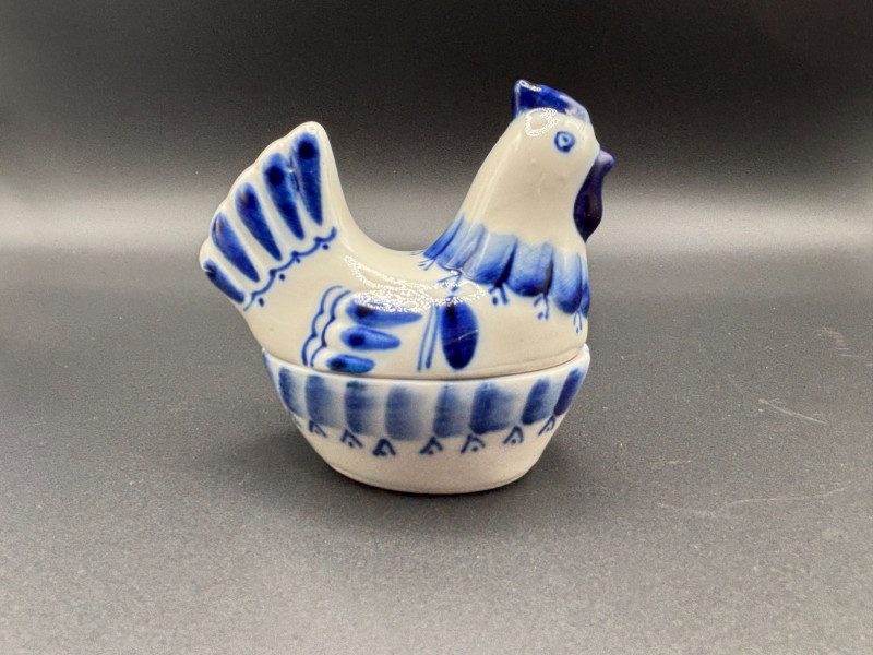 Blue and white hen with removable lid. Opens for small storage — perfect for jewelry, keepsakes, or display.