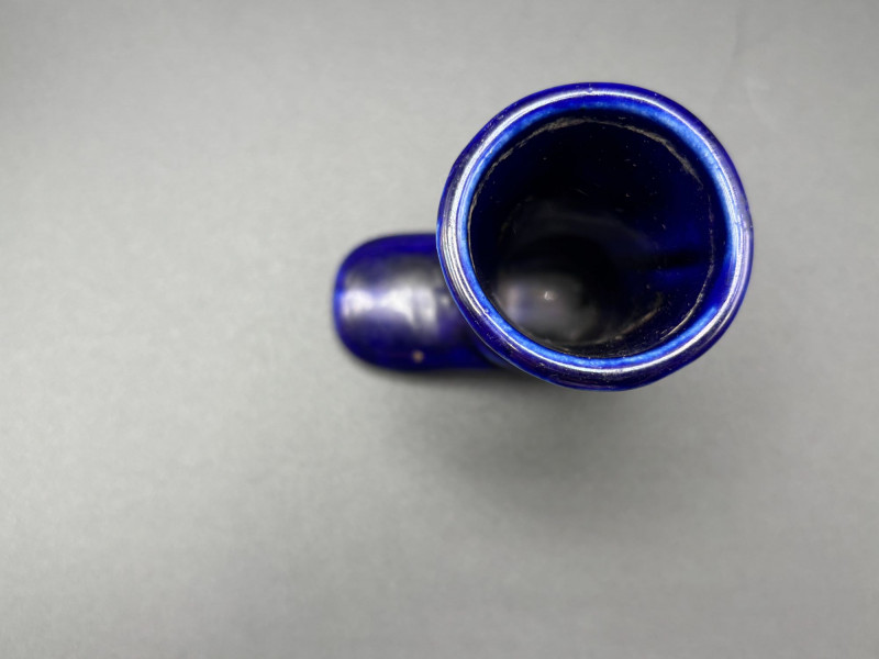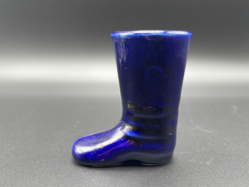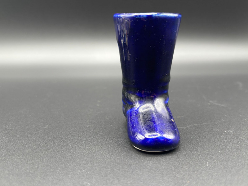 Glossy deep cobalt boot-shaped holder. Fun and whimsical accent piece for kitchen or display shelf.