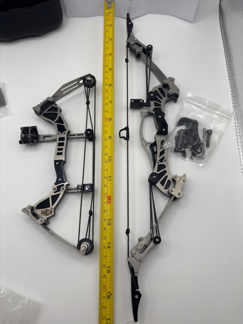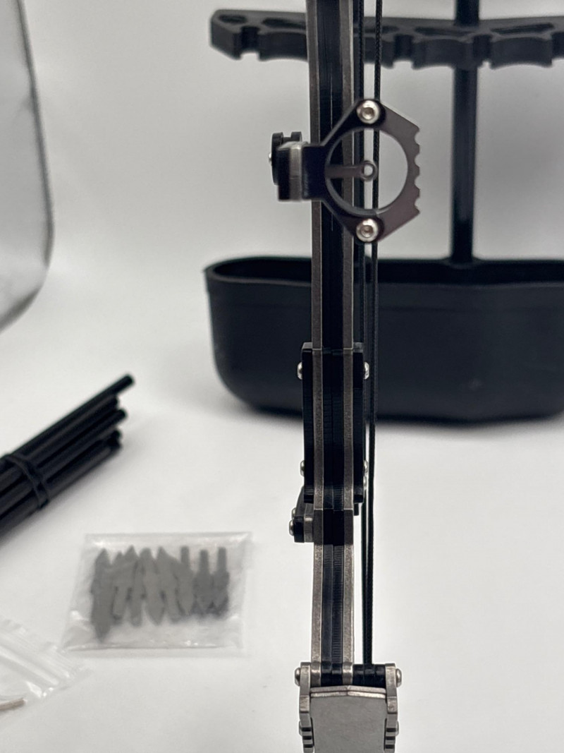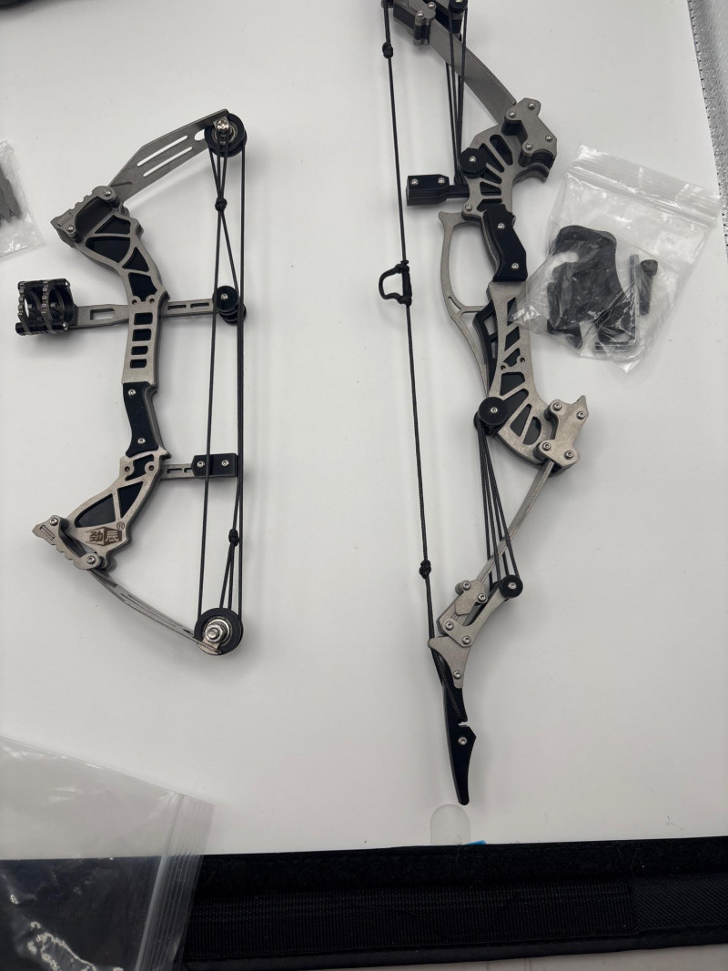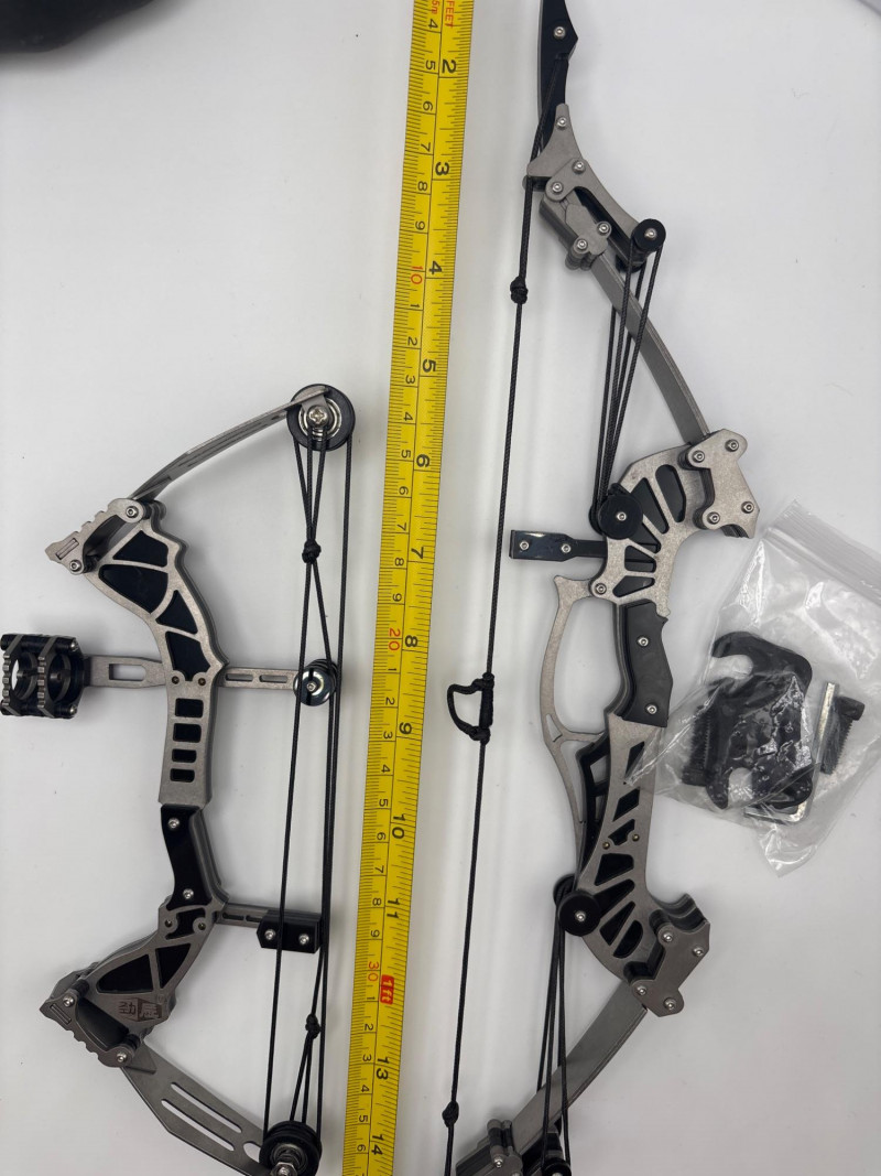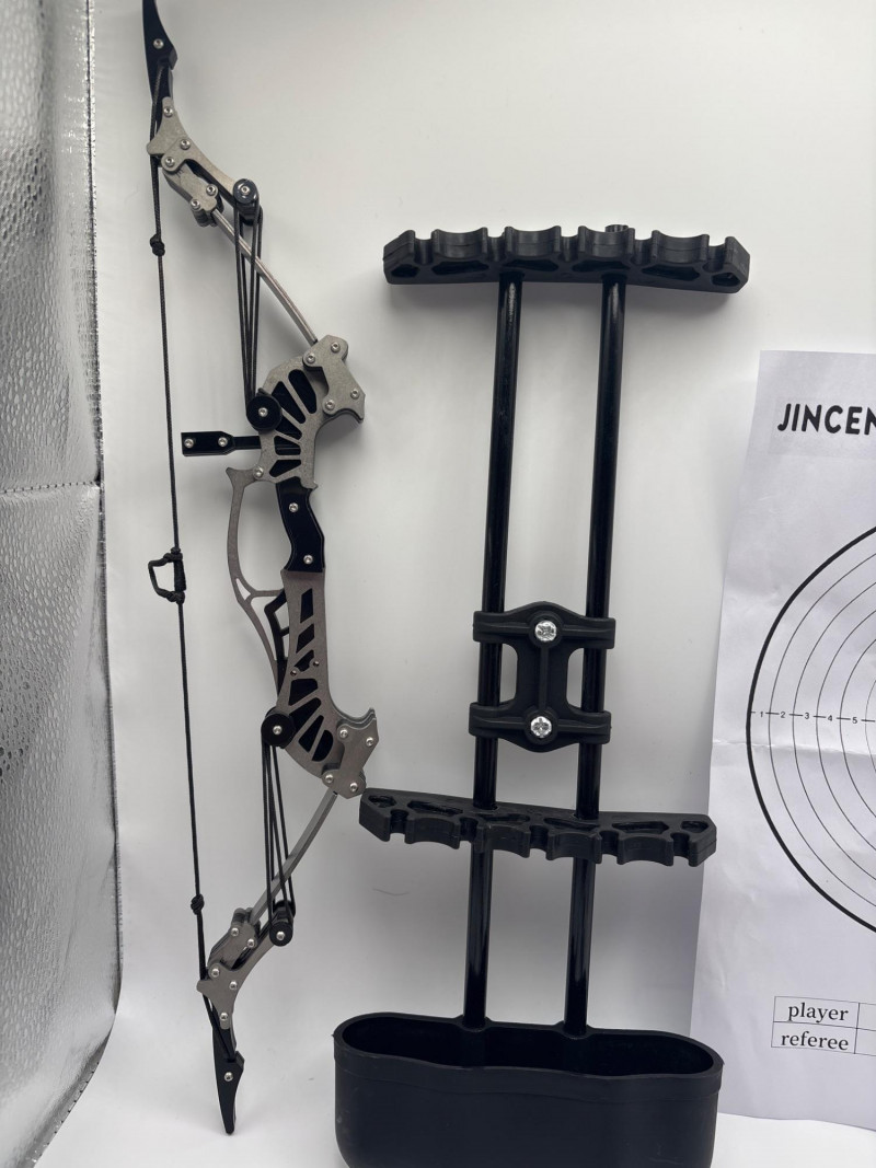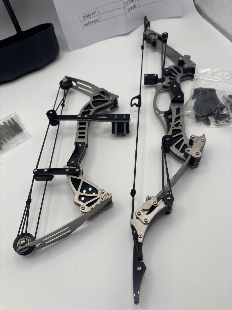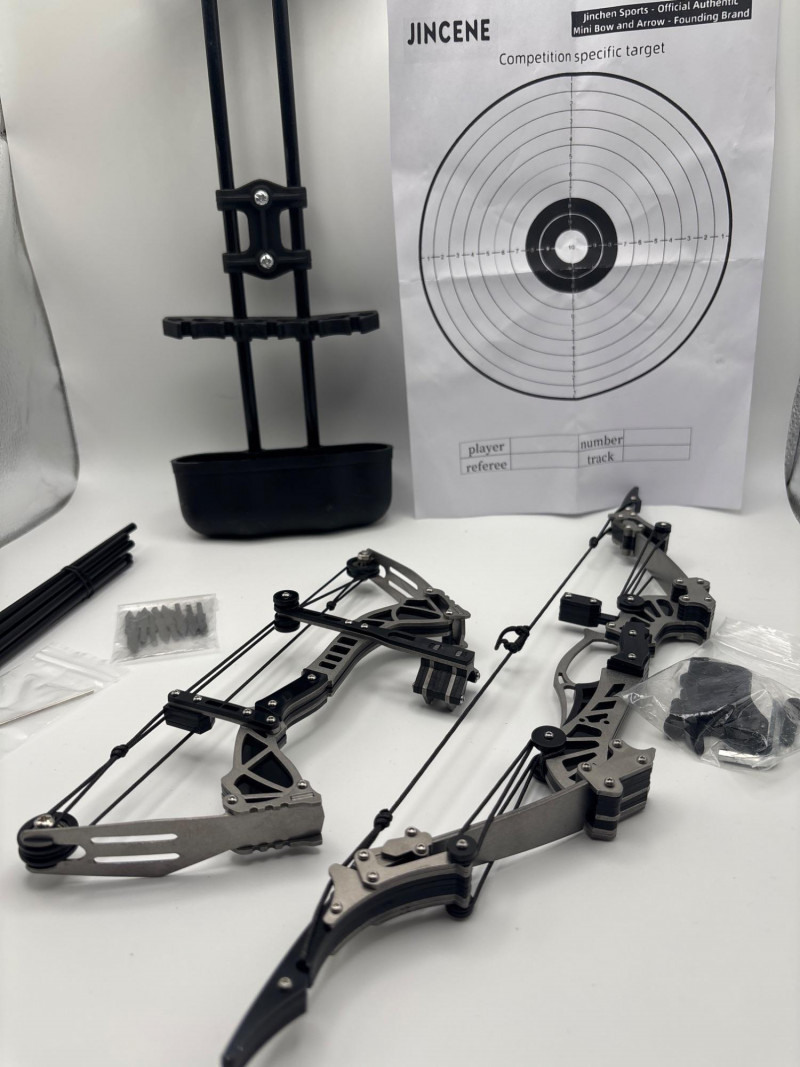 Unique mini compound bow lot featuring two miniature compound bows along with accessories and arrows. These compact bows replicate the mechanics of full-size compound bows, making them great for desktop archery practice, hobby shooting, or collectors of mini archery gear. Included in this lot: 1 larger mini compound bow – approximately 11 inches long (arrows missing) 1 smaller mini compound bow – approximately 9 inches long Mini arrows with metal tips (appear new and still in original packaging) Additional accessories and hardware as shown Allen key and small parts bag The smaller bow appears unused and still in its original packaging, and the arrows for that bow also appear new in package. The larger bow does not include arrows. Get ready for some serious fun with these mini compound bows! Experience the thrill and accuracy of archery in the palm of your hand. Estimated range of 10–50 meters Approximate pull weight of 10–20 pounds Made of durable stainless steel and ABS materials Compact design but surprisingly powerful and well-crafted Despite their small size, these mini bows are big on power and precision. They are perfect for target practice, recreational archery, hobby shooting, or just having fun with friends. Please review photos carefully for included items and condition. Mixed condition. The smaller bow and arrows appear new in original packaging. The larger bow is missing arrows. Accessories are included as shown. 📦 Shippable Mini compound bows are scaled-down versions of traditional compound bows that use the same pulley and cable system. Because they are often constructed with stainless steel components, they are durable while still maintaining a compact design.