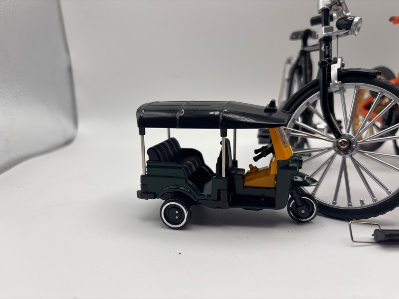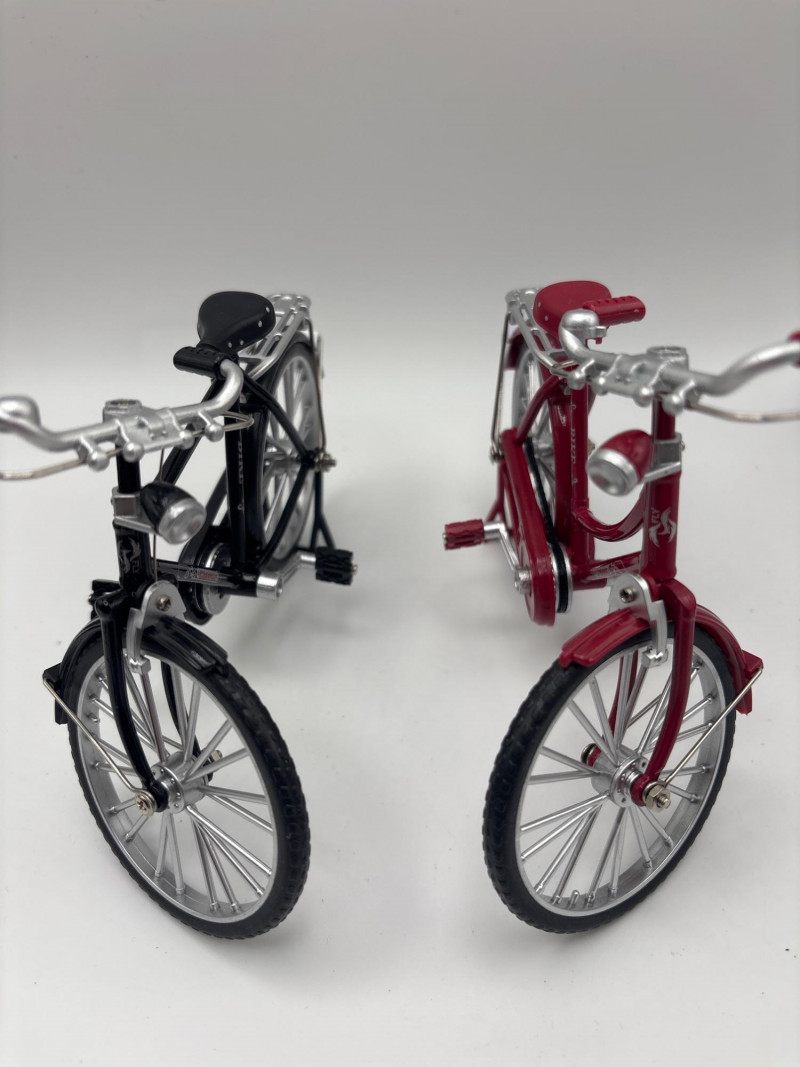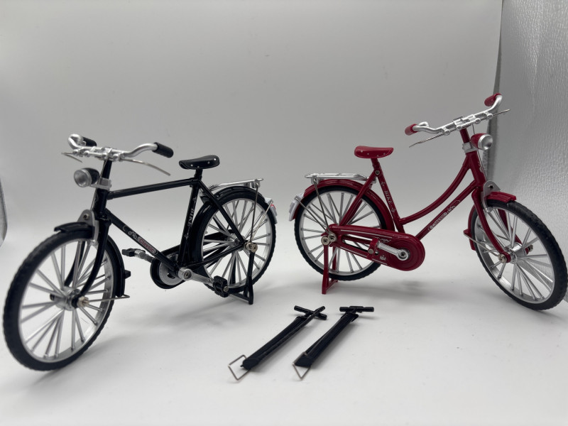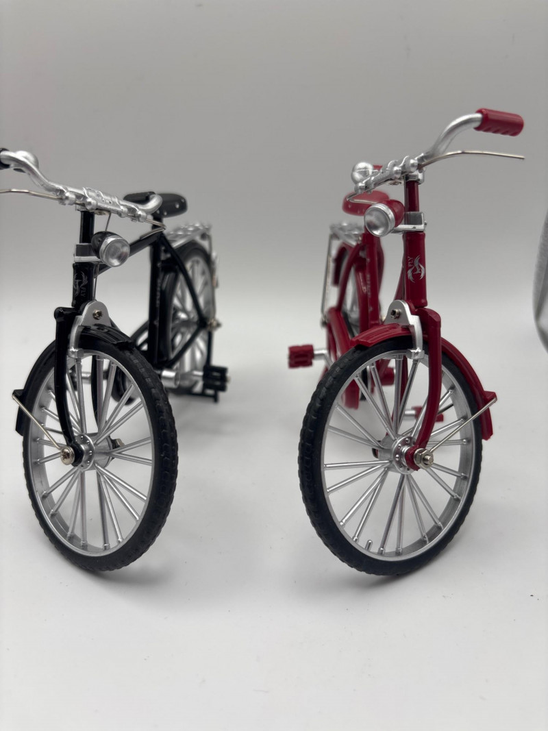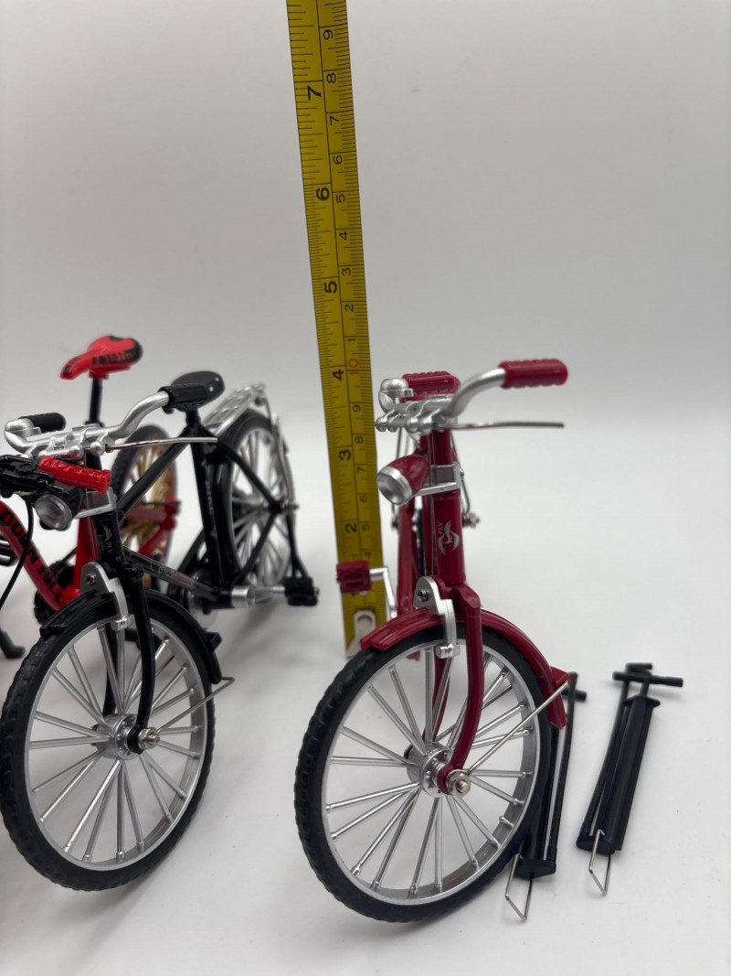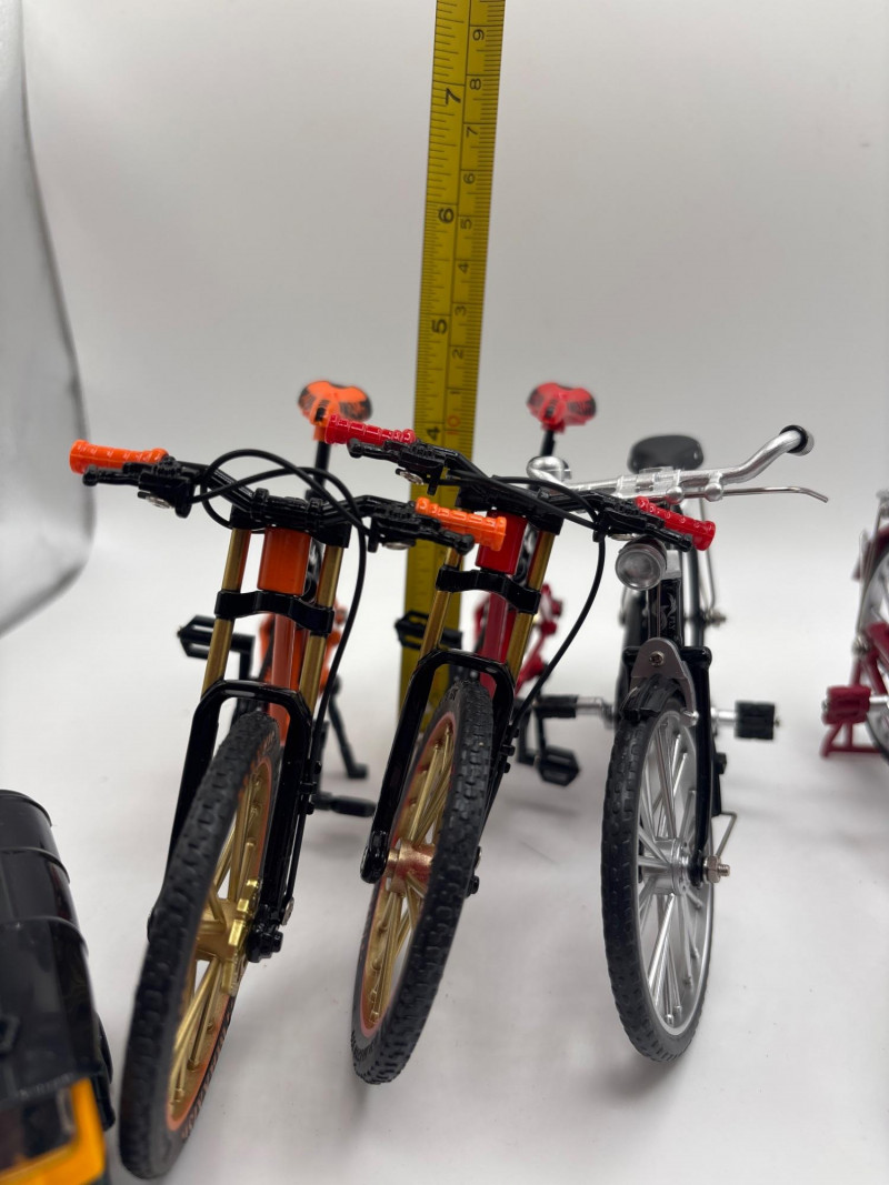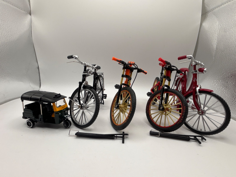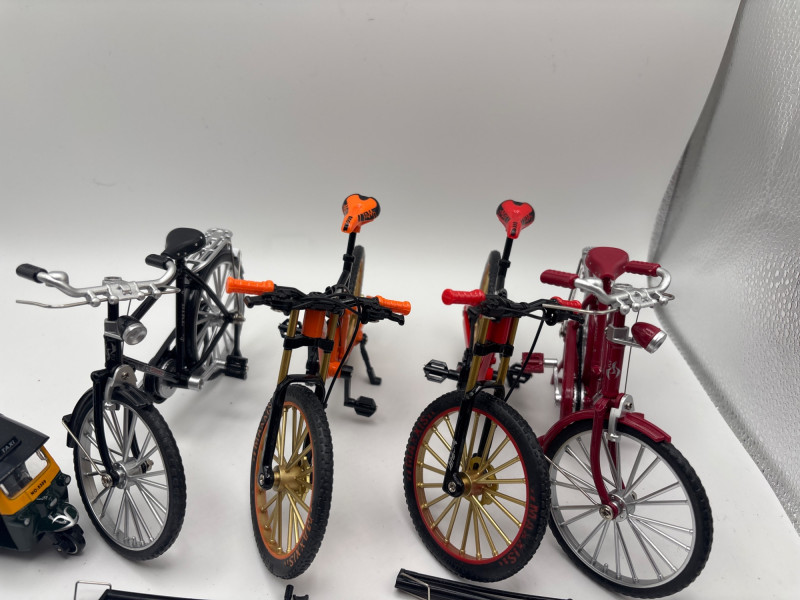 Fun mini alloy bicycle model lot featuring detailed 1:10 scale bike replicas. This set includes two downhill mountain bikes and two street bikes, along with a small model bike rack and utility cart, making it a great display collection for bike enthusiasts or collectors. These miniature bikes are designed as collectible tabletop models with realistic details and moving parts. Included in this lot: 2 downhill mountain bike models 2 street bike models Mini tire pumps Small model utility cart Features: 1:10 scale miniature bike replicas Functional wheels, pedals, and shock absorbers for realistic movement Detailed frame and component design Constructed from durable alloy metal These mini bike models are great for: Desk or shelf display Coffee bar décor Bike enthusiasts and collectors Gift ideas for cyclists Pretend play or miniature scenes The realistic design and working components make them eye-catching conversation pieces for home or office displays. Please review photos carefully for all items included. Pre-owned display condition with light wear consistent with handling. 📦 Shippable Mini alloy bike models like these are popular with cycling enthusiasts and collectors because they replicate the design of real bicycles with functioning parts in a compact scale.