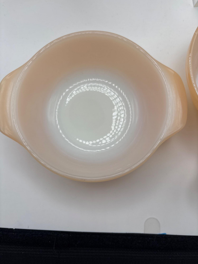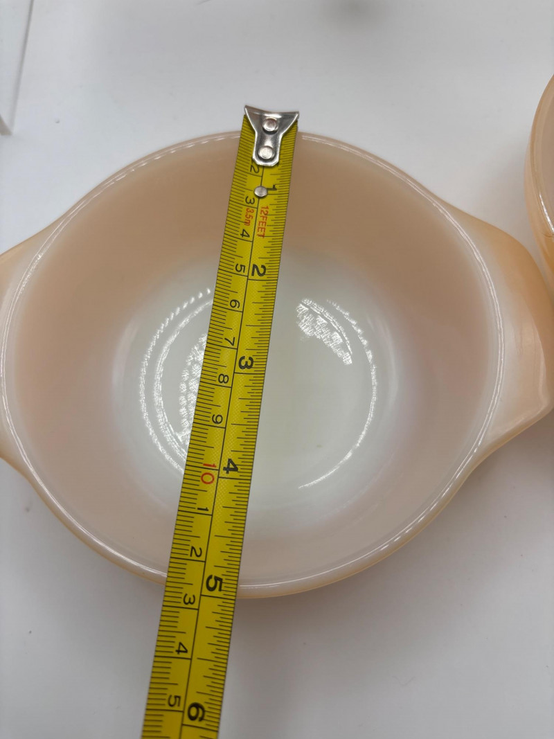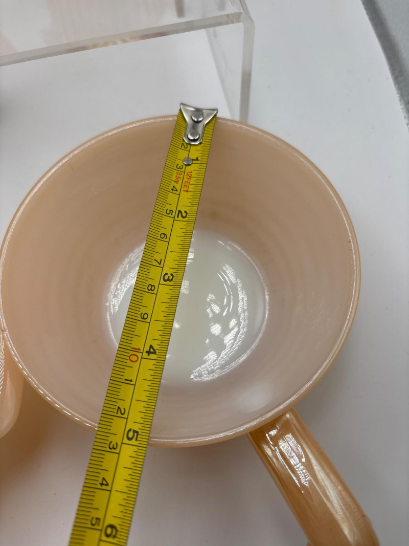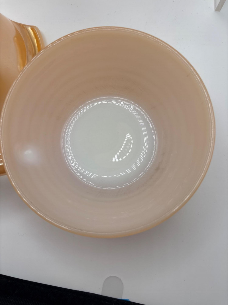 This vintage glassware lot is highlighted by a Fire-King Primrose Peach Lustre double-handled sugar bowl, a collectible mid-century piece made by Anchor Hocking. The sugar bowl features the distinctive raised leaf motif handles and soft peach lustre finish that make the Primrose pattern popular with Fire-King collectors. Also included in this lot are several coordinating peach-tone glass serving pieces, creating a charming mid-century kitchen display set. Items included: Fire-King Primrose Peach Lustre double-handled sugar bowl (Anchor Hocking marked) Fire-King Handled ribbed bowl – approx. 5–5.5 inches wide (marked) Fire-King Handled soup cup/bowl – approx. 5 inches wide Two peach glass sugar and creamer – approx. 3–4 inches tall The pieces feature warm peach / amber tones, ribbed patterns, and classic mid-century styling that display beautifully together. This lot would be perfect for: Fire-King collectors Vintage kitchen décor Mid-century glassware collectors Resellers or vintage display setups Please review photos carefully for all pieces included. Pre-owned vintage condition with normal wear consistent with age. No major damage observed in photos. See images for details. 📦 Shippable Fire-King glassware, produced by Anchor Hocking beginning in the 1940s, is highly collectible today. The Primrose Peach Lustre pattern was produced during the mid-century era and is known for its molded leaf handles and warm iridescent peach coloring.