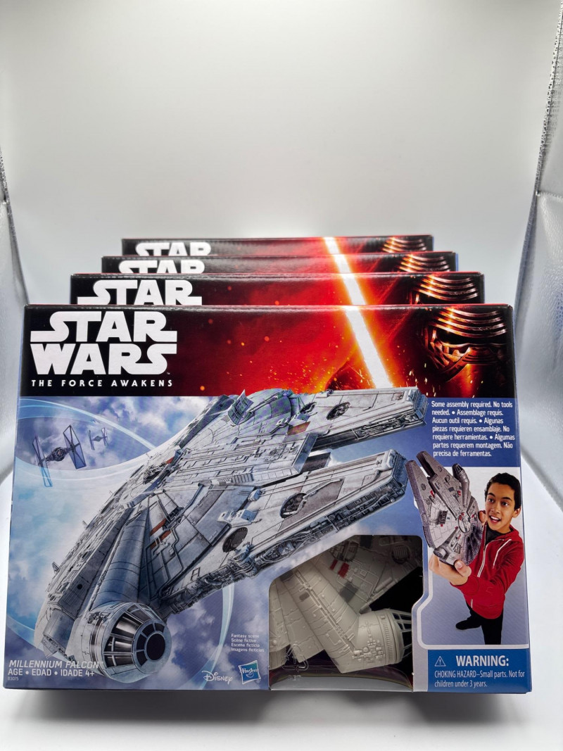 Great Star Wars collector and gift lot featuring four Millennium Falcon toys, all new in original boxes. These iconic spacecraft toys from Star Wars: The Force Awakens are among the most recognizable ships in the Star Wars universe and always attract attention from fans and collectors. Lots like this are perfect for gift giving, collectors, or resellers, especially with multiple identical toys still new in box. • 4 Star Wars Millennium Falcon toys These Millennium Falcon toys feature the famous freighter piloted by Han Solo and Chewbacca, one of the most beloved ships in the Star Wars franchise. Perfect for: Star Wars collectors Kids’ playtime toys Easter basket gifts Birthday gifts Resellers looking for multiple NIB items Having four of the same toy in one lot makes this great for multiple gifts or themed holiday baskets. Please review photos carefully for packaging and details. New in box (NIB). Items appear unopened. Outer carton and retail boxes may show minor storage wear. 📦 Shippable The Millennium Falcon is one of the most famous spacecraft in the Star Wars saga, making toys based on it consistently popular with both collectors and younger fans.Included in this lot