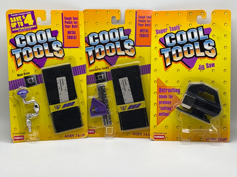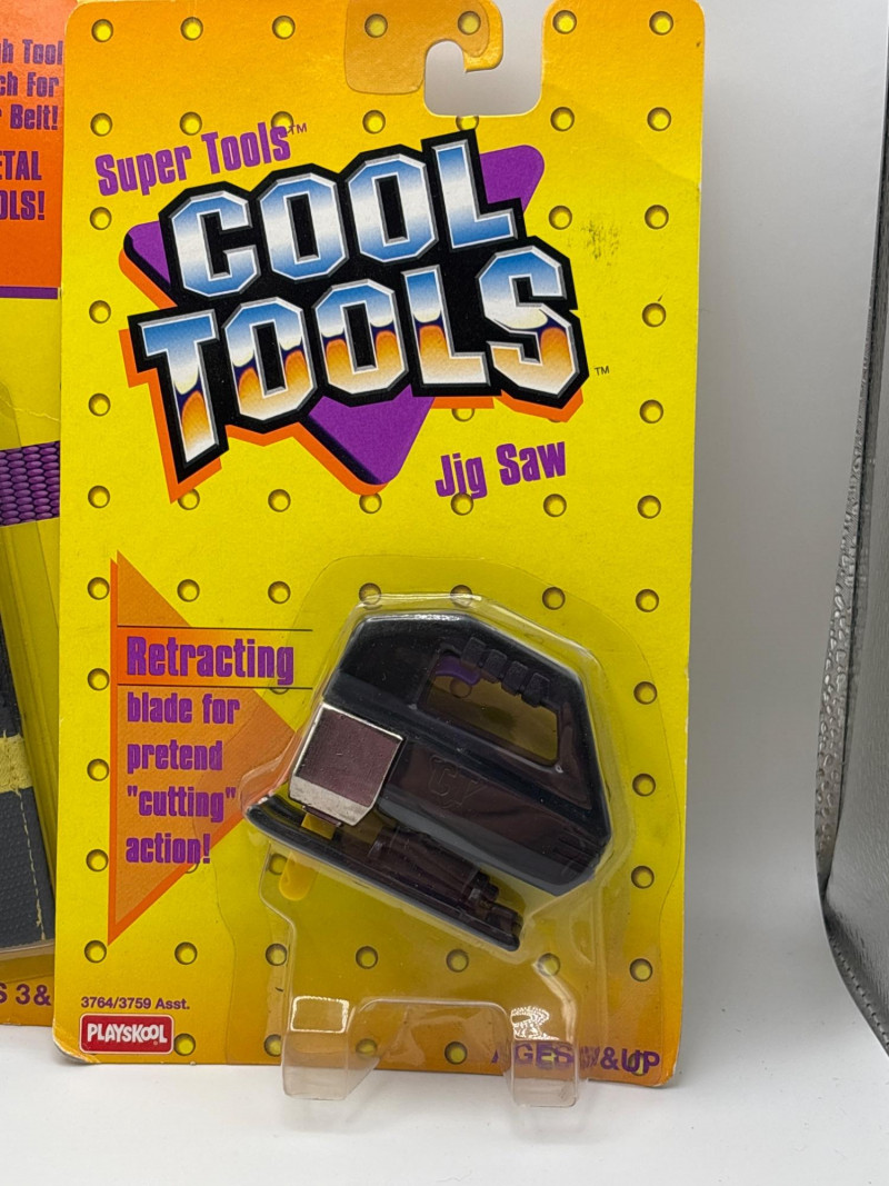 Fun Hasbro “Cool Tools” toy tool lot featuring three new-in-package toy tools from the Super Tools / Cool Tools series. These realistic-looking toy tools were designed for kids who enjoy building, pretend construction, and workshop play. All three pieces appear to be older store stock (New in Package) and remain sealed in their original retail packaging, making them great for both play and nostalgic display. • Cool Tools Jig Saw with retracting blade feature These toy tools were part of the Hasbro Cool Tools line, which focused on realistic-looking toy tools that encouraged creative building and imaginative play. Perfect for: Toy collectors Kids who enjoy tool sets Workshop-themed toy collections Nostalgic toy displays Gift giving Please review photos carefully for the exact items included. New in original packaging (NIP). Packaging shows some shelf wear consistent with age and storage. 📦 Shippable The Hasbro Cool Tools series was designed to resemble real workshop tools while remaining safe for children. Older toy lines like this are fun nostalgic pieces for collectors and families alike.Included in this lot