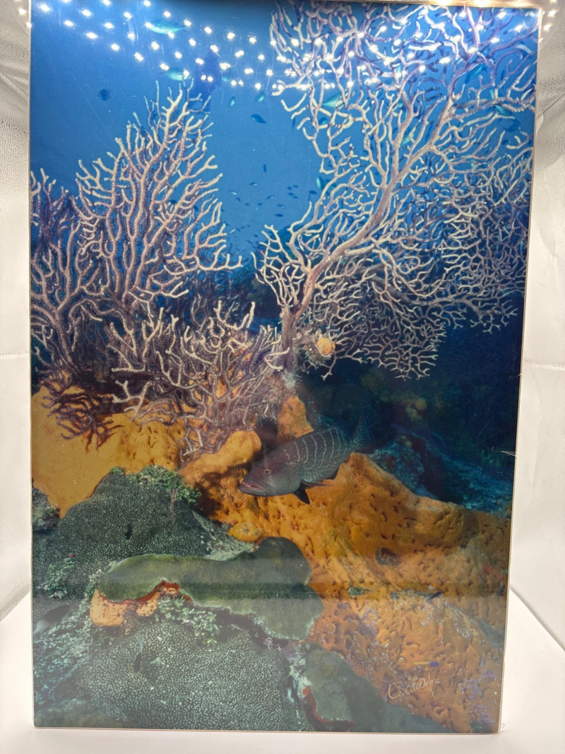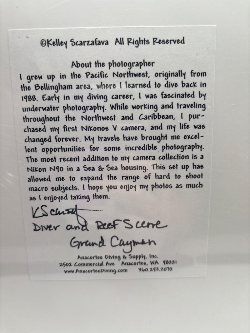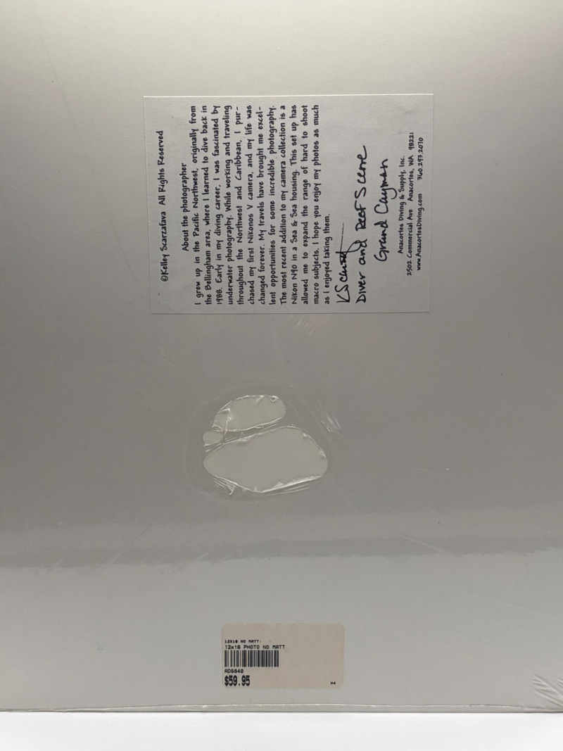 Striking underwater reef photograph from Grand Cayman, signed by photographer Kelley Scarzafava and preserved in protective plastic. Ocean photography like this draws strong interest because it captures the vivid colors and life of coral reef environments while making a beautiful display piece for coastal décor. This piece features a diver exploring a coral reef scene and is signed by the photographer. It remains wrapped in protective plastic, helping preserve the image and making it ready for framing or display. Signed photography and ocean-themed artwork often attract strong bidding because collectors, divers, and coastal décor buyers appreciate authentic signed pieces that capture unique underwater scenes. • Photographer: Kelley Scarzafava The back includes a description of the photographer’s work and background in underwater photography across the Pacific Northwest and Caribbean. Underwater reef photography is popular for: • Coastal and beach home décor Signed pieces add an extra layer of interest because they represent the photographer’s original work and experience capturing the scene underwater. Protected in plastic wrapping. 📦 Shippable Underwater photographers use specialized camera housings and equipment to capture reef ecosystems. Images like this allow viewers to experience the beauty of coral reefs and marine life without ever entering the water.