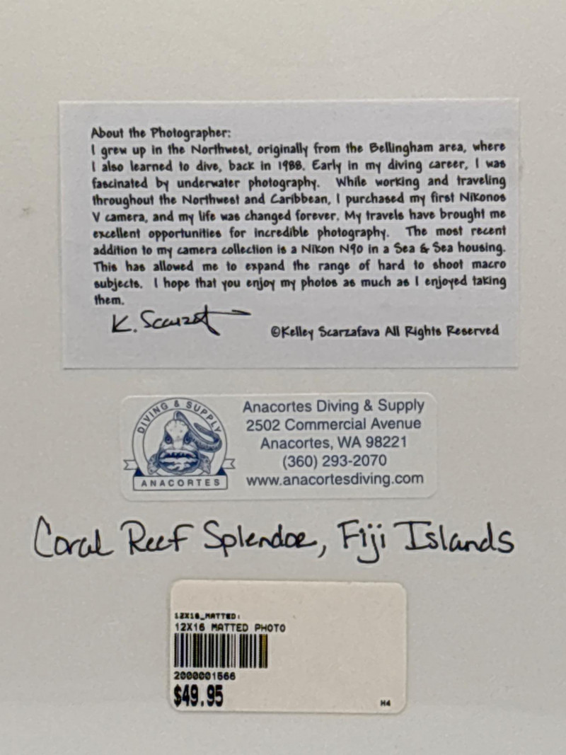 Beautiful underwater coral reef photograph from the Fiji Islands, signed by underwater photographer Kelley Scarzafava. Ocean reef photography like this attracts strong interest because it captures the color, movement, and biodiversity of coral ecosystems that few people ever witness firsthand. This striking image titled “Coral Reef Splendor – Fiji Islands” shows a vibrant reef scene filled with tropical fish and coral formations. The photograph is signed by the photographer and professionally presented with matting, making it ready for framing or display. Pieces like this often generate strong bidding because they combine travel photography, marine life imagery, and a signed work from an underwater photographer. • Title: Coral Reef Splendor – Fiji Islands The back includes information about the photographer along with a label from Anacortes Diving & Supply, highlighting Scarzafava’s background in underwater diving and photography. Ocean reef photography is popular for: • Coastal home décor Signed underwater photography is especially appealing because it represents authentic moments captured during real dives in remote locations like Fiji. Pre-owned. Please review photos carefully for exact condition. 📦 Shippable Fiji is considered one of the world’s top coral reef destinations, often called the “Soft Coral Capital of the World.” Its reefs are known for their vibrant colors and dense schools of tropical fish, making it a favorite location for underwater photographers.