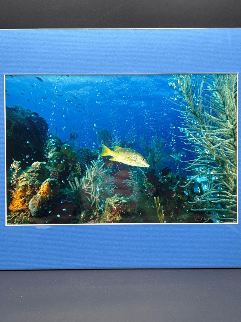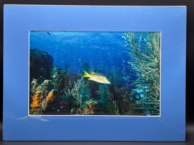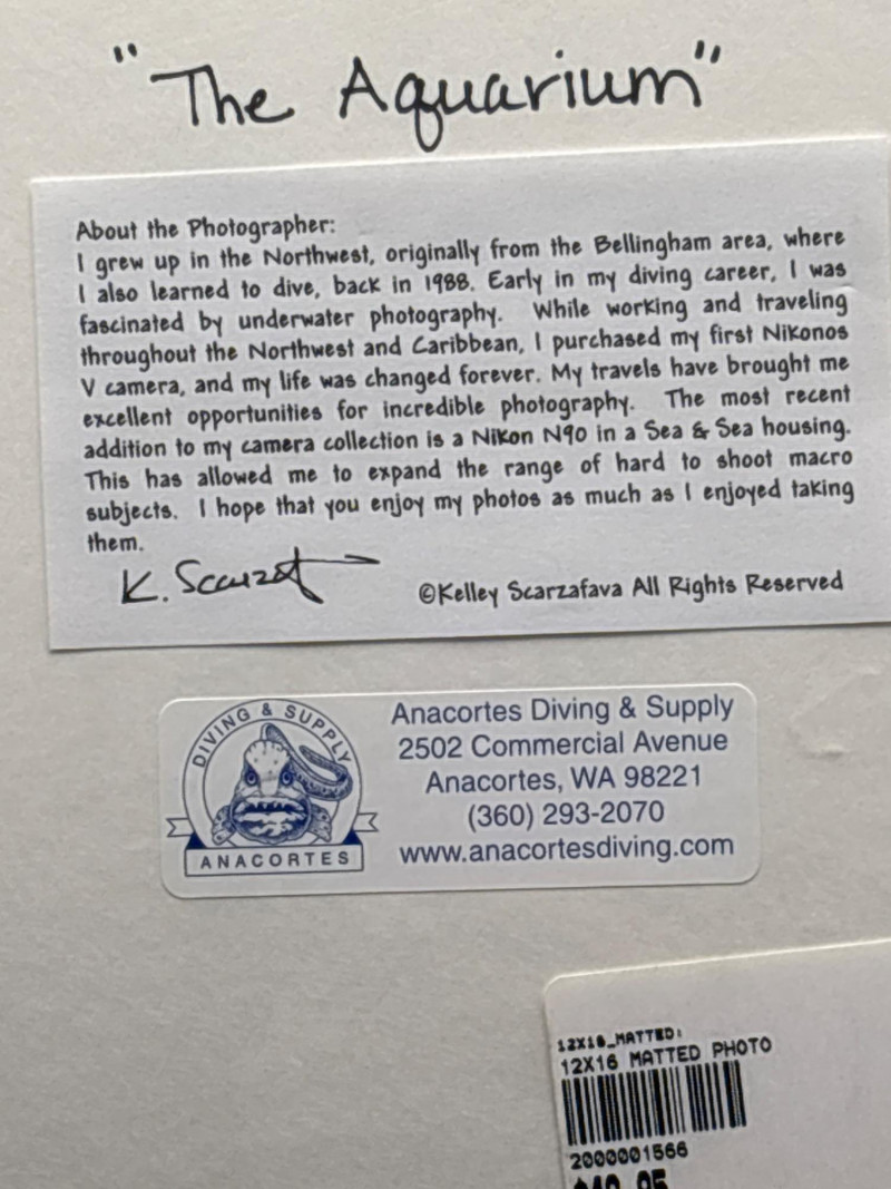 Vibrant underwater reef photograph titled “The Aquarium,” signed by underwater photographer Kelley Scarzafava. Colorful reef scenes like this often attract strong bidding because they capture the beauty and movement of tropical marine life in a way that feels almost like looking into a living aquarium. This striking image features a reef fish swimming through coral formations and sea fans, surrounded by deep blue water and schooling fish in the background. The photograph is signed by the photographer and professionally matted, making it ready for framing or display. Signed underwater photography like this appeals to collectors because it combines marine wildlife, travel photography, and a signed piece from a working underwater photographer. • Title: “The Aquarium” The back includes information about the photographer and a label from Anacortes Diving & Supply, reflecting Scarzafava’s background in Pacific Northwest diving and underwater photography. Underwater reef photography is popular for: • Coastal and beach home décor The vivid blues and coral colors create a dramatic focal point for any room, which is why reef photography often performs well in auctions. Protected in plastic wrapping to help preserve the photograph. 📦 Shippable Reef ecosystems are some of the most biodiverse environments in the ocean. Photographers like Scarzafava use specialized underwater equipment to capture scenes like this while diving, often working in challenging lighting and underwater conditions.