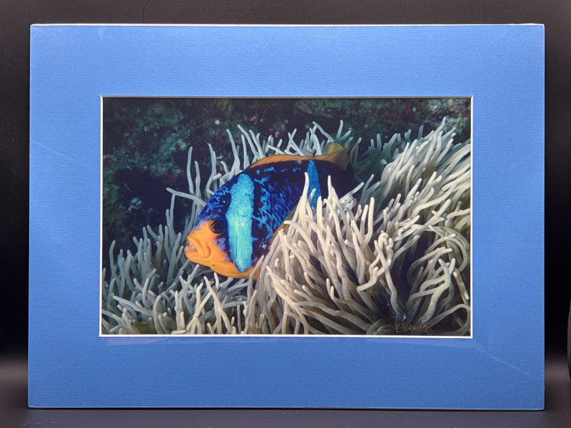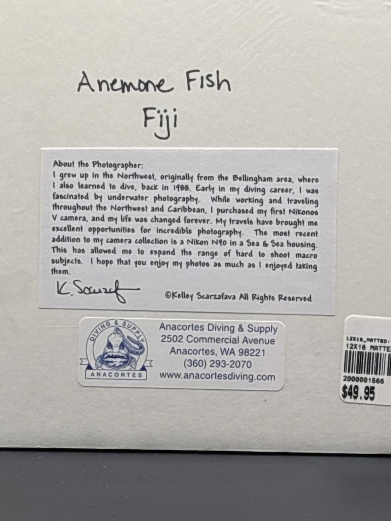 Beautiful underwater photograph of an anemone fish taken in Fiji and signed by underwater photographer Kelley Scarzafava. This vibrant reef image captures the striking colors of the fish nestled among flowing sea anemone tentacles, creating a dramatic ocean scene that immediately draws the eye. The photograph is professionally matted in a blue mat that complements the vivid colors of the reef life. It is signed by the photographer and includes information about Scarzafava’s underwater photography background and connection to the Pacific Northwest diving community. This piece was sold through Anacortes Diving & Supply, a well-known local dive shop, and reflects the photographer’s passion for documenting marine ecosystems around the world. Perfect for: Coastal décor Ocean or beach homes Scuba diving enthusiasts Marine life collectors Colorful wall art displays • Photographer: Kelley Scarzafava Photo is wrapped in protective plastic. 📦 Shipping available. Anemone fish (often called clownfish) live in a symbiotic relationship with sea anemones, using the stinging tentacles for protection while helping keep the anemone clean. Photographs capturing this interaction are especially popular among underwater photography collectors.