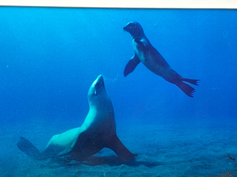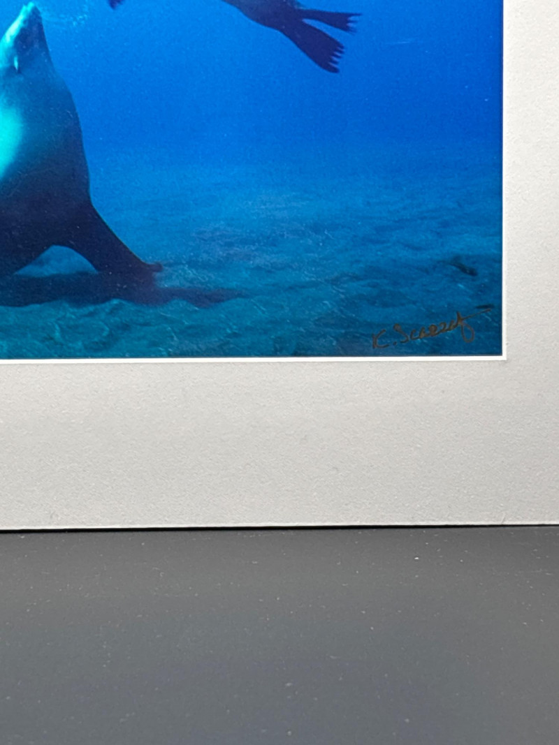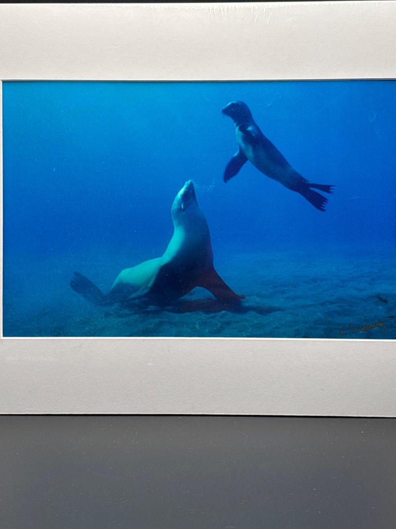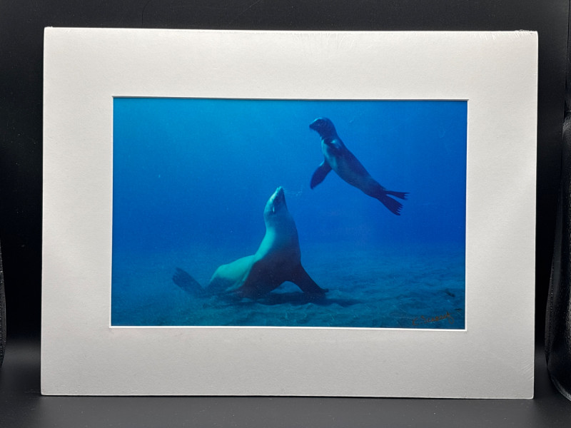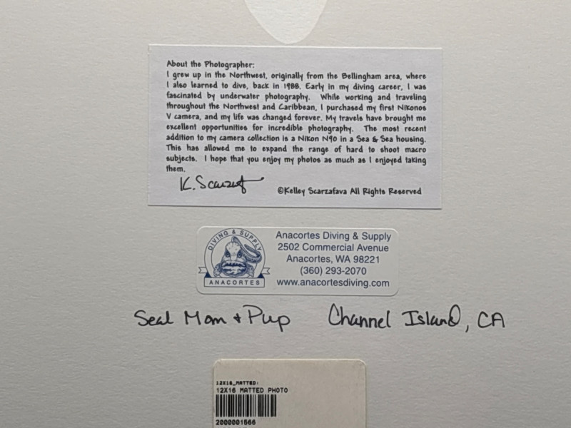Beautiful underwater wildlife photograph titled “Seal Mom & Pup – Channel Islands, CA,” signed by underwater photographer Kelley Scarzafava. This touching image captures a rare moment between a mother seal and her pup interacting underwater, creating a peaceful and emotional marine wildlife scene. The photograph shows the graceful movement of the two seals suspended in deep blue ocean water, highlighting the playful and curious nature of marine mammals in their natural environment. Images like this are especially appealing because they capture authentic wildlife behavior beneath the ocean surface. This piece is signed by the photographer and includes Scarzafava’s photographer information on the back, along with a label from Anacortes Diving & Supply, reflecting the photographer’s Pacific Northwest diving roots. Professionally matted and ready for framing or display, this ocean wildlife photograph makes a striking piece for coastal décor or marine life collectors. • Title: Seal Mom & Pup Good overall condition. 📦 Shipping available. The Channel Islands off the California coast are known for their rich marine ecosystems and large populations of sea lions and seals. Underwater encounters like this often occur when curious pups approach divers while learning to swim and hunt.