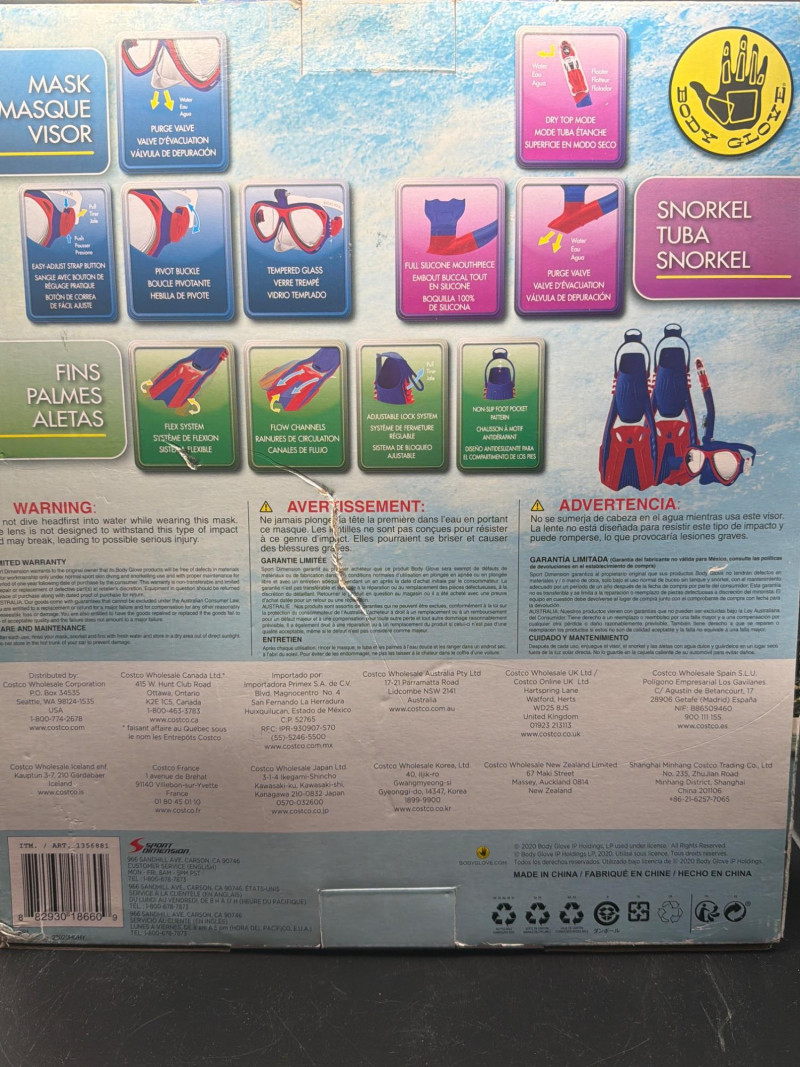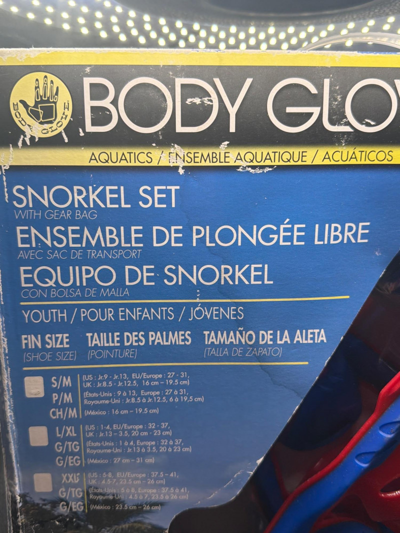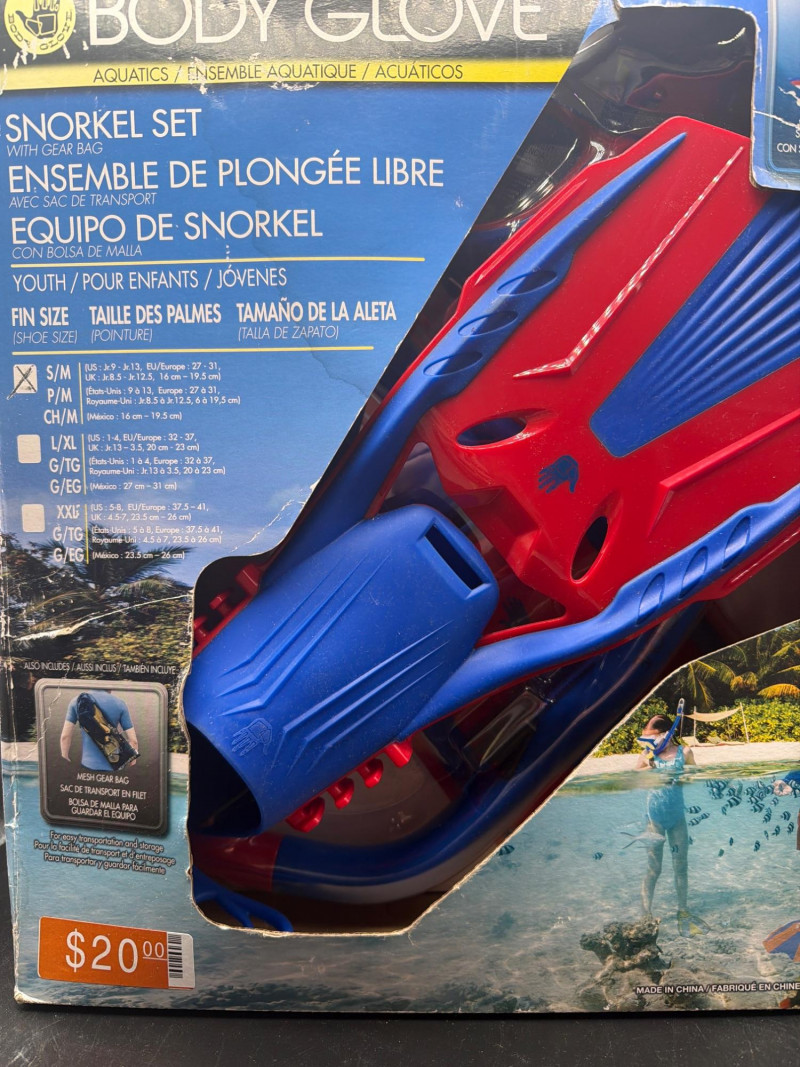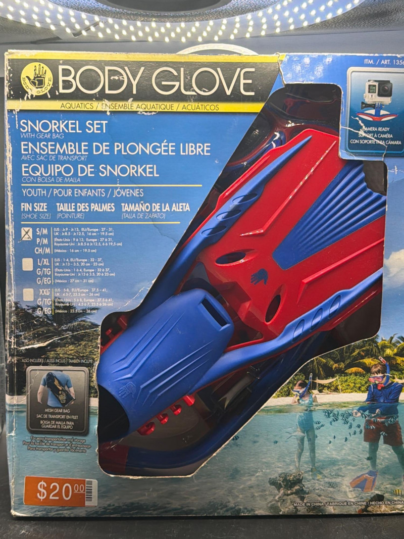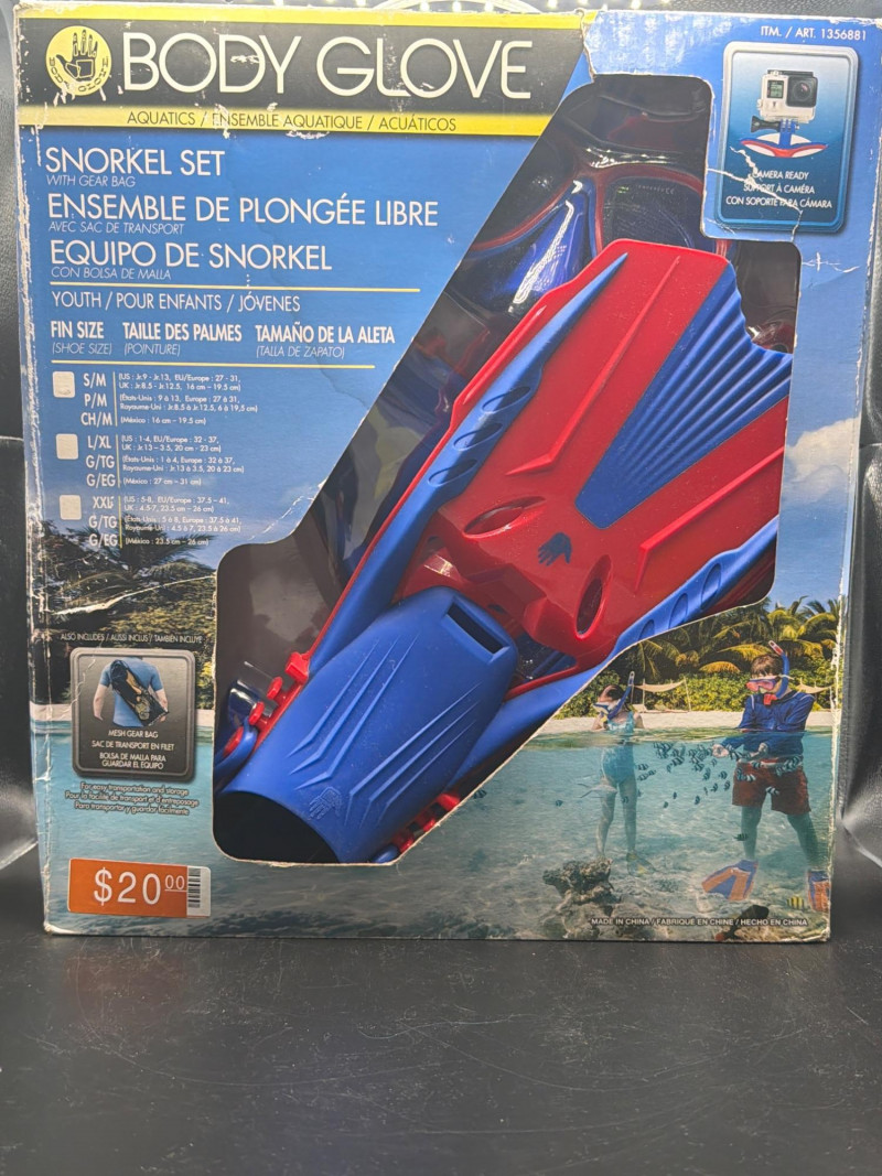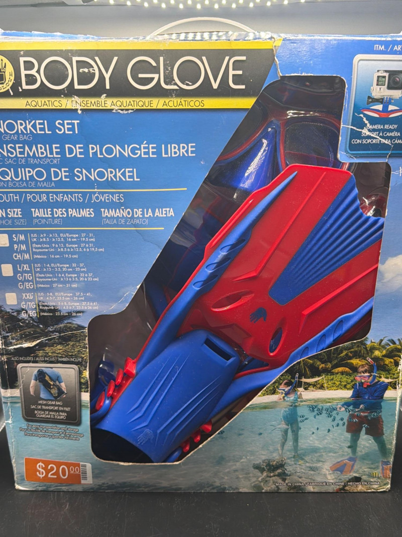 New Body Glove Youth Snorkel Set including mask, snorkel, and adjustable fins, still sealed in original retail packaging. This complete snorkeling kit is designed for youth swimmers and beginner snorkelers, making it a fun starter set for exploring pools, lakes, and ocean shallows. The set includes a snorkel mask for clear underwater viewing, a breathing snorkel tube, and adjustable swim fins designed to help young swimmers move easily through the water. Body Glove is known for producing reliable water sports gear, and this set offers a simple all-in-one option for kids who want to experience snorkeling. With warmer weather approaching, sets like this are popular for family vacations, beach trips, swimming activities, and summer outdoor fun. It can also make a great gift for kids who enjoy water activities. New in box. Item appears unopened in original retail packaging. Packaging may show minor shelf wear from storage or handling. Please review photos carefully for exact condition. 📦 Shipping available. Body Glove has been producing water sports equipment and surf gear for decades. Their snorkeling sets are designed to introduce beginners to underwater exploration with easy-to-use equipment. Snorkeling allows swimmers to observe underwater environments while breathing comfortably through a snorkel tube, making it a popular activity for vacations, coastal trips, and recreational swimming. Complete starter kits like this provide all the essential gear in one package, making them convenient for families and young swimmers who want to try snorkeling.