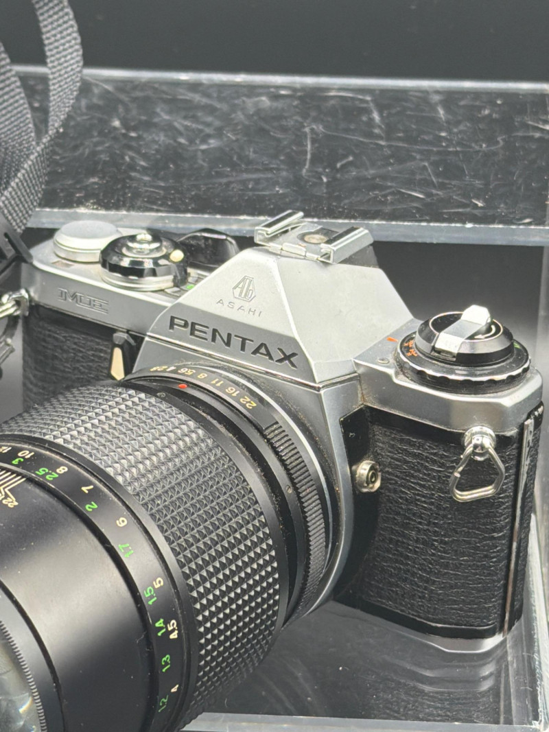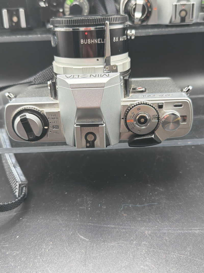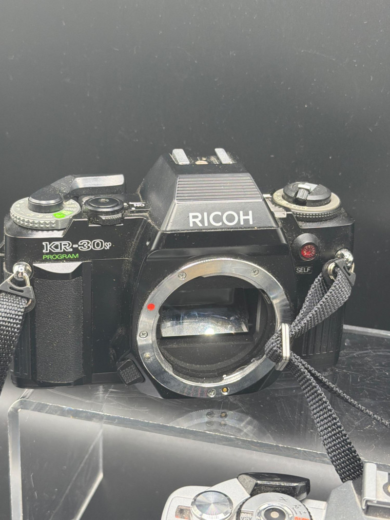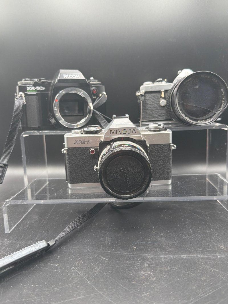 Vintage 35mm SLR camera lot featuring three classic film cameras from well-known brands Pentax, Ricoh, and Minolta. These mechanical cameras represent the era when manual photography dominated and are popular with collectors, film photography enthusiasts, and vintage camera hobbyists. The lot includes a Pentax SLR camera with a telephoto lens attached, a Ricoh KR-30SP Program camera body, and a Minolta SLR camera body with a lens. These cameras were designed for 35mm film photography and feature manual controls that allow photographers to adjust focus, aperture, and shutter settings. Vintage SLR cameras like these remain popular among collectors and photographers who enjoy the look and experience of traditional film photography. They are also commonly used for display, restoration projects, or for photographers exploring analog photography. Condition appears used with normal cosmetic wear consistent with age and storage. Cameras have not been tested and are being sold as found. Lenses and bodies show typical signs of vintage equipment such as light wear and dust. Please review photos carefully for exact condition. 📦 Shipping available. During the 1970s and 1980s, companies such as Pentax, Minolta, and Ricoh produced reliable 35mm SLR cameras used by hobbyists and professional photographers around the world. These cameras relied on manual focus lenses and mechanical shutter systems, giving photographers full control over exposure and composition. Film photography has seen renewed interest in recent years, with many photographers enjoying the unique aesthetic and hands-on process that analog cameras provide. Vintage SLR cameras also remain collectible due to their classic mechanical construction, interchangeable lenses, and historic role in photographic technology.