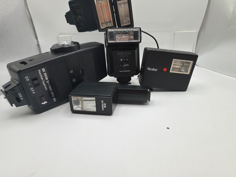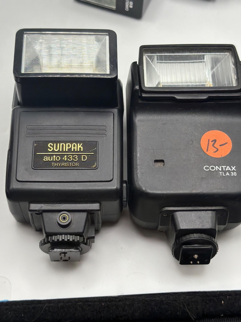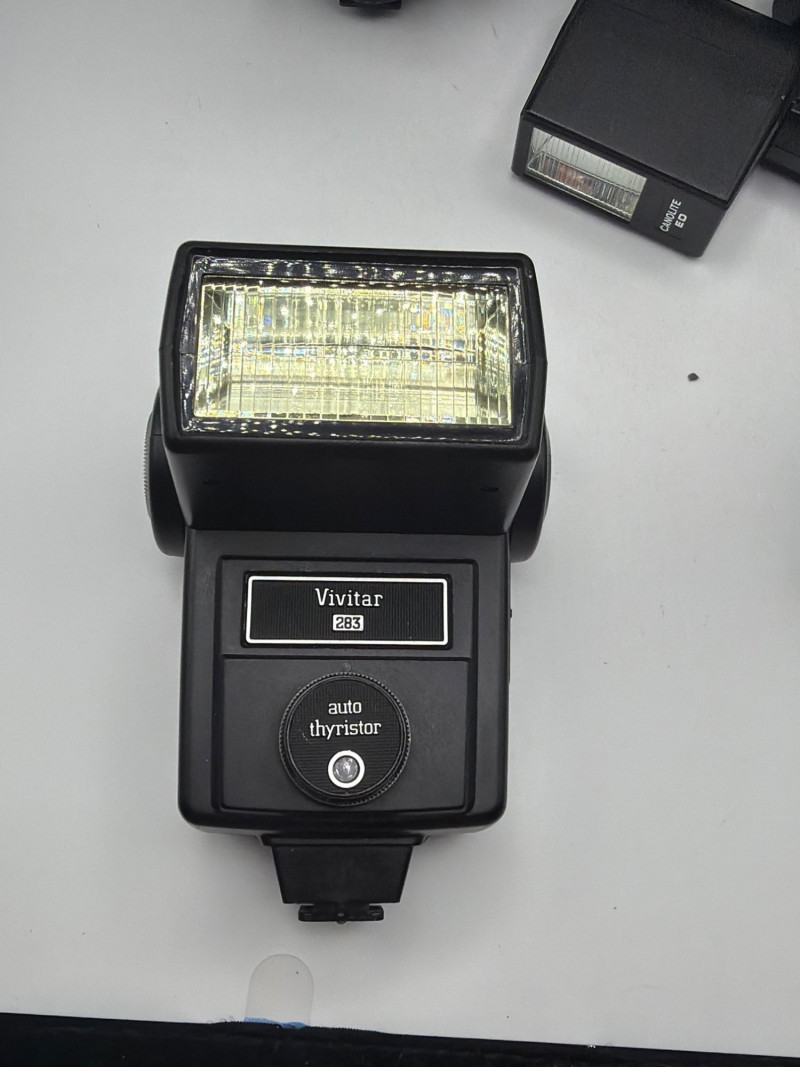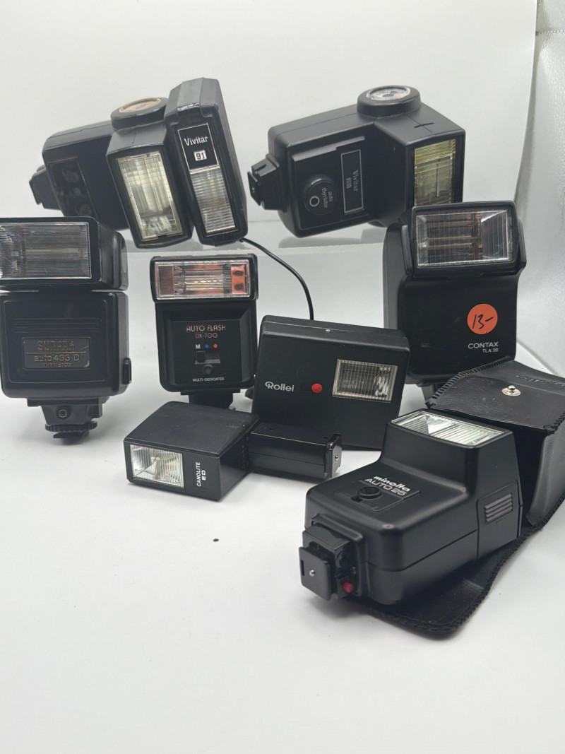 A large lot of vintage camera flash units from well-known photography brands, including Vivitar, Sunpak, and Minolta. These flash attachments were commonly used with 35mm SLR cameras and remain popular with collectors, film photography enthusiasts, and vintage camera hobbyists. The lot includes multiple hot-shoe style flash units in various sizes and models, along with at least one flash carrying case. Brands visible include Vivitar, Sunpak Auto 433D Thyristor, and Minolta Auto 25, among others. External flash units like these were widely used with film cameras to provide additional lighting for indoor photography, portraits, and low-light situations. Many vintage photographers still enjoy using classic flash units with analog cameras or adapting them for modern setups. This is a mixed lot with several pieces included, offering a good assortment for collectors, restoration projects, or photographers working with vintage equipment. Items appear used with typical cosmetic wear consistent with age and storage. Units have not been tested and are being sold as found. Some may include cases or accessories. Please review photos carefully for exact condition. 📦 Shipping available. During the film photography era, external flash units were essential accessories for photographers using 35mm SLR cameras. Brands such as Vivitar, Sunpak, and Minolta produced widely used flash units that attached to the camera’s hot shoe or connected with sync cords. Many models used thyristor automatic exposure systems, which helped control flash output based on subject distance and available light. These flashes were widely used for indoor photography, event photography, and portrait work. Today, vintage flash units remain collectible and are often used with film cameras, adapted to digital cameras, or displayed as part of vintage photography collections.