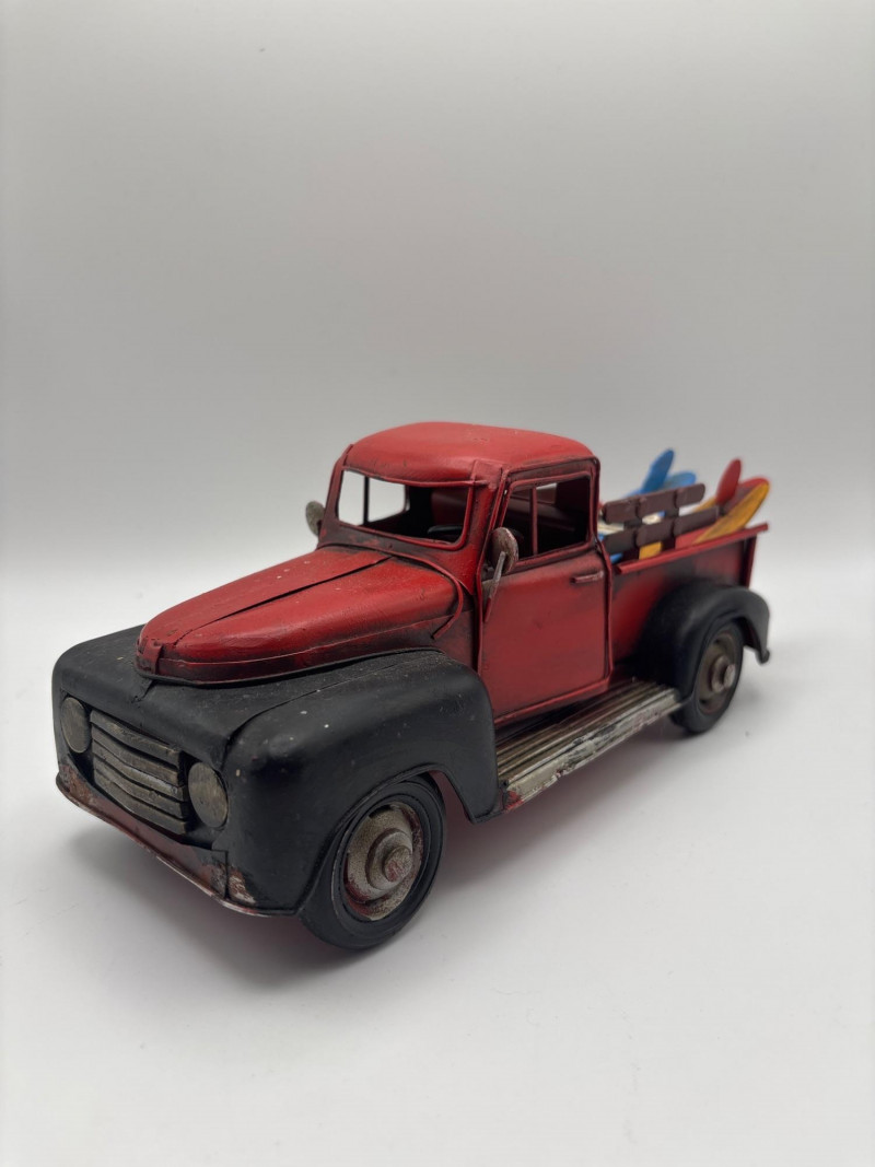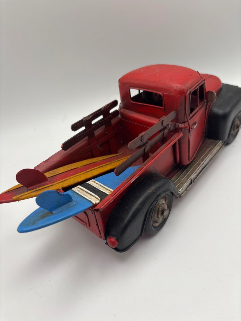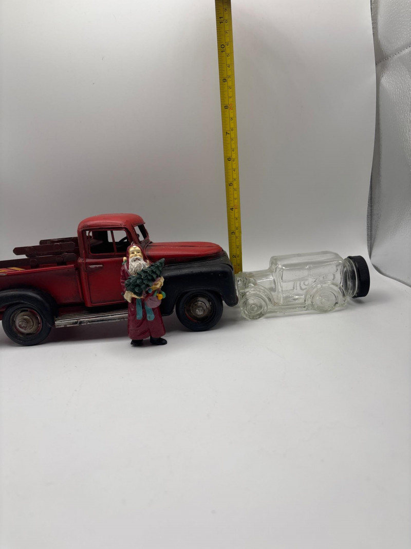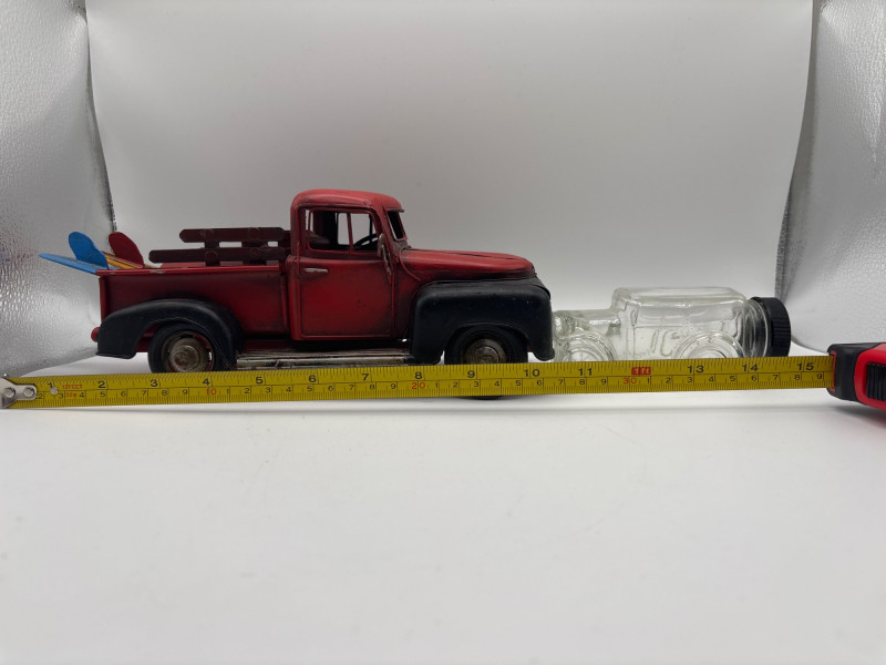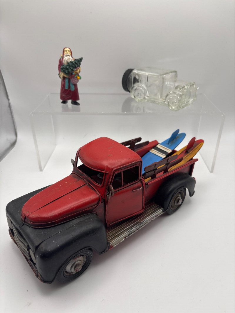 Unique vintage decorative lot featuring a rustic red pickup truck carrying surfboards, a Santa figurine, and a glass car-shaped bottle. The pickup truck has a weathered vintage look and includes colorful surfboards in the bed, giving it a fun coastal or beach-themed display style. Also included is a Santa figurine holding a small tree and sack, along with a clear glass car-shaped bottle that adds a collectible accent to the group. This mixed lot works well for coastal décor, beach house decorating, rustic displays, or vintage vehicle collections. It also fits nicely into holiday displays with the included Santa figure. Approximate sizes (based on tape measure in photos): Red pickup truck: approx. 8–9 inches long Santa figurine: approx. 3–4 inches tall Glass car bottle: approx. 4–5 inches long Please review photos carefully for all items included. Pre-owned decorative items with normal wear consistent with age and display. The truck shows light paint wear and rustic styling. Please review photos carefully for overall condition. Shipping available. Combined shipping is offered for multiple auction wins whenever possible. Vintage pickup truck décor pieces have become very popular in farmhouse, coastal, and rustic decorating styles. Trucks carrying items like surfboards, trees, or seasonal accessories are commonly used in shelf displays, holiday décor, and themed room decorations. Novelty glass bottles shaped like vehicles were often produced as collectible items or souvenir bottles and are still collected today.