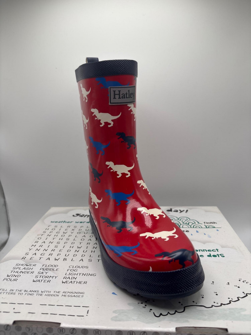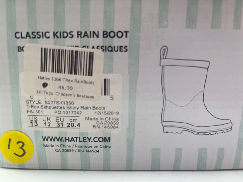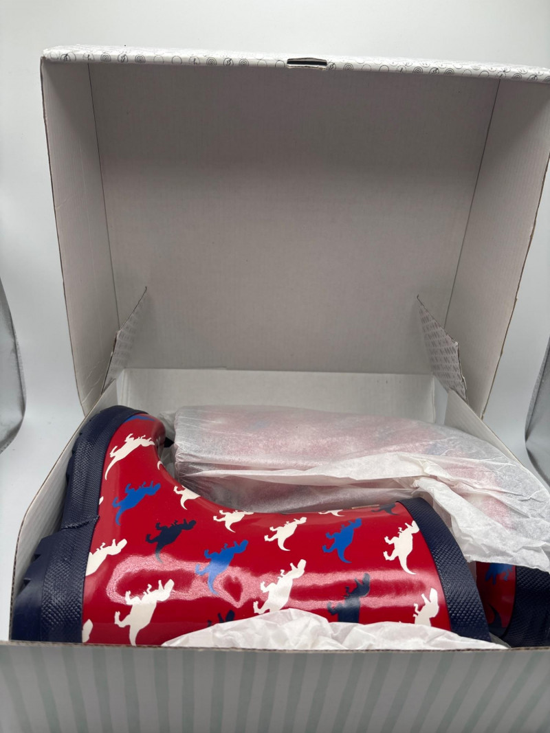 Fun Hatley children’s rain boots featuring a colorful T. rex dinosaur pattern, offered new in the original box. These classic kids' rain boots are designed to keep little feet dry while adding a playful style with bright dinosaur graphics. Hatley is well known for their durable and comfortable children's rainwear, and these boots feature a sturdy rubber construction with an easy pull-on design that makes them perfect for rainy days, puddle jumping, and outdoor adventures. This pair is children’s size 13 and comes in the original retail box. With Easter approaching, items like these can also make great additions to Easter baskets, egg hunt prizes, or springtime gifts for kids. Please review the photos for the exact item included. New in box (NIB). Boots appear unused and come with original packaging. Box may show minor storage wear. Please see photos for details. Shipping available. Combined shipping offered for multiple auction wins whenever possible. Hatley is a Canadian brand recognized for its colorful children’s rainwear, boots, and outdoor clothing. Their rain boots are designed with waterproof rubber construction and fun themed prints that make rainy weather activities more enjoyable for kids. The dinosaur pattern is a popular design among children's clothing and footwear, combining playful graphics with practical outdoor wear.