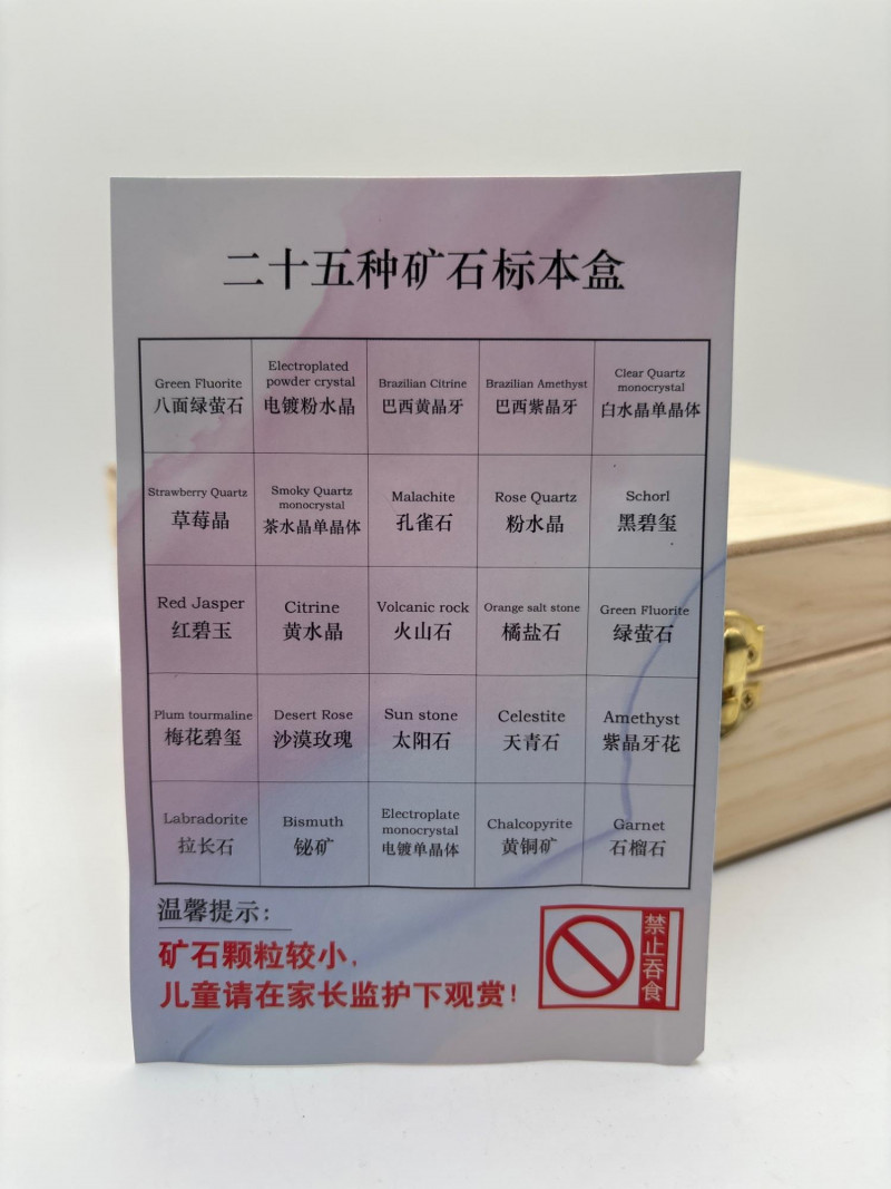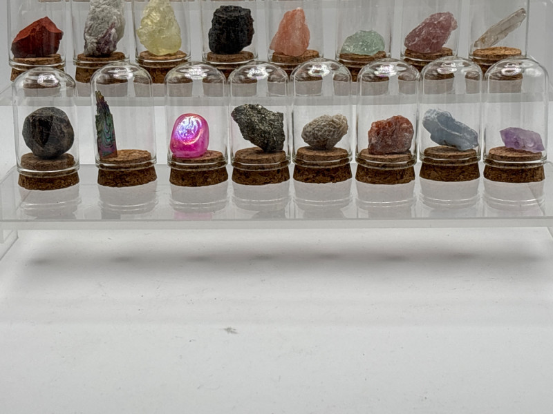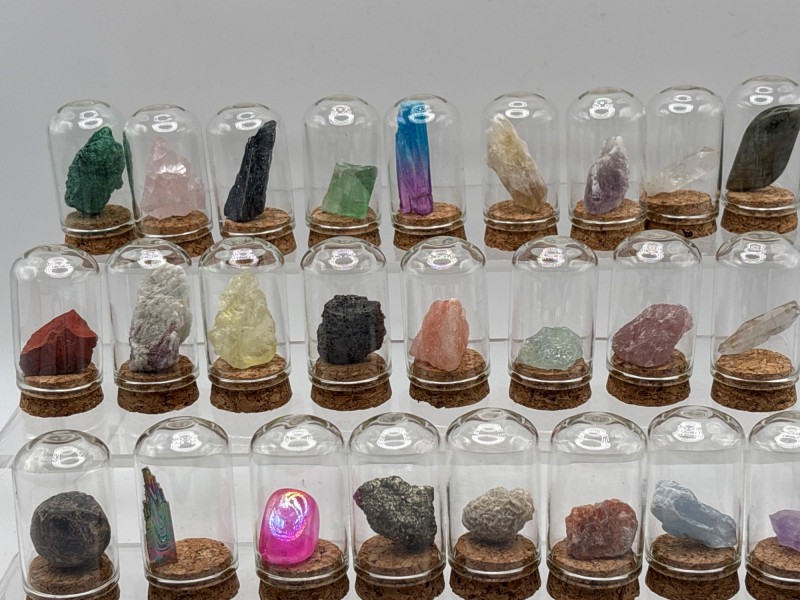 Beautiful 25-piece mineral and crystal specimen collection presented in a wooden display box. Each specimen is individually protected under a small glass dome and cork base, creating an attractive and organized mineral display. The set includes a variety of minerals and crystals such as amethyst, citrine, rose quartz, garnet, malachite, fluorite, labradorite, bismuth, chalcopyrite, desert rose, and others. A printed identification chart is included showing the names of the minerals in the collection. This style of mineral set is popular with rock collectors, science enthusiasts, students, and educational displays, as it allows viewers to easily compare different crystal formations and colors. The wooden case provides convenient storage and display, making it suitable for desks, shelves, classrooms, or collections. With Easter approaching, unique educational items like this can also make great additions to Easter baskets, egg hunt prizes, or gifts for kids interested in science and geology. Please review photos carefully for the exact items included. Appears very clean and lightly handled, and presents almost like new. Specimens are stored under glass domes inside the wooden display case. Please review photos for overall condition. Shipping available. Combined shipping offered for multiple auction wins whenever possible. Mineral specimen collections like this are commonly used in geology education, hobby collecting, and classroom science demonstrations. Sets featuring multiple crystal types allow collectors and students to observe differences in color, structure, and mineral composition. Specimens such as amethyst, citrine, labradorite, garnet, and malachite are among the most recognizable minerals and are frequently included in beginner geology collections. These display-style sets are also popular with collectors because the glass domes protect the specimens while allowing them to be viewed clearly from all sides.
