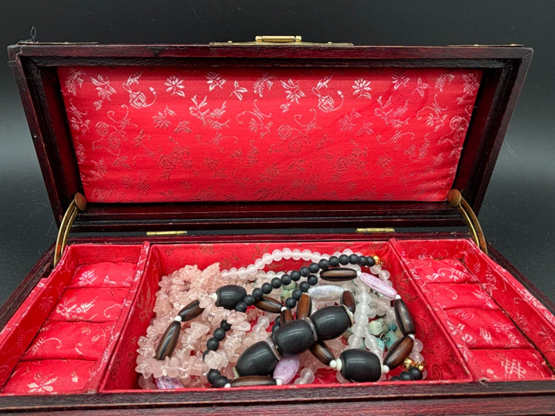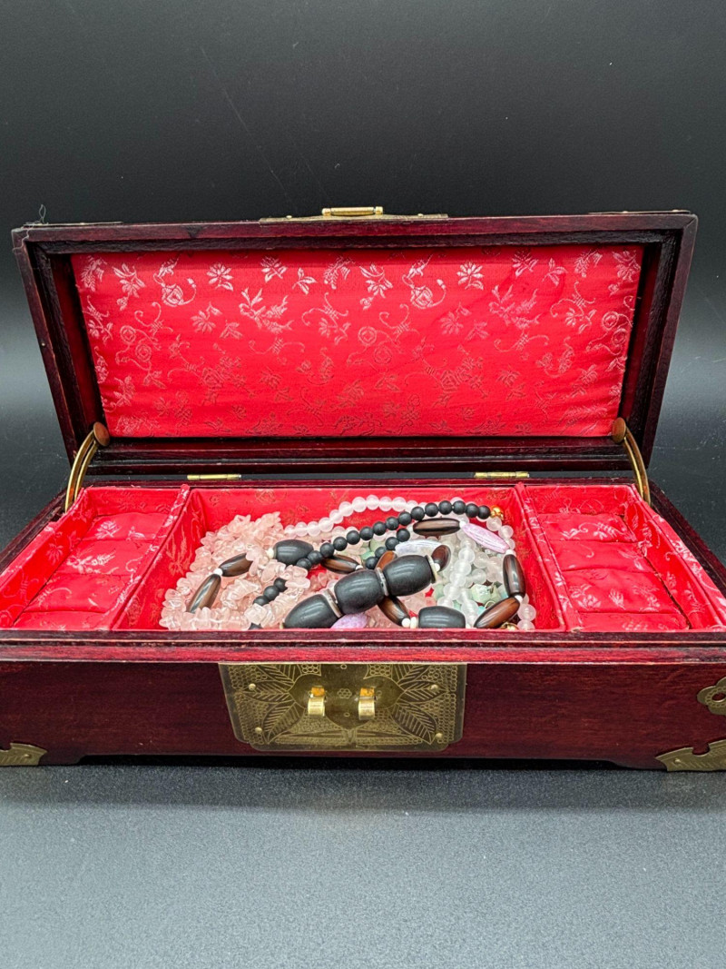 SHIPPABLE Beautiful vintage Asian-style wooden jewelry box featuring rich red-toned wood, ornate brass corner hardware, and carved stone-style inlay panels on the lid. The decorative jade-tone carvings add an elegant, traditional touch. The interior is lined in vibrant red fabric with floral patterning and includes divided compartments and padded ring slots for organized storage. Hinged lid with decorative brass latch closure. Features: Red-stained wood exterior Brass corner guards and latch Carved stone-style inset panels on the lid Red fabric-lined interior Divided compartments and ring slots Hinged lid Includes assorted costume jewelry pieces as shown (sold together). Condition: A lovely decorative storage piece perfect for jewelry, keepsakes, or display.