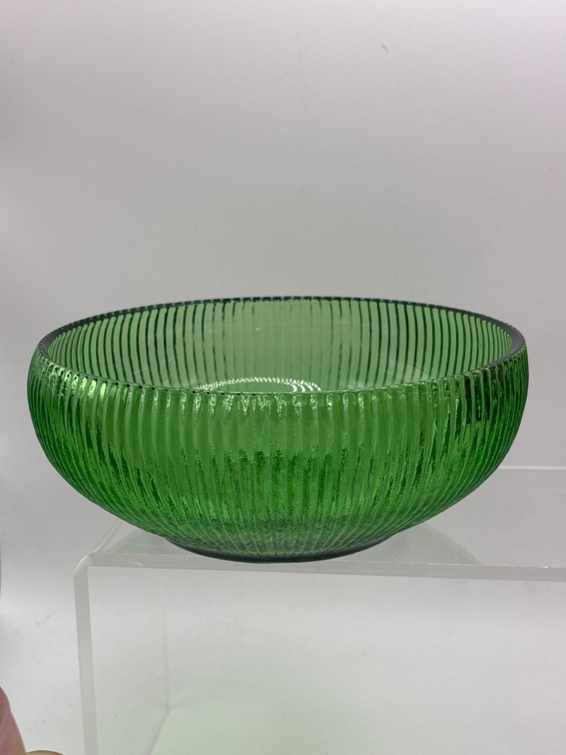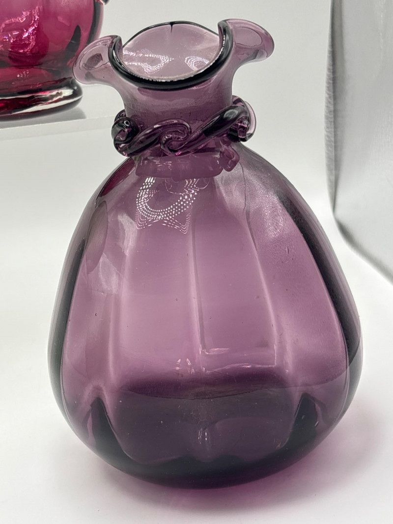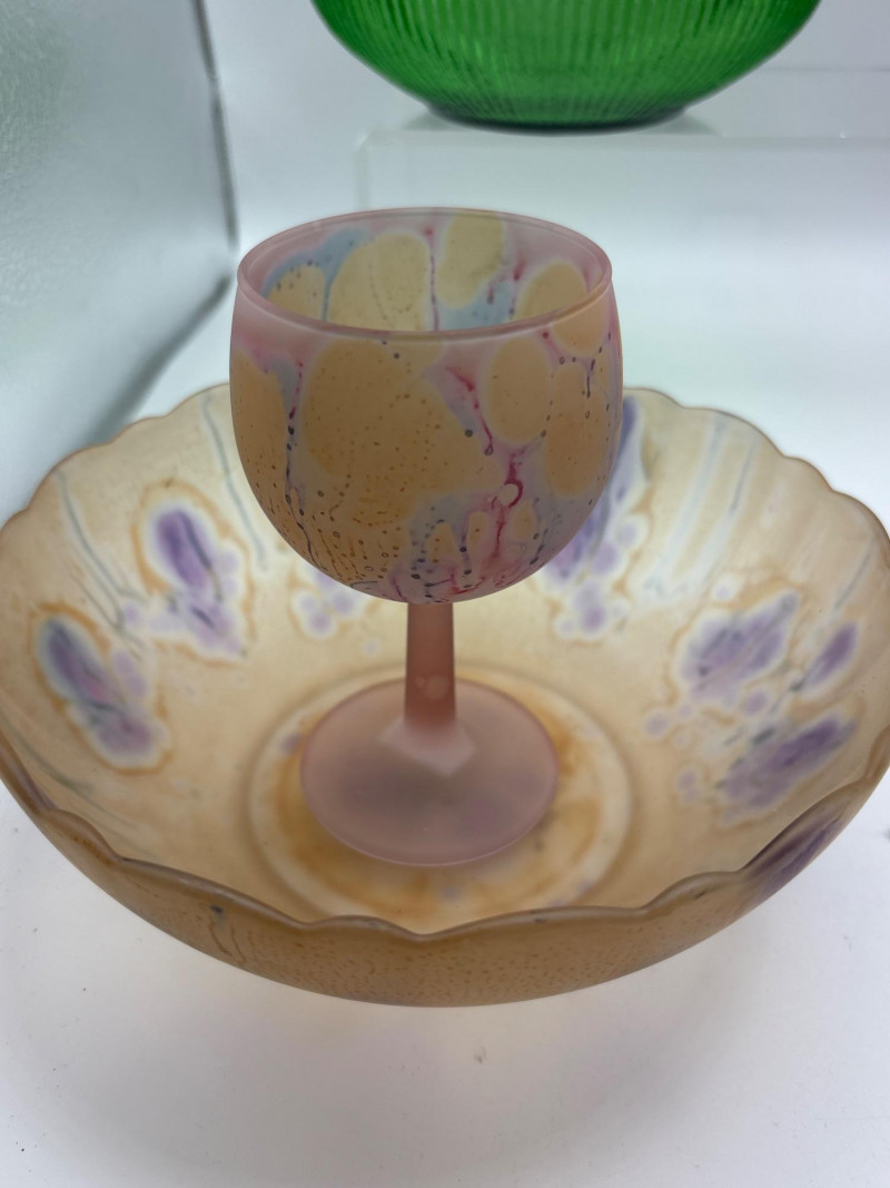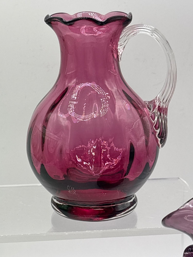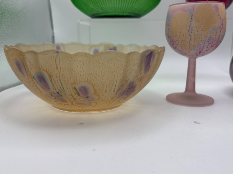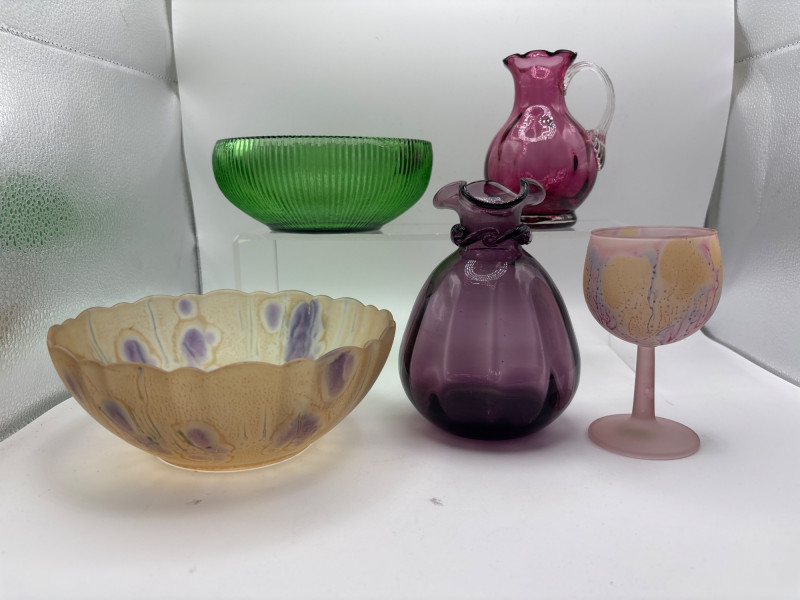 Beautiful vintage art glass collection featuring five decorative glass pieces in a variety of colors and styles. This charming lot includes bowls, a vase, a pitcher, and a goblet, all with unique shapes and vibrant glass finishes. Items included in this lot: Green glass bowl with ribbed sides – approximately 2.5 inches tall x 11 inches wide Pink art glass pitcher / ewer with handle and flared rim – approximately 5 inches tall x 3 inches wide Purple glass vase with rounded body – approximately 3.5 inches tall x 4 inches wide Iridescent scalloped bowl with pastel decorative accents – approximately 2.5 inches tall x 7 inches wide Iridescent stemmed goblet in peach-pink tones – approximately 4.5 inches tall x 3 inches wide Each piece has its own character, making this a lovely mixed art glass display lot. The colors range from bright green and soft pink to deep purple and shimmering iridescent finishes. These pieces would look wonderful in a curio cabinet, vintage glass collection, cottage décor display, or colorful centerpiece arrangement. Please review photos carefully for details and condition. Pre-owned condition with light wear consistent with display and age. No major damage observed. See photos for details. 📦 Shippable Decorative art glass pieces like these were widely produced throughout the mid-20th century, often featuring bold colors, ribbed textures, and iridescent finishes. Mixed glass collections are popular with collectors because they create eye-catching layered displays of color and light.