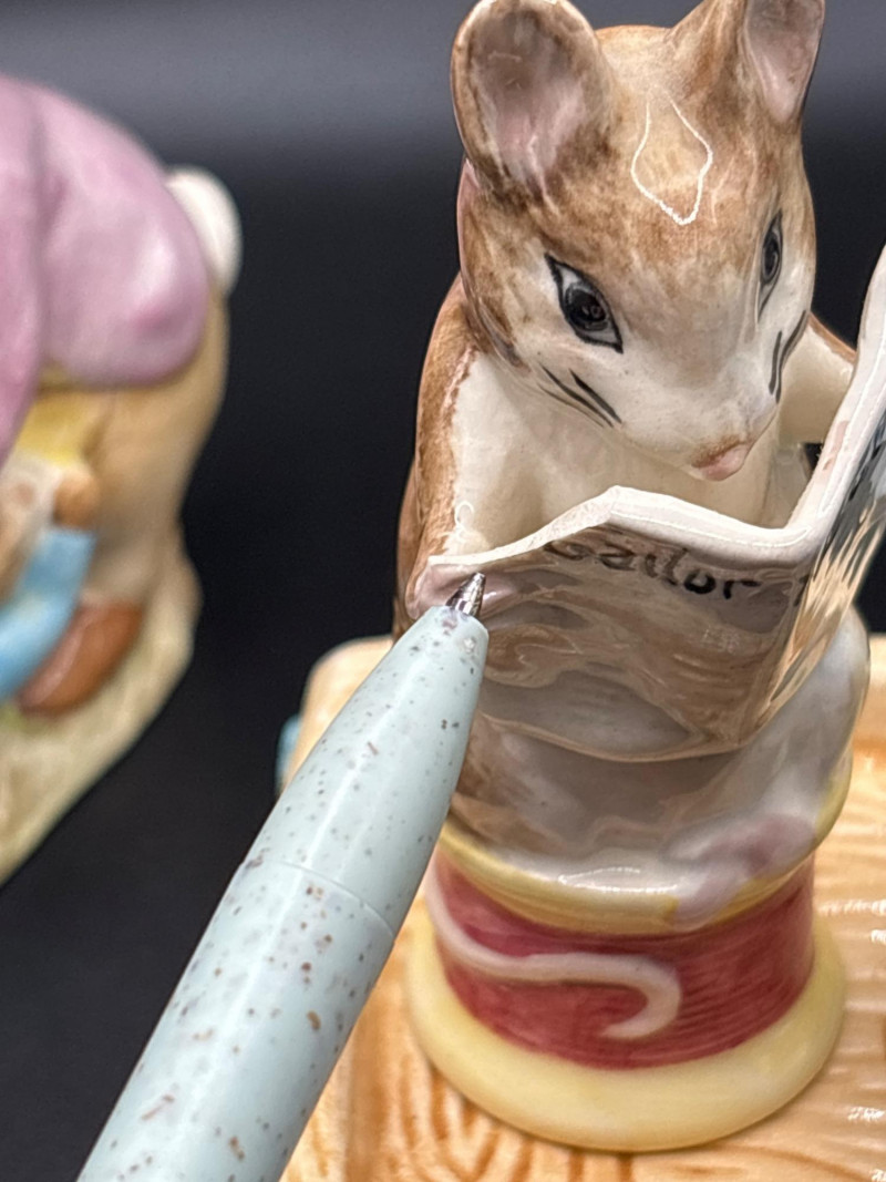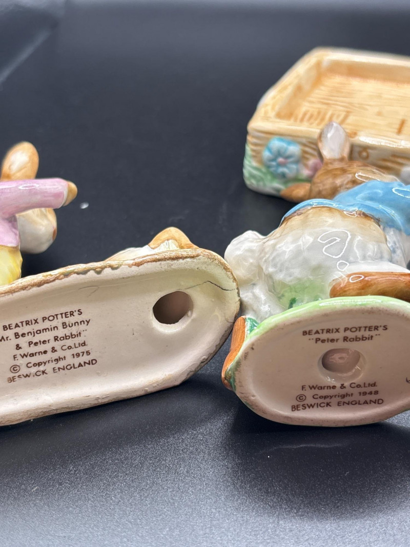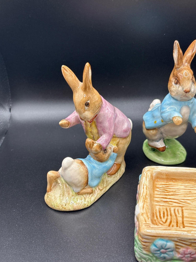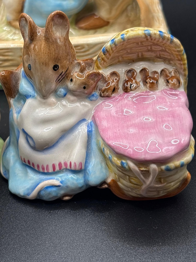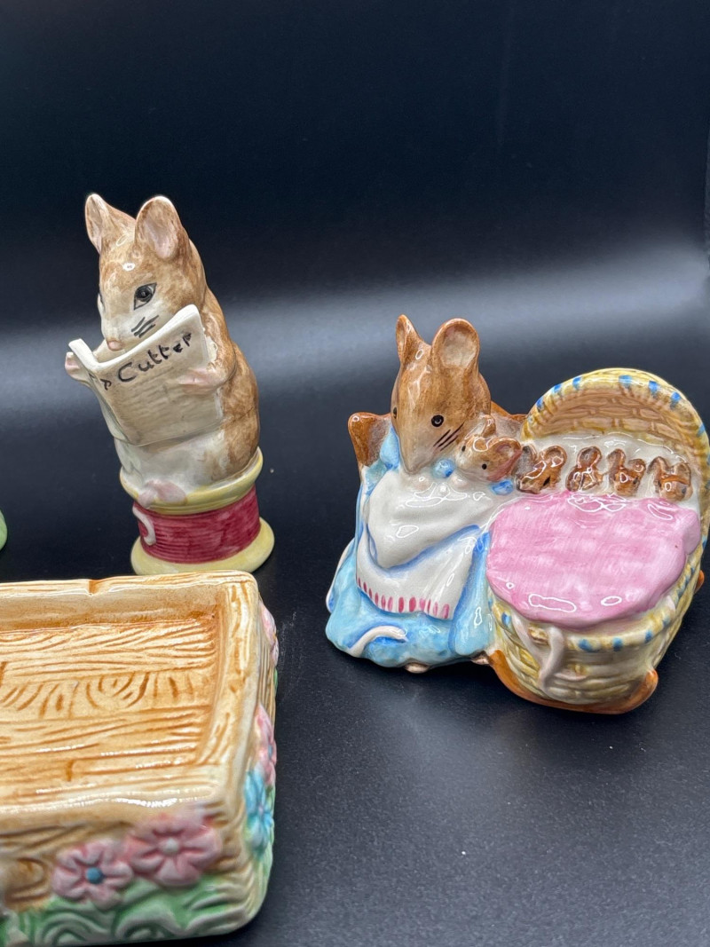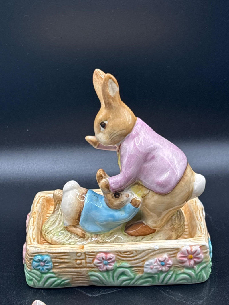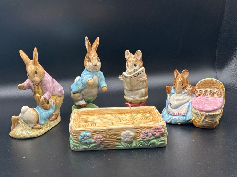 Charming Beatrix Potter figurine lot featuring several beloved storybook animal characters along with a decorative floral display stand. These collectible figurines capture the whimsical style inspired by the classic children's stories created by Beatrix Potter. This lot includes four Beatrix Potter figurines, each measuring approximately 4 inches tall, along with two additional decorative display pieces. Items included in the lot: Beatrix Potter rabbit figurine Beatrix Potter rabbit figurine in a blue jacket Beatrix Potter mouse figurine holding a newspaper (note: this piece has damage – see photos) Beatrix Potter rabbit figurine seated with a basket full of babies Decorative floral stage/display stand (not Beatrix Potter) The figurines feature hand-painted details and soft pastel colors, typical of Beatrix Potter collectible figures. The floral stage piece can be used to create a charming storybook-style display for the figurines. This lot would make a wonderful addition to a Beatrix Potter collection, nursery décor, storybook display, or vintage figurine collection. Please review the photos carefully for details and condition. Pre-owned condition with light wear consistent with age and display. The mouse figurine holding the newspaper has damage as shown in the photos. Other pieces appear in good display condition. 📦 Shippable Beatrix Potter characters, including rabbits and mice, have been widely collected for decades. Figurines inspired by her stories remain popular with collectors due to their charming designs and nostalgic connection to classic children's literature.
