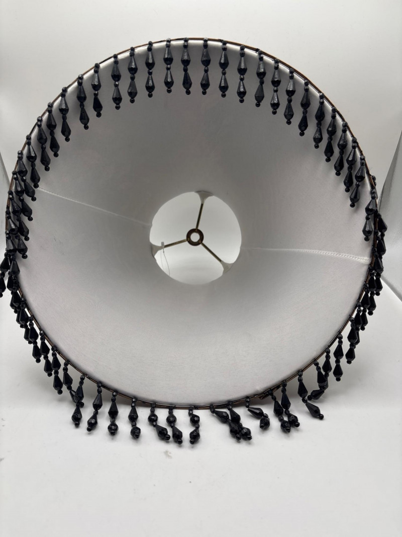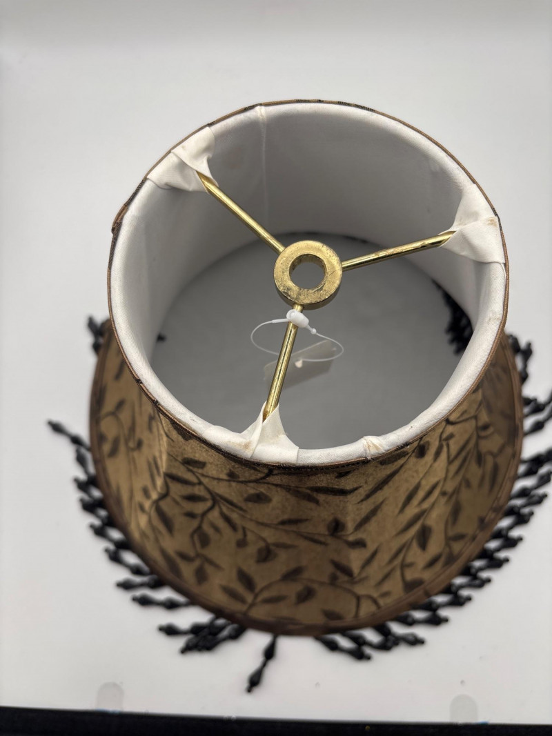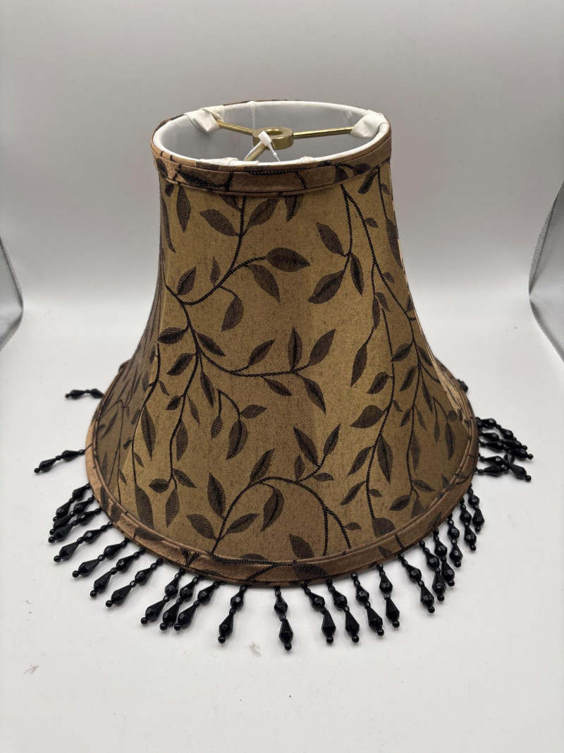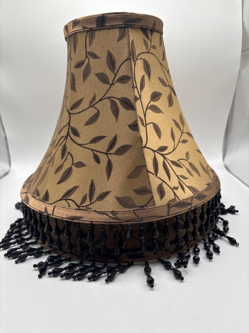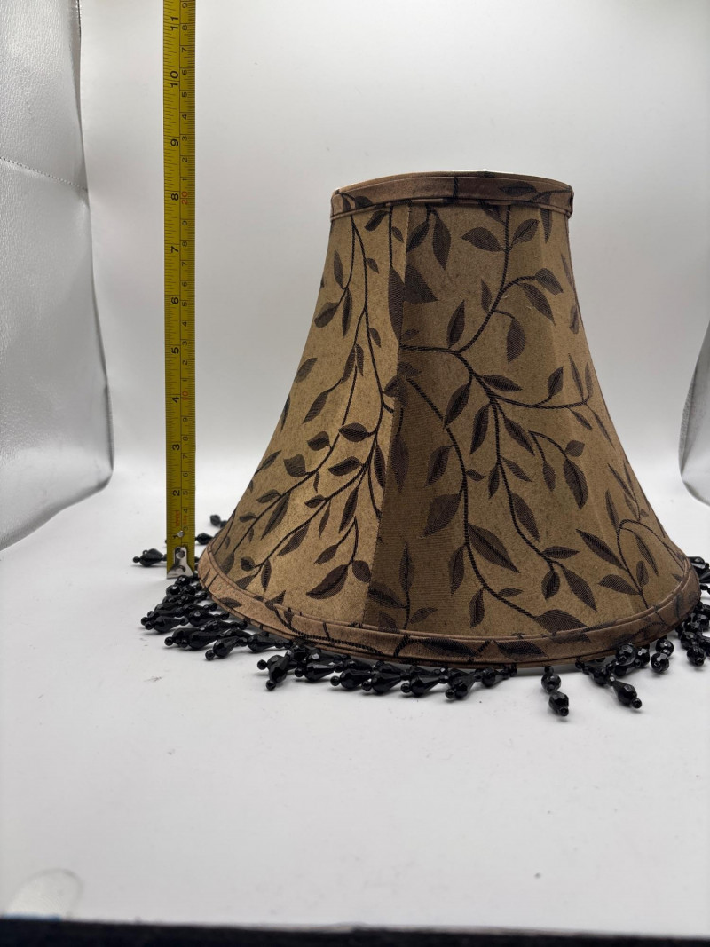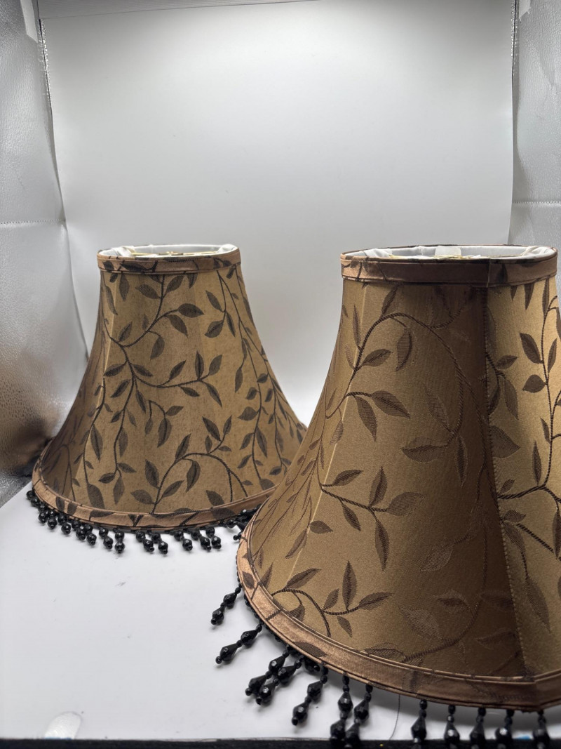 Elegant pair of decorative lamp shades featuring a warm gold-toned fabric with a subtle leaf pattern design. The shades are finished with a beautiful black beaded fringe trim, adding a touch of vintage style and decorative charm. These shades have a classic tapered shape and would work well with table lamps, accent lamps, or traditional décor settings. Approximate measurements: 9 inches tall 11 inches wide The fabric pattern and fringe detail give these shades a refined look that pairs nicely with traditional, vintage, or eclectic home décor styles. Perfect for updating a lamp base while adding a decorative element to a living room, bedroom, or reading area. Please review the photos carefully for details and condition. Pre-owned condition with light wear consistent with use. Fringe and fabric appear intact with normal signs of age. 📦 Shippable Lamp shades with decorative fringe and patterned fabric were especially popular in traditional and vintage interior décor styles. The beaded trim adds texture and visual interest when the lamp is illuminated.