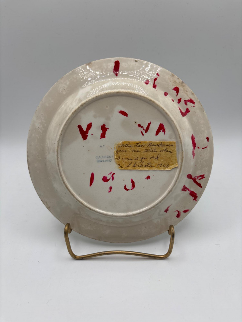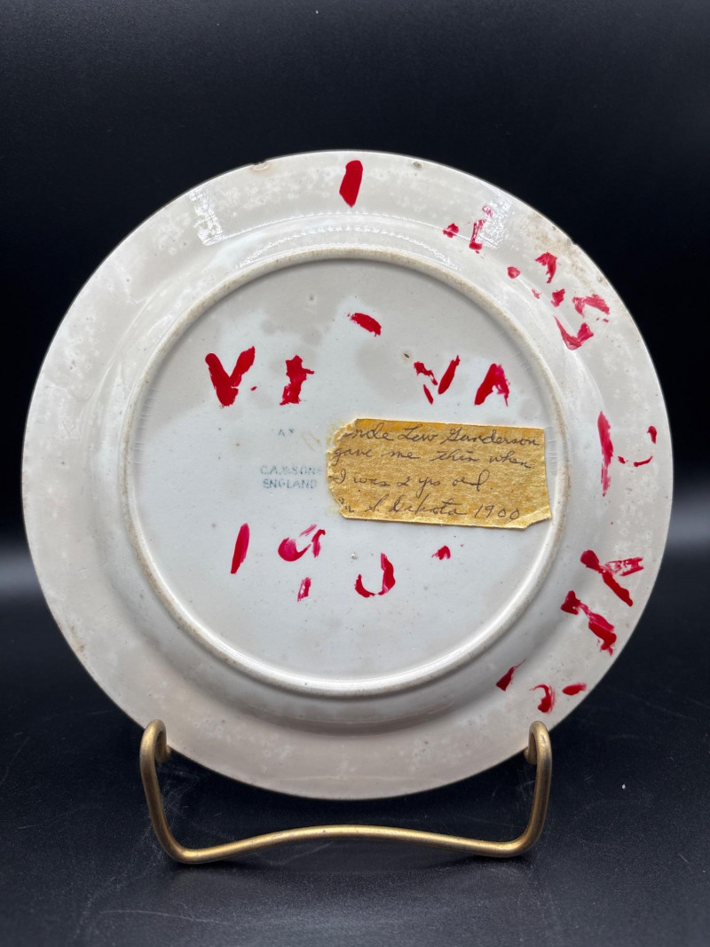 Vintage Copeland Spode commemorative plate featuring the historic “Plymouth Landing 1620” scene in classic blue transferware. The detailed center illustration depicts the Pilgrims’ landing, surrounded by decorative elements associated with early American history. Around the outer rim of the plate is an alphabet border, adding a unique decorative element often found on educational or commemorative china pieces. The plate is marked Copeland Spode on the back and references the Society of Mayflower Descendants. Copeland Spode is a well-known English pottery maker with a long history of producing quality transferware ceramics. Approximate size: 7 inches in diameter The back of the plate also includes a small handwritten note that reads it was given by a two-year-old, adding a personal historical touch from a previous owner. This piece would make a wonderful addition to a transferware collection, historical display, Mayflower memorabilia collection, or colonial-themed décor. Please review photos carefully for details and condition. Pre-owned vintage condition. Some markings and remnants of adhesive or mounting residue are visible on the back. The front design displays nicely. 📦 Shippable Copeland Spode produced many commemorative and historical plates during the late 19th and early 20th centuries. Blue transferware scenes depicting colonial American history and Mayflower heritage remain popular with collectors of historical ceramics.
