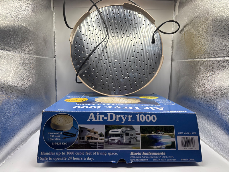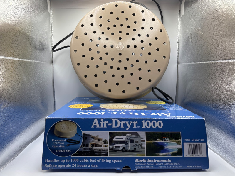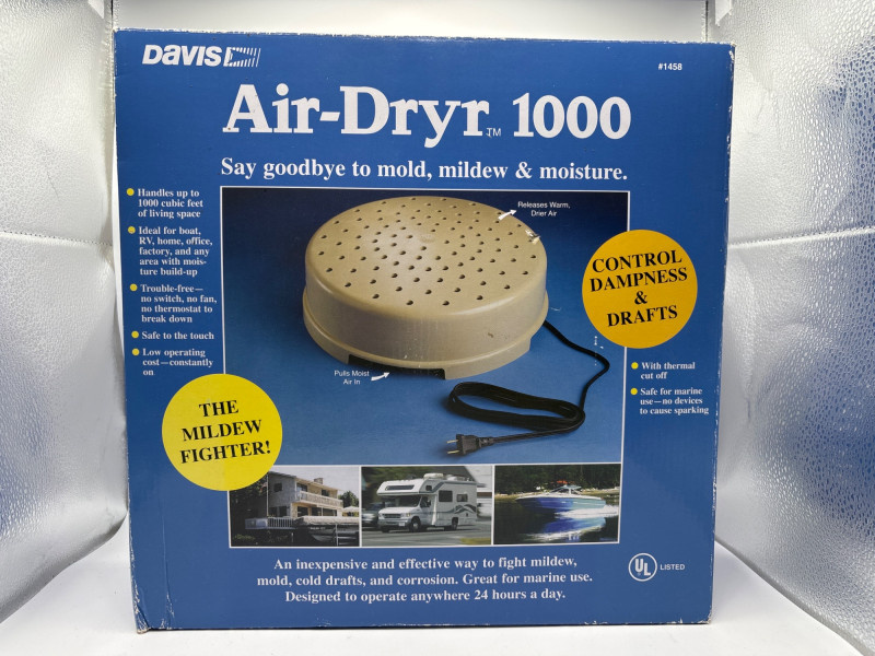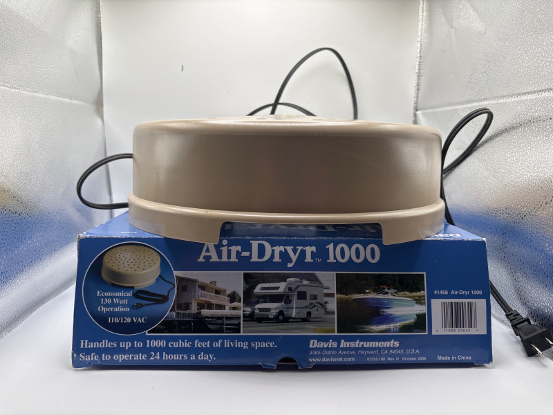Davis Instruments Air-Dryr 1000 moisture control unit is designed to help prevent mold, mildew, and dampness in enclosed spaces. These compact drying units are widely used in boats, RVs, cabins, closets, and storage areas where airflow and moisture control are important. The Air-Dryr 1000 circulates warm air continuously to help keep spaces dry and reduce condensation buildup. It operates quietly and is designed to run safely for long periods, making it a popular solution for seasonal storage or marine environments. According to the manufacturer, the unit can help manage up to approximately 1000 cubic feet of enclosed space, making it suitable for small cabins, storage rooms, campers, or garages. Features: Items like this are popular with boat owners, RV travelers, and anyone storing vehicles or equipment in humid environments. With Easter approaching, practical items like this can also make useful gifts for outdoor enthusiasts, campers, and RV owners preparing for the spring travel season. Please review the photos carefully for the exact item included in this auction. Appears new or very lightly used. The unit has not been tested. The original box shows visible storage and shelf wear. Please review photos for full condition details. Shipping available. Combined shipping offered for multiple auction wins whenever possible. The Air-Dryr series by Davis Instruments is designed to reduce moisture buildup in enclosed environments without the need for a traditional compressor dehumidifier. By circulating slightly warmed air, the unit helps reduce condensation and discourage mold and mildew growth. These devices are especially common in marine applications, RV storage, seasonal cabins, and equipment storage areas, where maintaining dry air can help protect interiors and stored items.