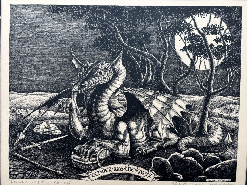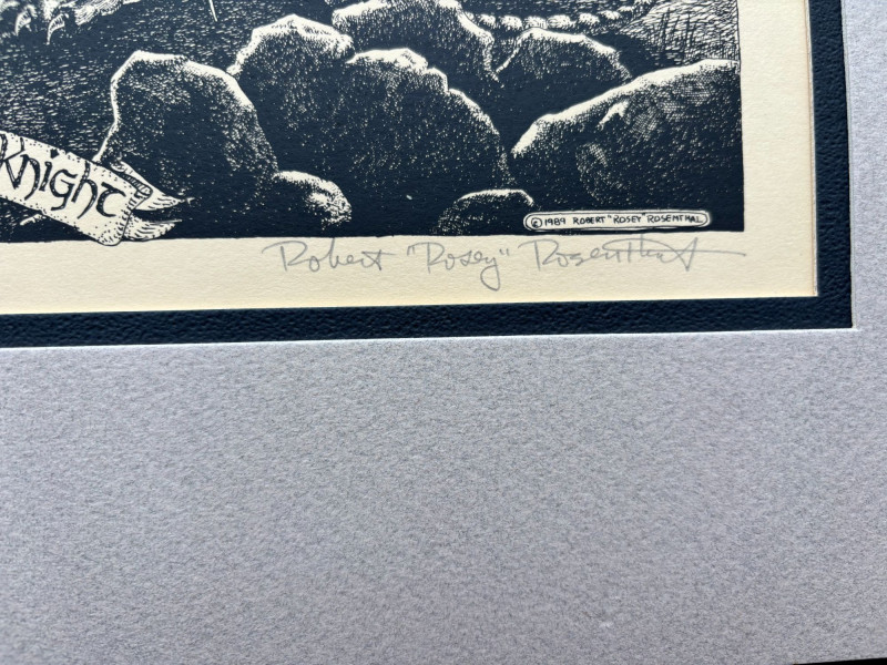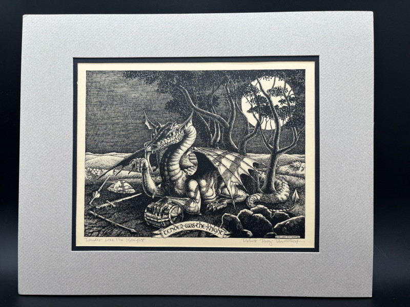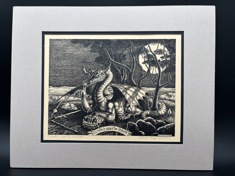 SHIPPABLE Striking black and white fantasy print titled “Tender Was the Knight” by listed artist Robert “Rosey” Rosenthal. This detailed work features a powerful dragon scene rendered in Rosenthal’s signature illustrative style, rich with texture and dramatic contrast. A fantastic piece for fantasy art collectors and fans of classic mythic imagery. Details: Title: Tender Was the Knight Artist: Robert “Rosey” Rosenthal Signed in pencil (lower margin) Black and white print Professionally matted Includes artist biography sheet Rosenthal earned his B.F.A. from Pratt Institute and exhibited widely in the U.S. and internationally. He was Printmaker-in-Residence in Granada, Spain, and is known for imaginative, story-driven works. Condition: A dramatic and collectible fantasy print ready for framing or display.