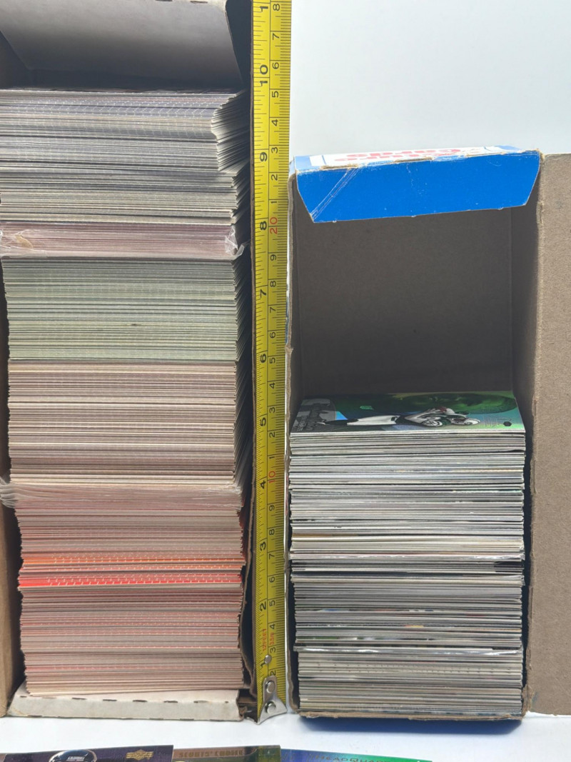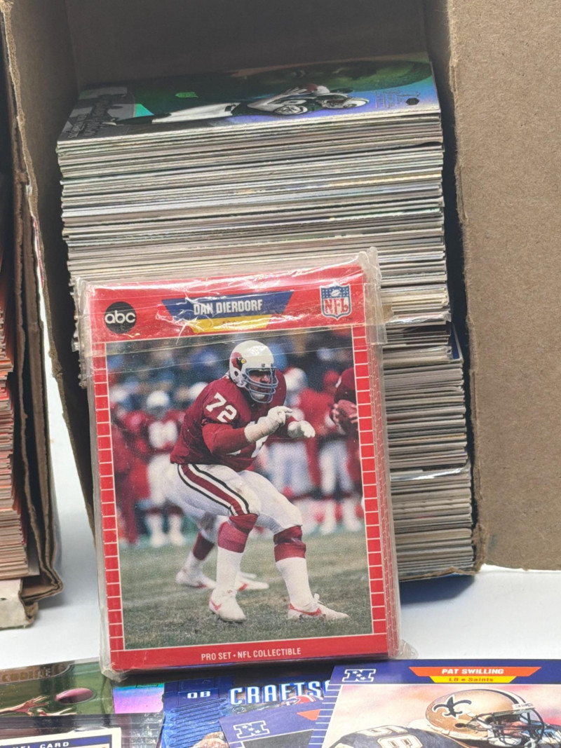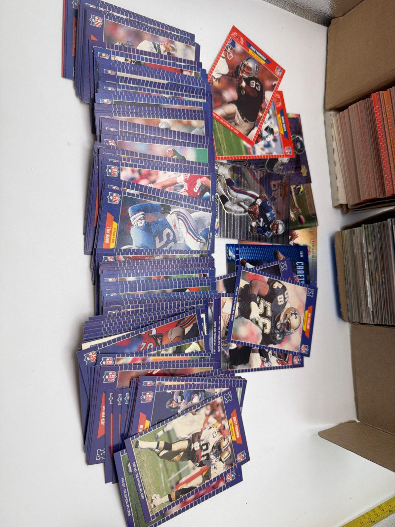 A substantial NFL football trading card lot stored in two long collector boxes with additional loose cards included. The boxes are filled with stacked football cards representing a mix of players, teams, and sets from various years. Several recognizable NFL players can be seen in the sample cards pictured. Lots like this are perfect for collectors, team builders, resellers, or hobbyists who enjoy sorting through large card collections looking for interesting finds. The cards are stored in two long boxes and appear to represent a large volume of football trading cards. Boxes measure roughly about 12 inches tall when stacked, giving an idea of the overall quantity included. Bulk card lots like this are ideal for sorting, organizing into sets, trading, or building a personal collection. With Easter approaching, sports cards can also make fun additions to Easter baskets, egg hunt prizes, or gifts for young collectors. Please review photos carefully to see the approximate quantity and the exact cards included. Cards appear to be in mixed pre-owned condition, typical of stored collections. Some cards may show handling or storage wear. Please review the photos for details. Shipping available. Combined shipping is offered for multiple auction wins whenever possible. Football trading cards remain one of the most popular sports collectibles. Bulk collections like this often attract collectors who enjoy sorting cards, completing sets, trading duplicates, and searching for standout players or rookie cards.